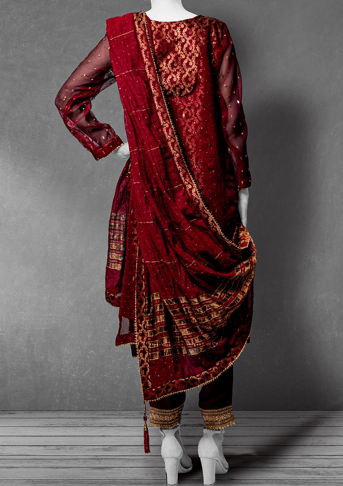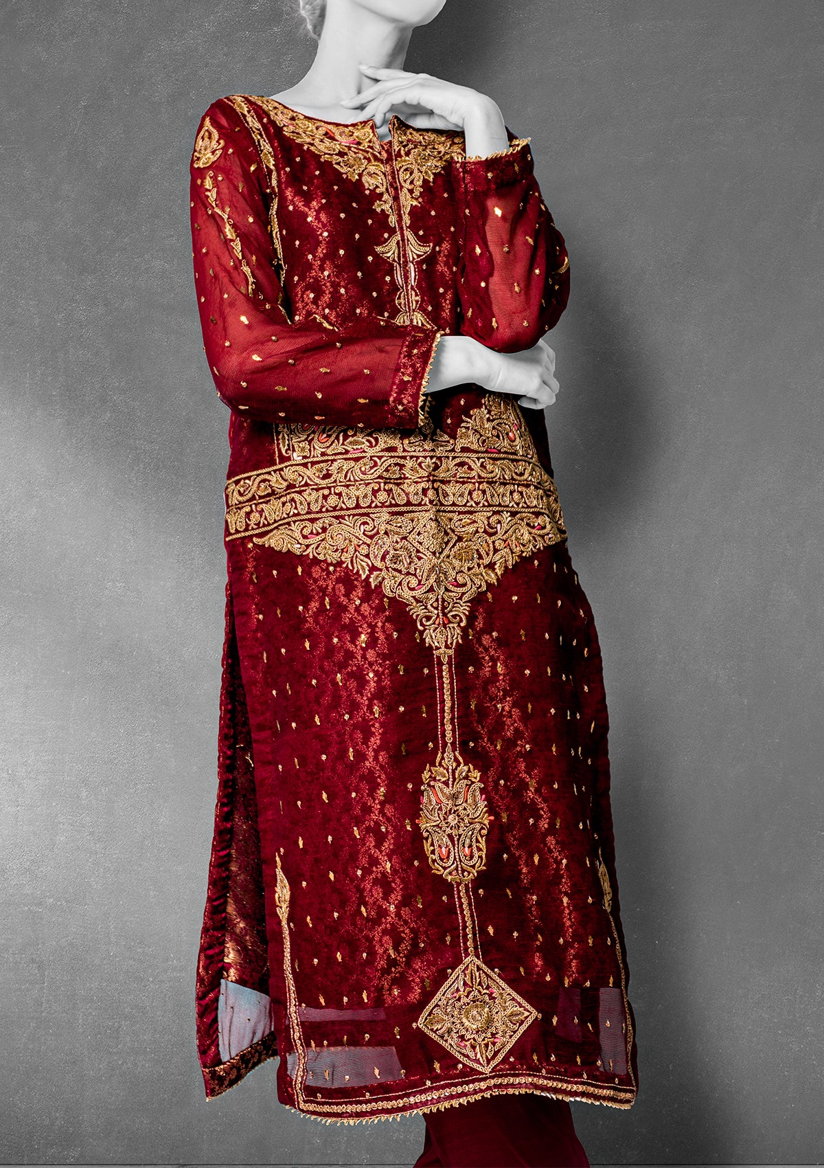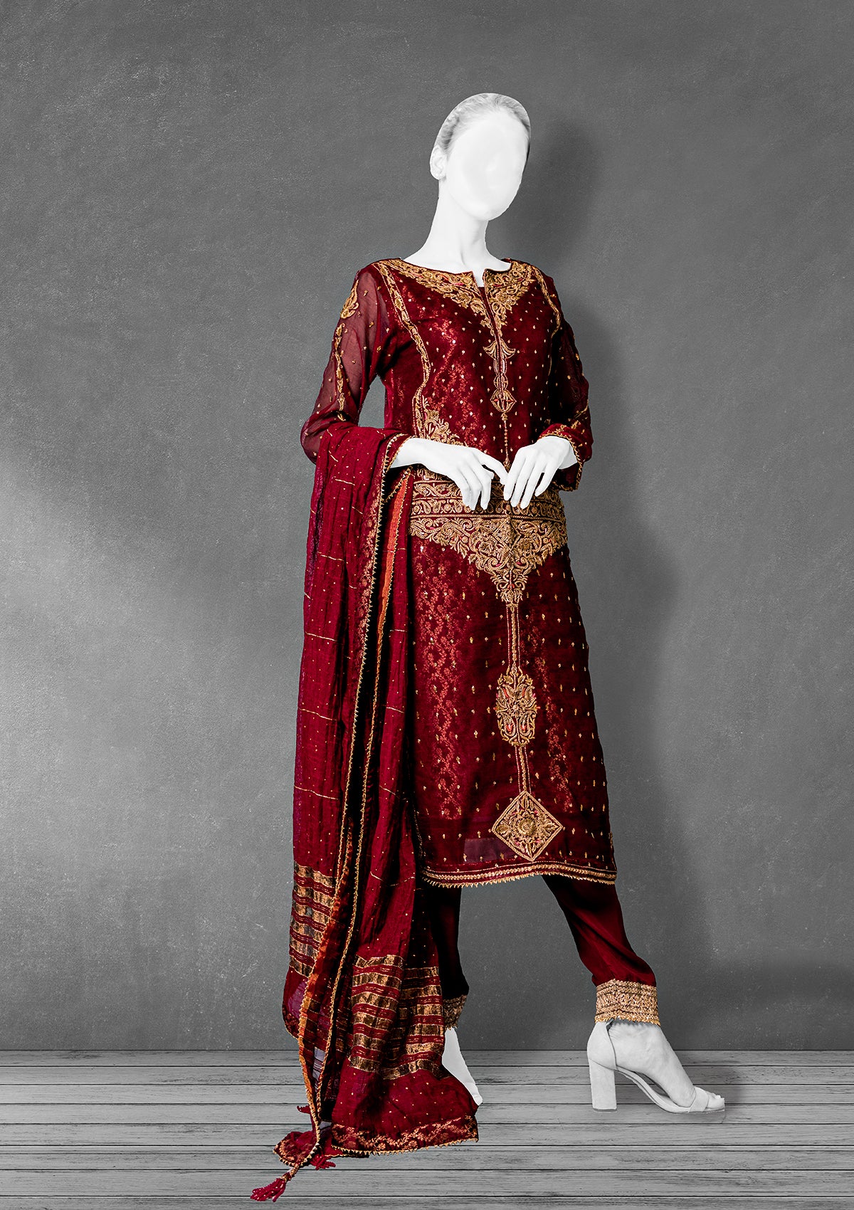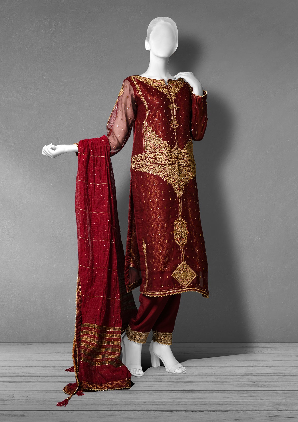 Straight Shirt with Cigarette Pants and Khaddi Net Dupatta. Banarsi lining, embellished with hand marori technique, finished with gold gotta lace on the shirt and pants hem. Dupatta completed with embellishments of sequins and finished with banarsi fabric and lace and tassels on corners of the dupatta.