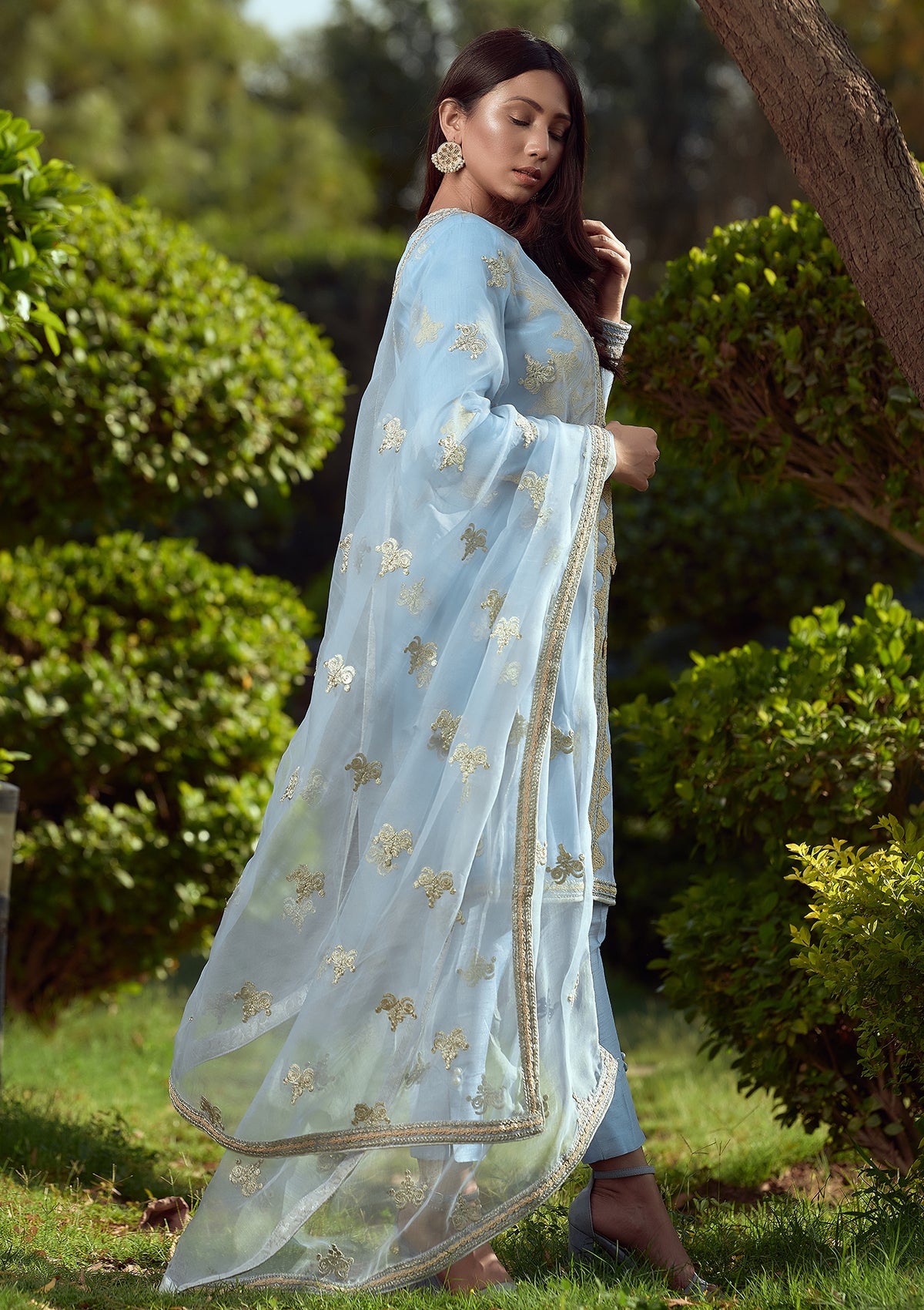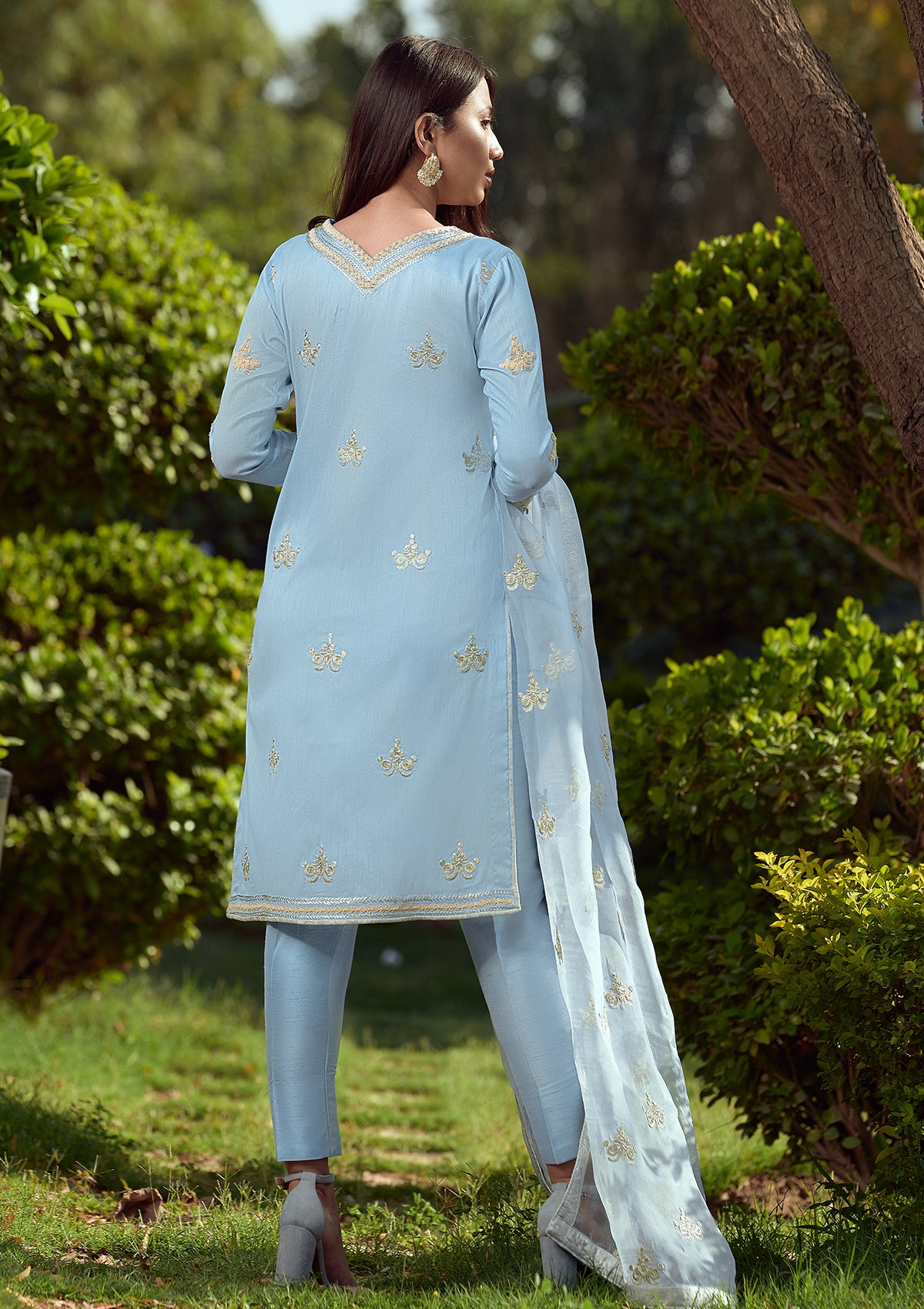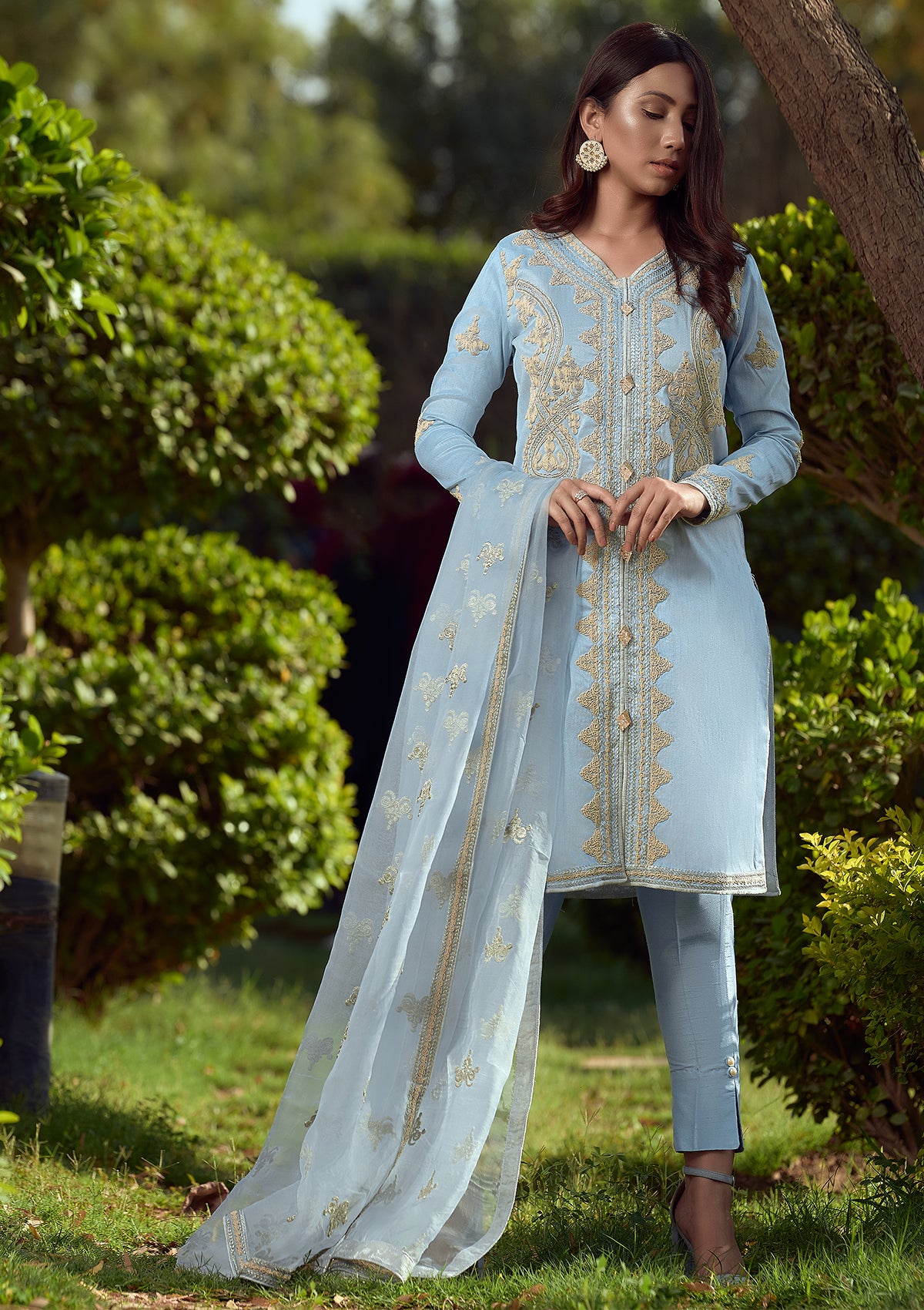 The cool and refreshing ice blue color combined with the silver intricate work on this luxury Indian raw silk will leave fellow family and friends in admiration of this outfit. The front open shirt is styled with straight cigarette pants and decorated with loops and pearls giving it a royal feel. The luxury of the shirt is elevated with silver zari and dori work which is topped off with a v-shaped neckline both on the front and back. Perfected with an organza dupatta with borders on all 4 sides.