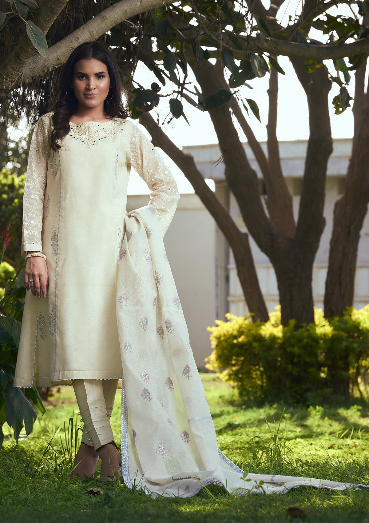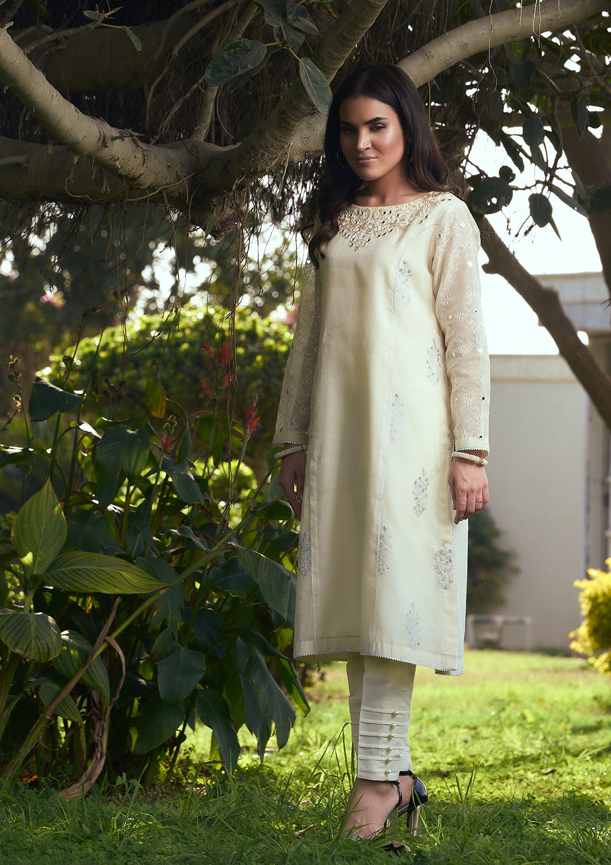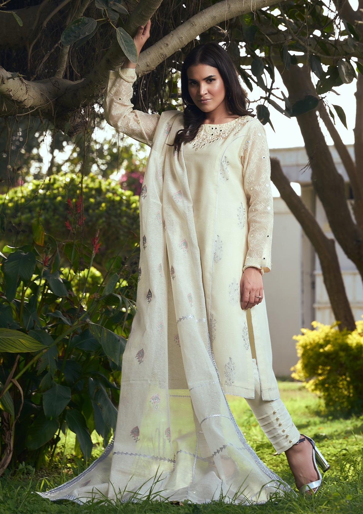 Luxury in the form of simplicity and elegance; a neutral ivory color outfit with a graceful design. The traditional straight long box cotton kurta has hints of silver sequins and mirror work. The sophisticated shirt is paired with raw silk cigarette pants with pearls on the hem. Refined and adorned with cotton karandi gotta lace dupatta giving you a regal look for your party wears.