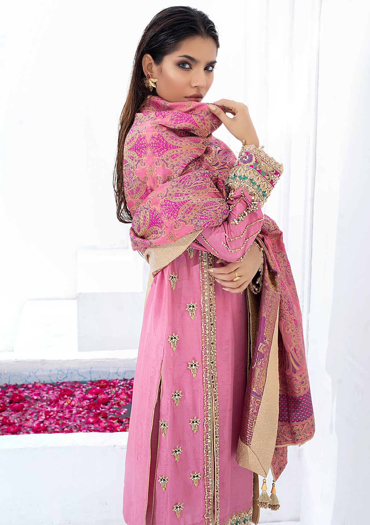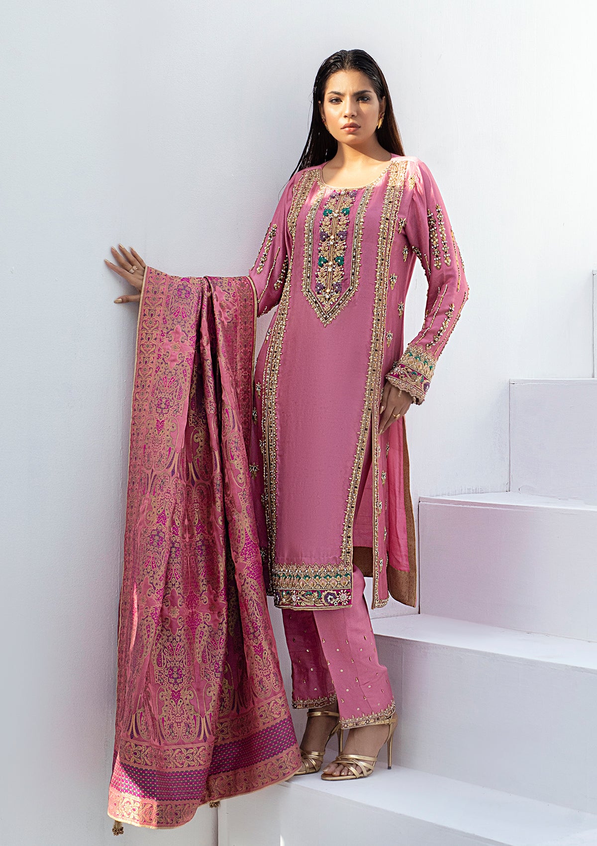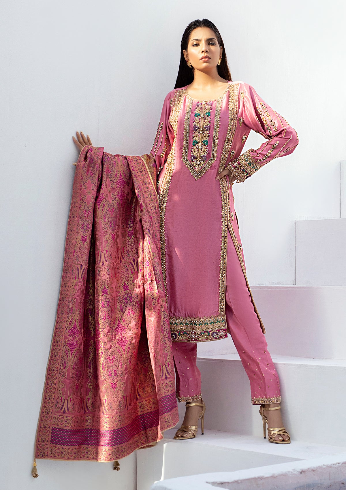 A striking rose pink that roars extravagance and richness. Fused with a western cut, the long shirt is adorned in a golden chain, resham, beads, and stones work. Beautifully paired with raw silk cigarette pants that are lightly decorated on the hem. The highlight is the brocade/banarsi embellished dupatta which is sophisticatedly aligned with the dress.