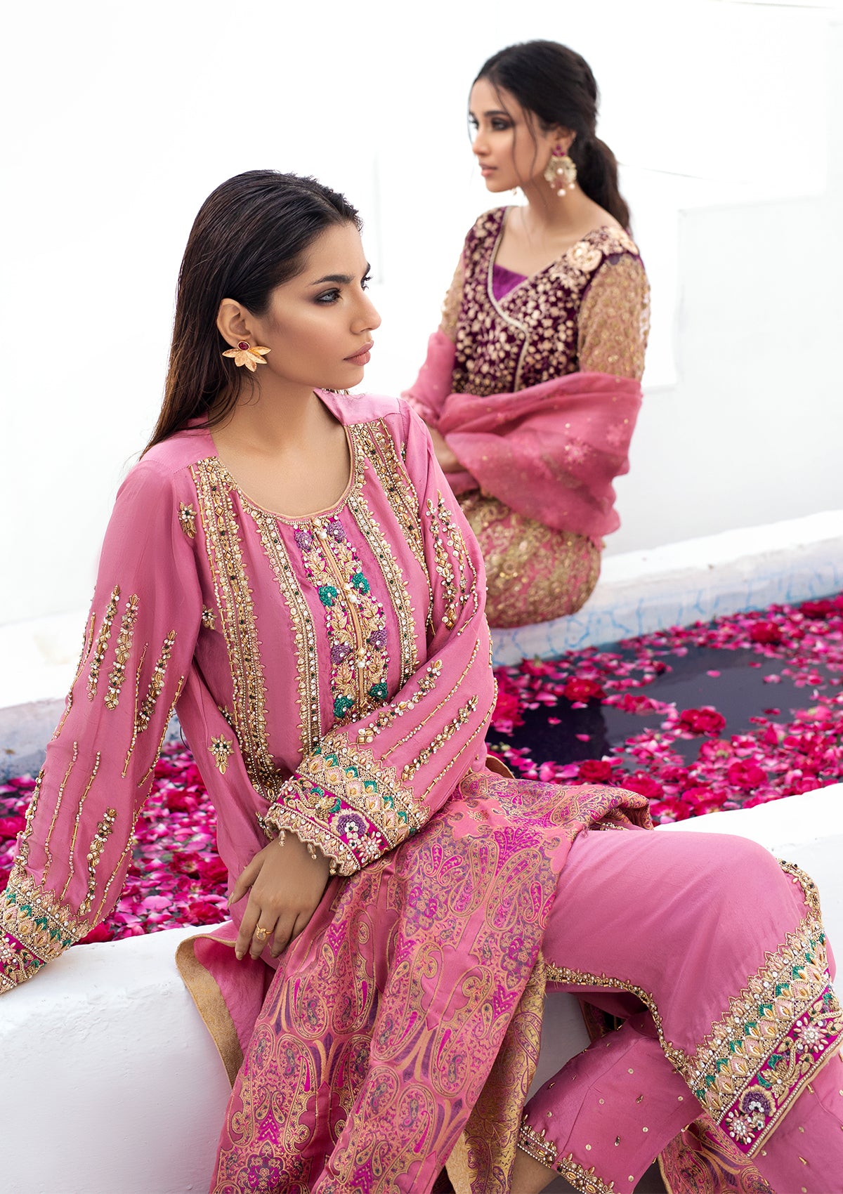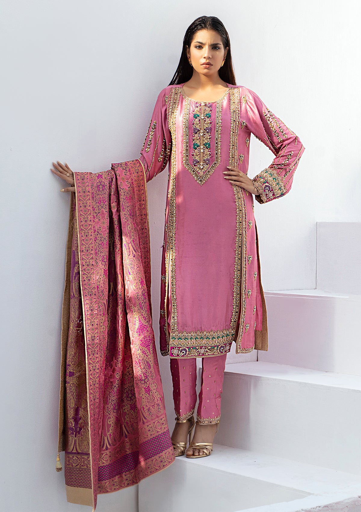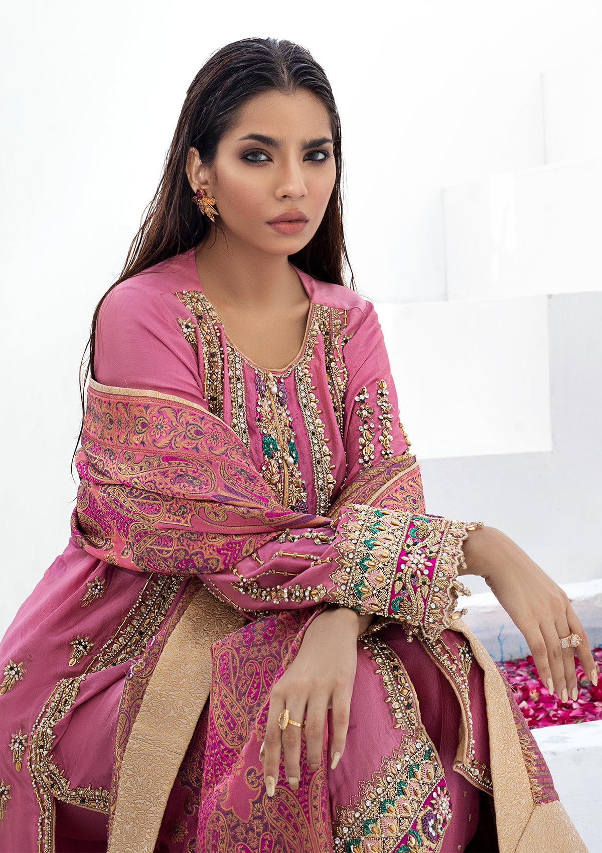 A striking rose pink that roars extravagance and richness. Fused with a western cut, the long shirt is adorned in a golden chain, resham, beads, and stones work. Beautifully paired with raw silk cigarette pants that are lightly decorated on the hem. The highlight is the brocade/banarsi embellished dupatta which is sophisticatedly aligned with the dress.