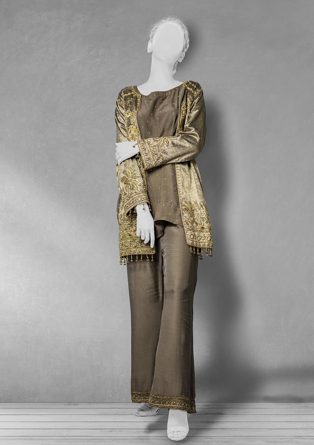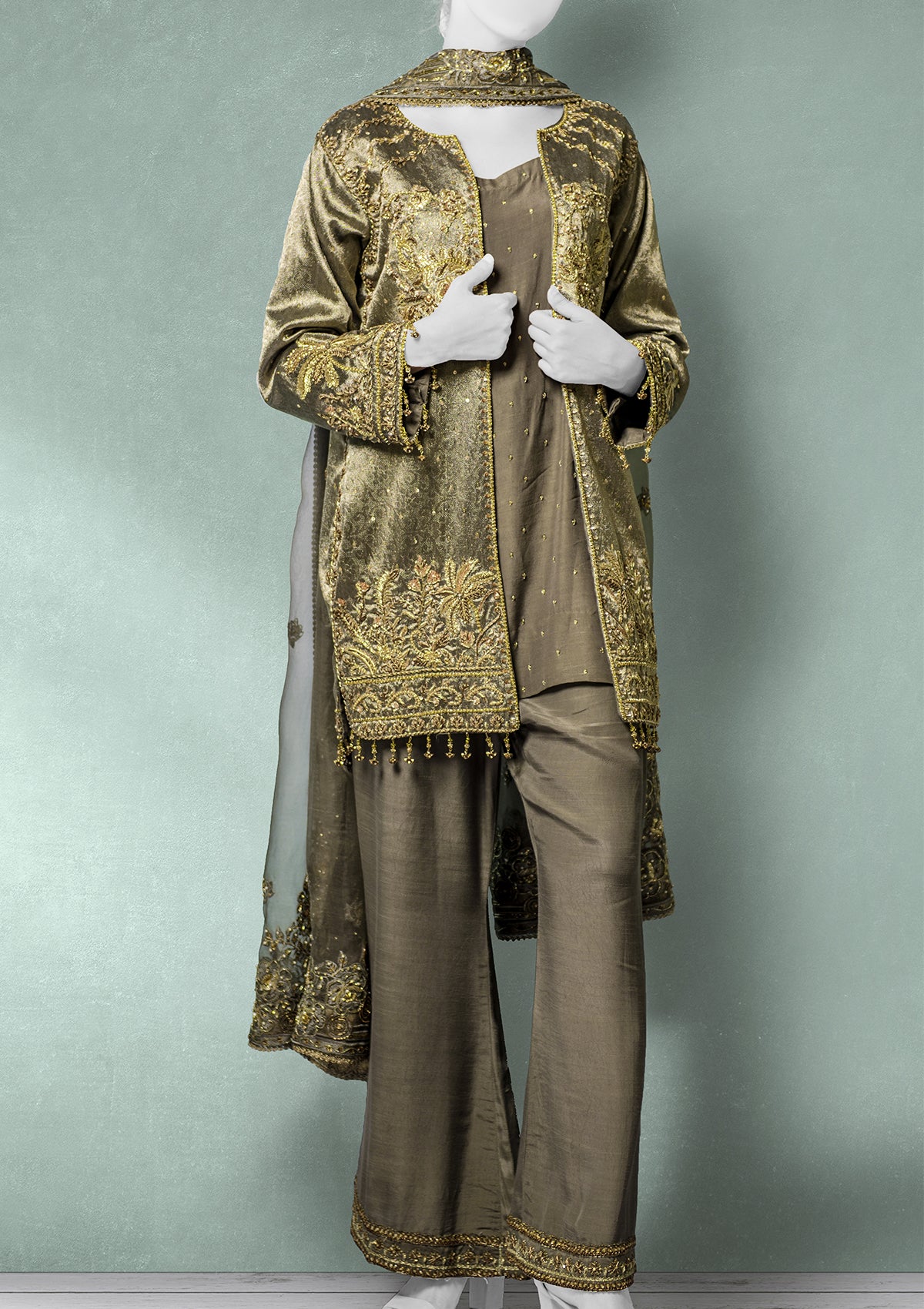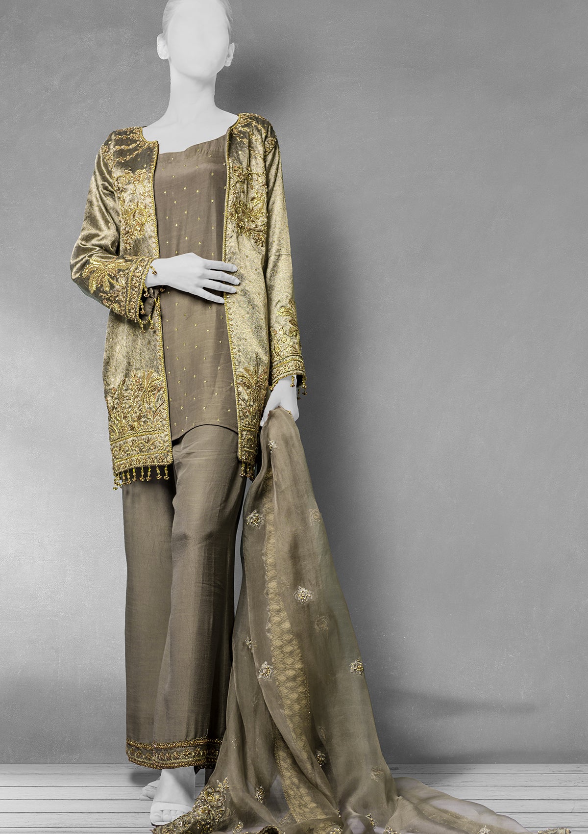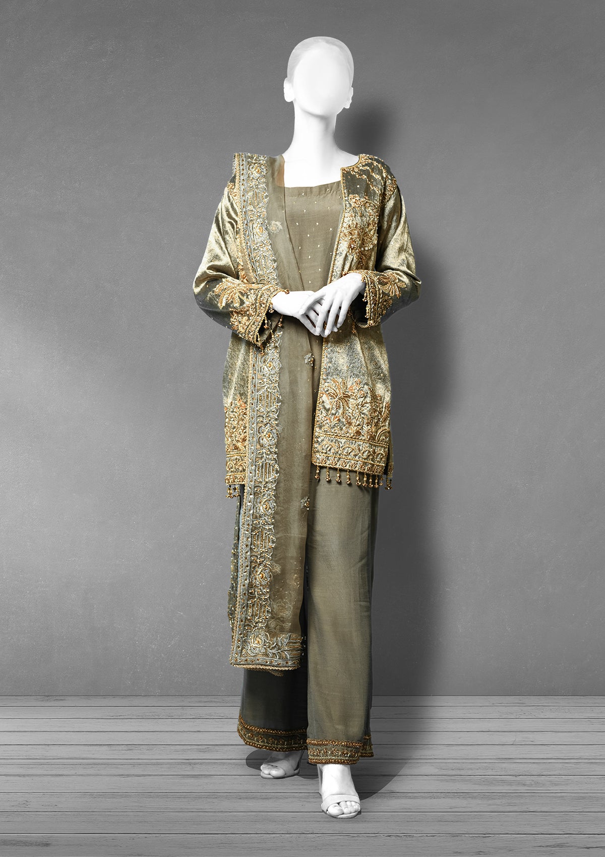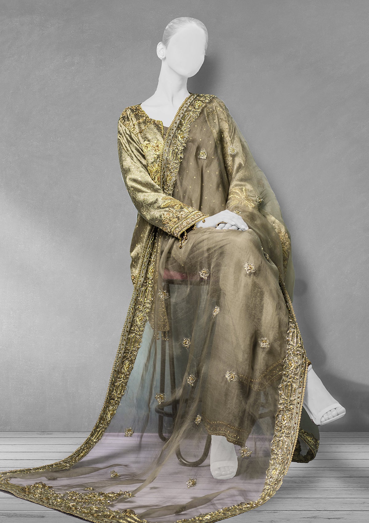 Front open coat style with golden embroidery on the shirt and pants hem. Hand embroidery featuring tikki stones, golden tikki, antique nakshi, antique dabka, golden nakshi, pearls, golden katori, katdana moti and sequence on the shirt and pants hem. Dupatta completed on kora, dabka, nakshi, tikki stones work.