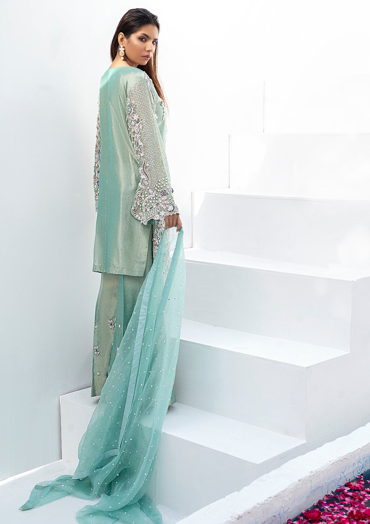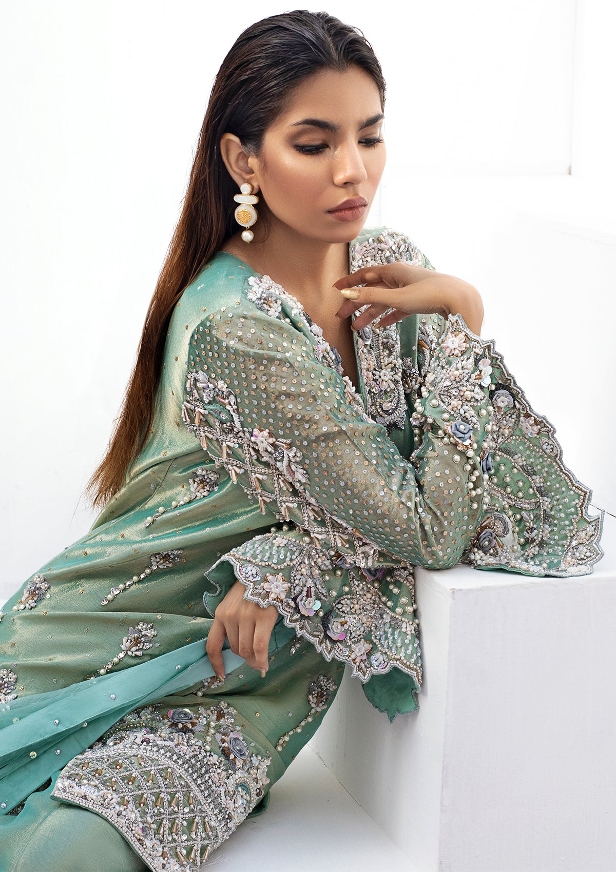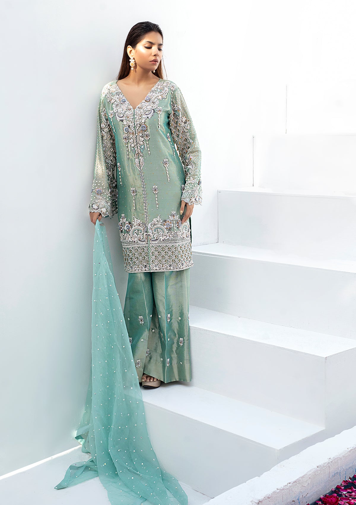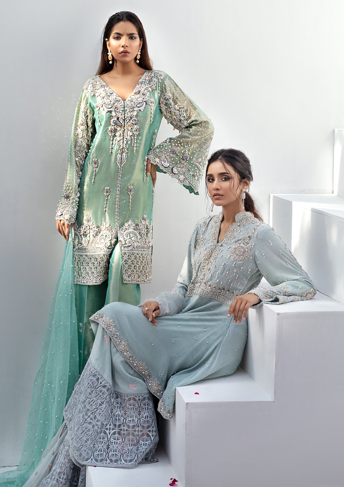 A turquoise color on lameh fabric will make you stand out at a party. The peplum-style shirt is profoundly encrusted with crystals, pulse, beads, sequins, and pipes handwork and is a perfect blend of contemporary style with a twist. Elegantly paired with flared pants with frills on the hem. Topping it off with a hand-embellished crystal drops organza dupatta.