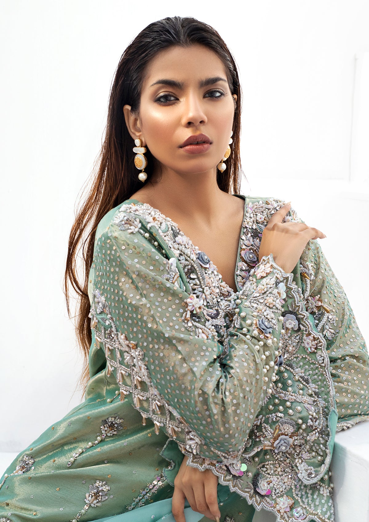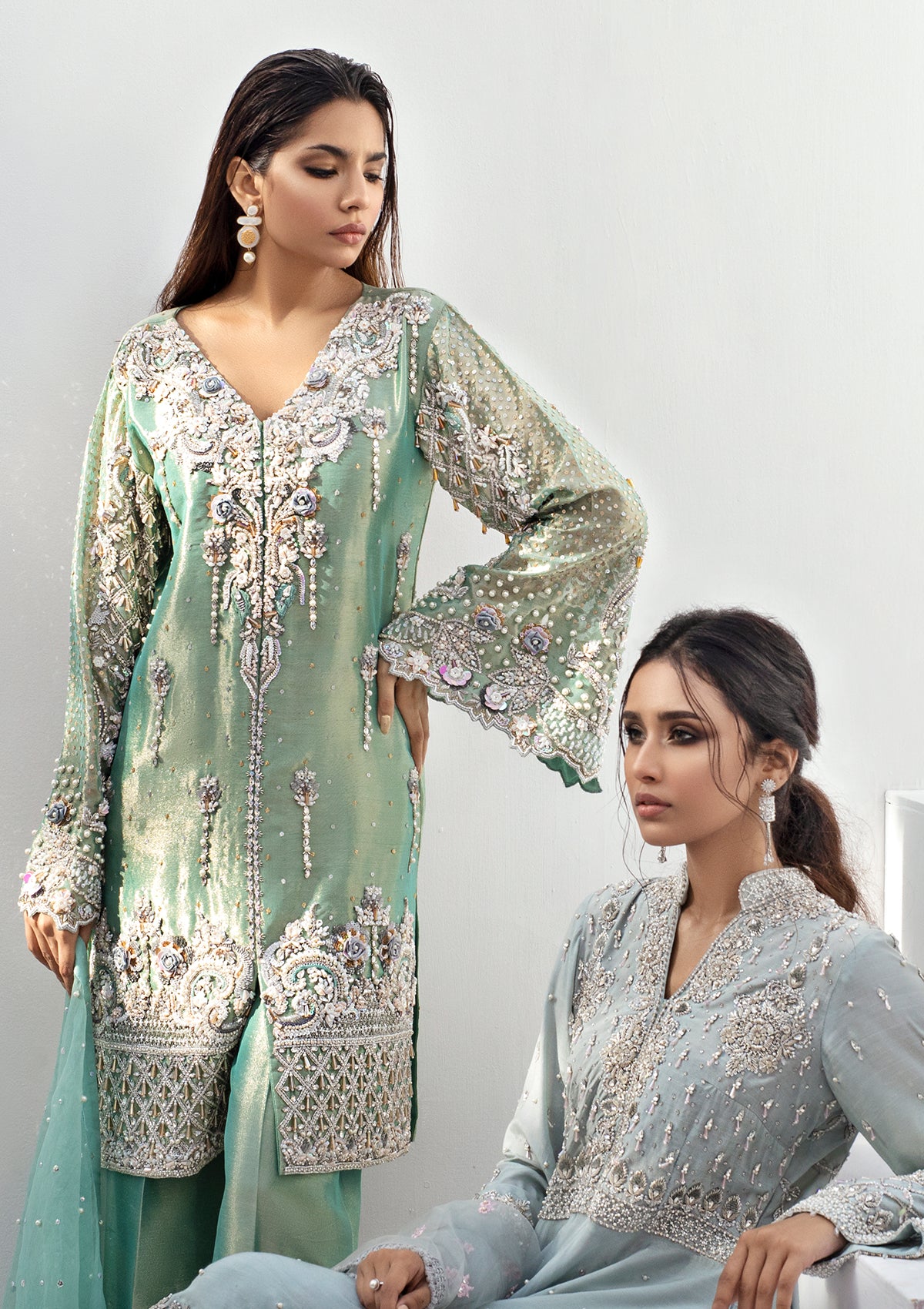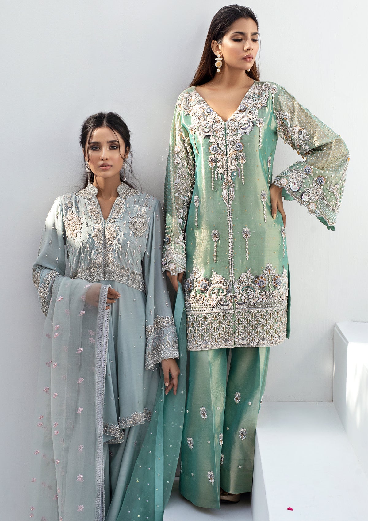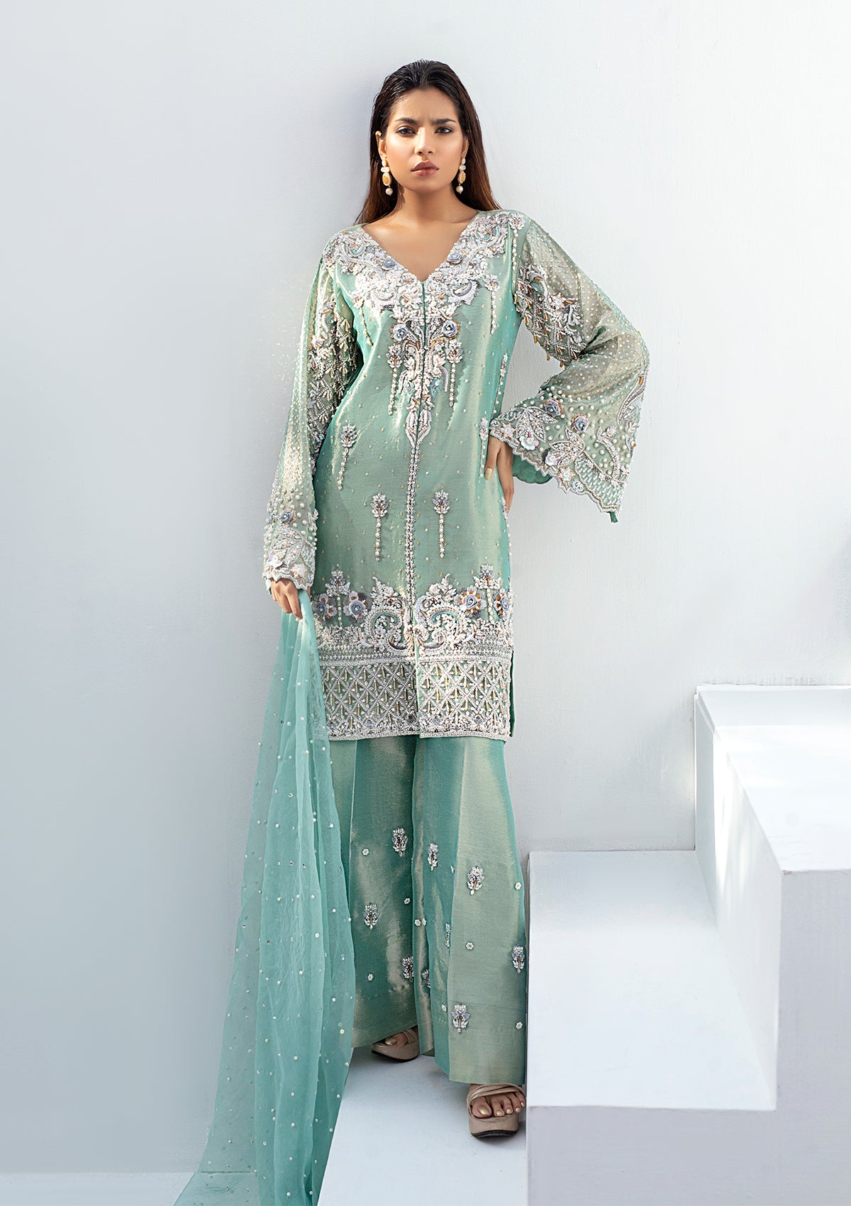 A turquoise color on lameh fabric will make you stand out at a party. The peplum-style shirt is profoundly encrusted with crystals, pulse, beads, sequins, and pipes handwork and is a perfect blend of contemporary style with a twist. Elegantly paired with flared pants with frills on the hem. Topping it off with a hand-embellished crystal drops organza dupatta.