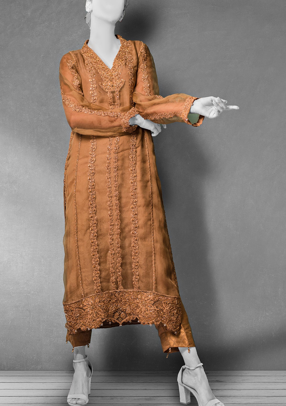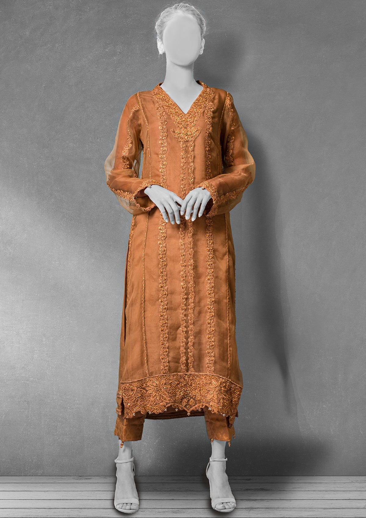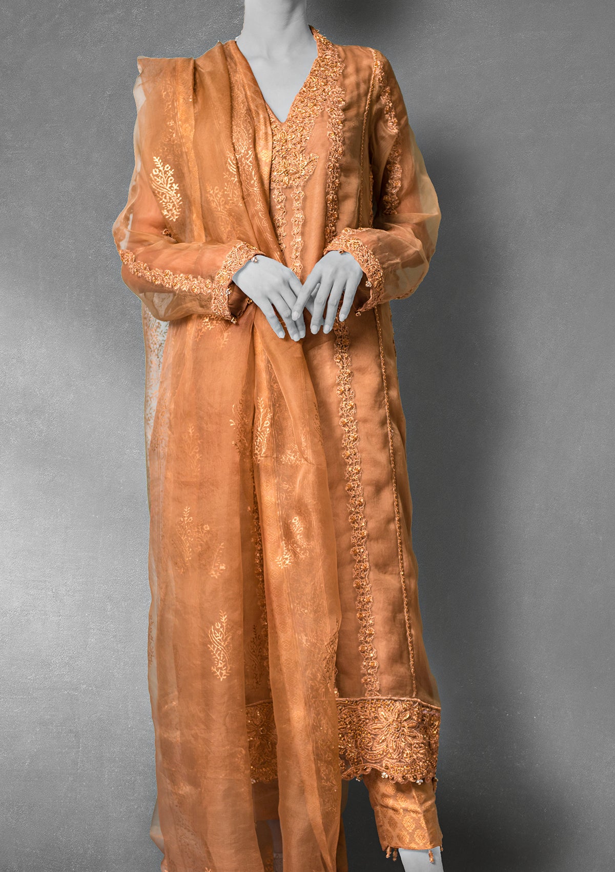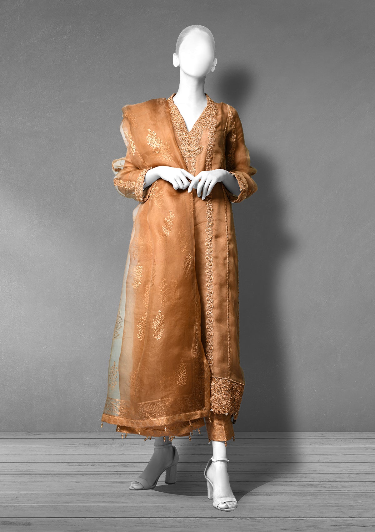 Straight Shirt with gold with machine embroidery and hand-embellished stones and tassel finishing. Dupatta with block printing, finished with banarsi fabric and tassels.
