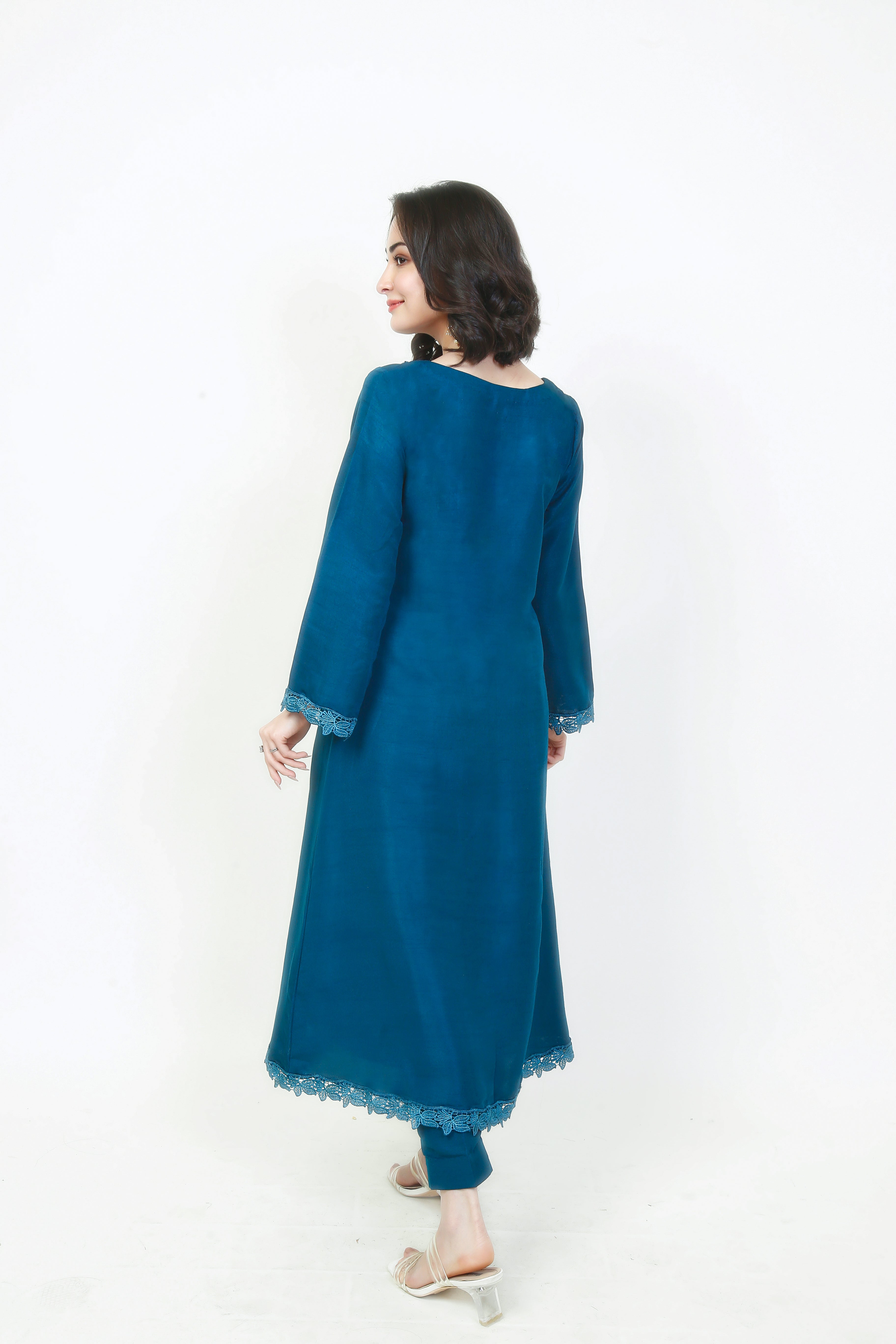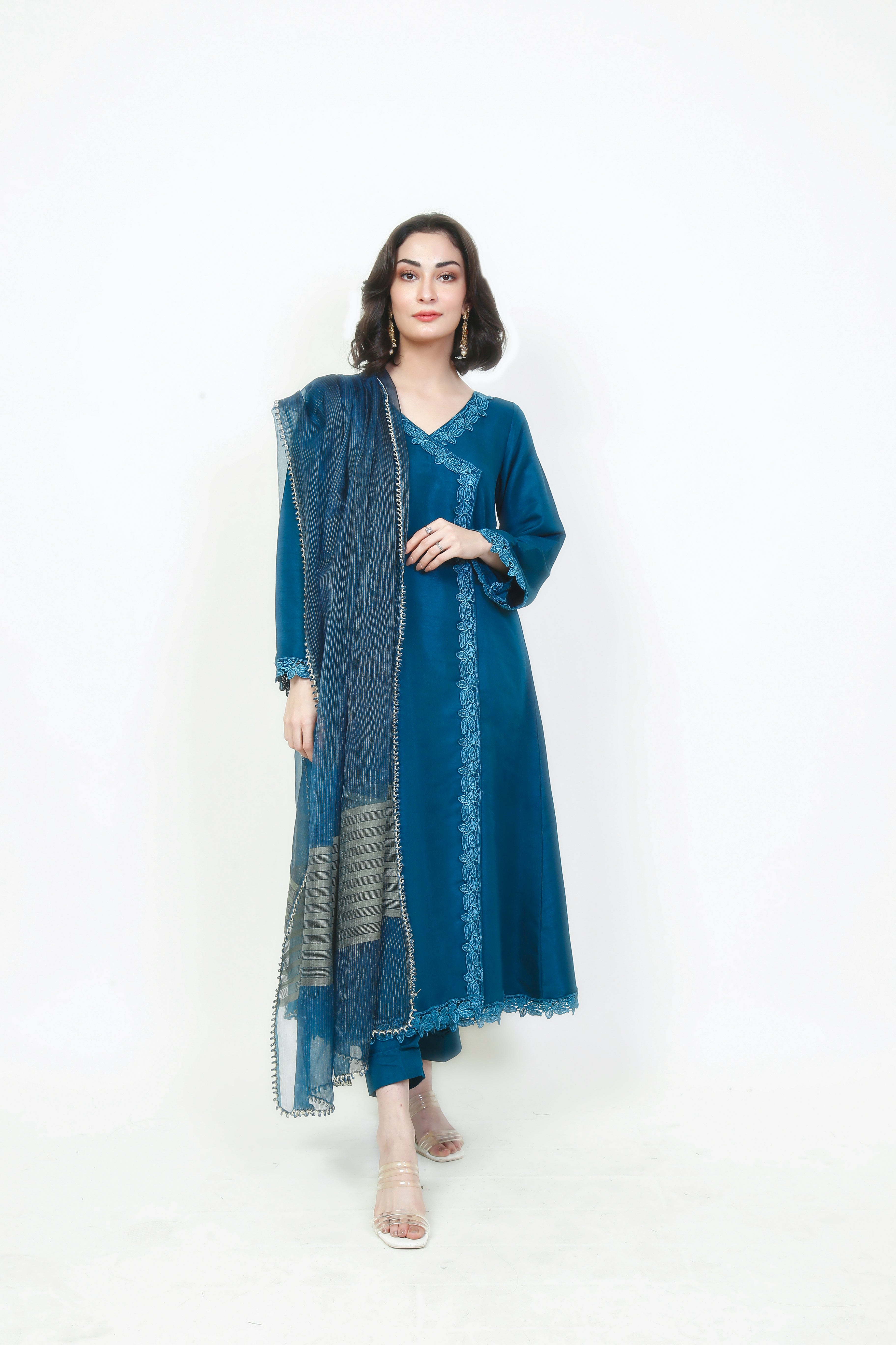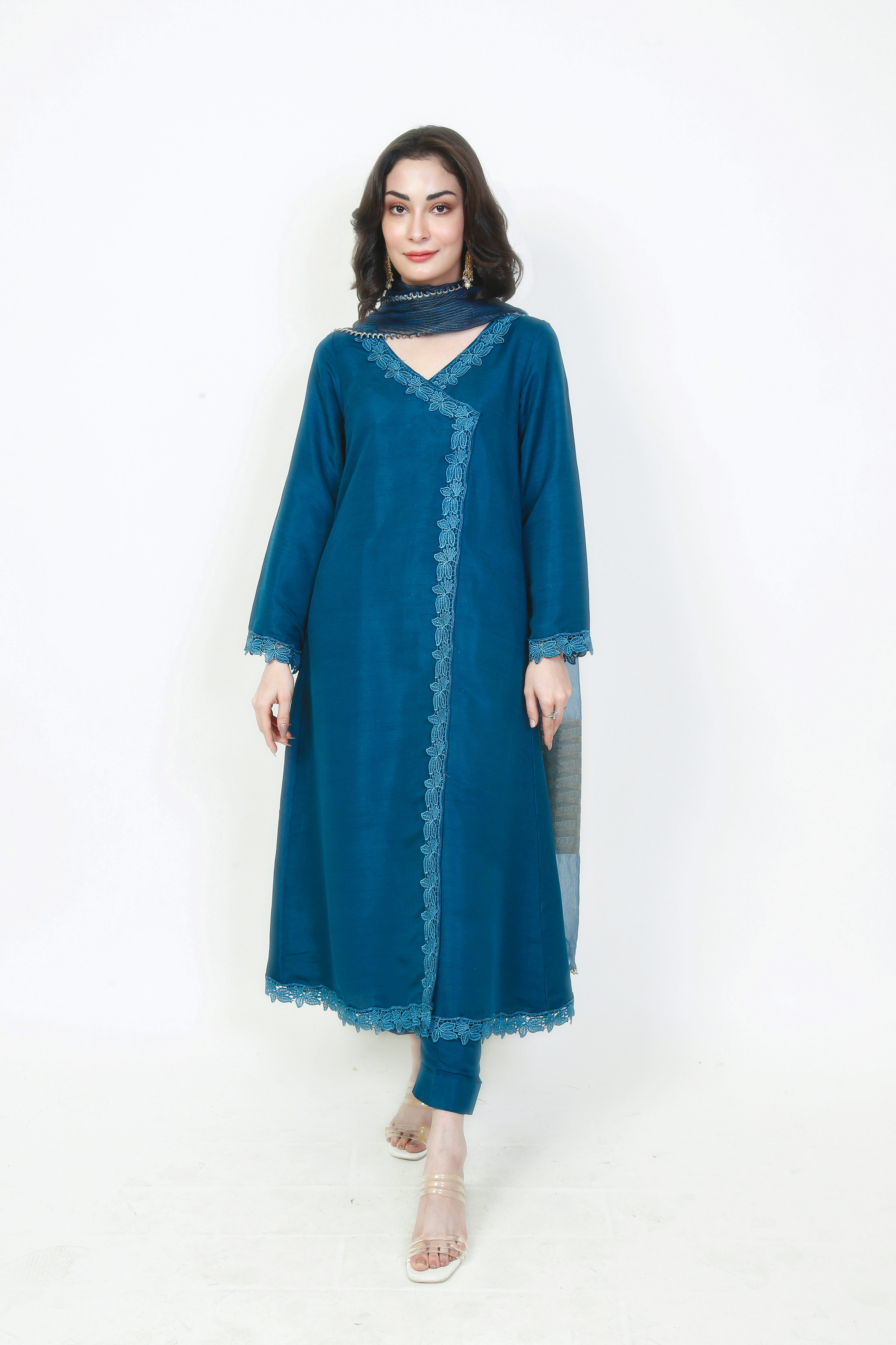An angrakha style long shirt paired with floral laces running through the shirt from the bodice to the bottom and then over the hem. A solid dark turquoise captivates the imagination when paired with matching straight-leg trousers and finished with a beautiful blue dupatta with shades of silver gold linings near the edges.