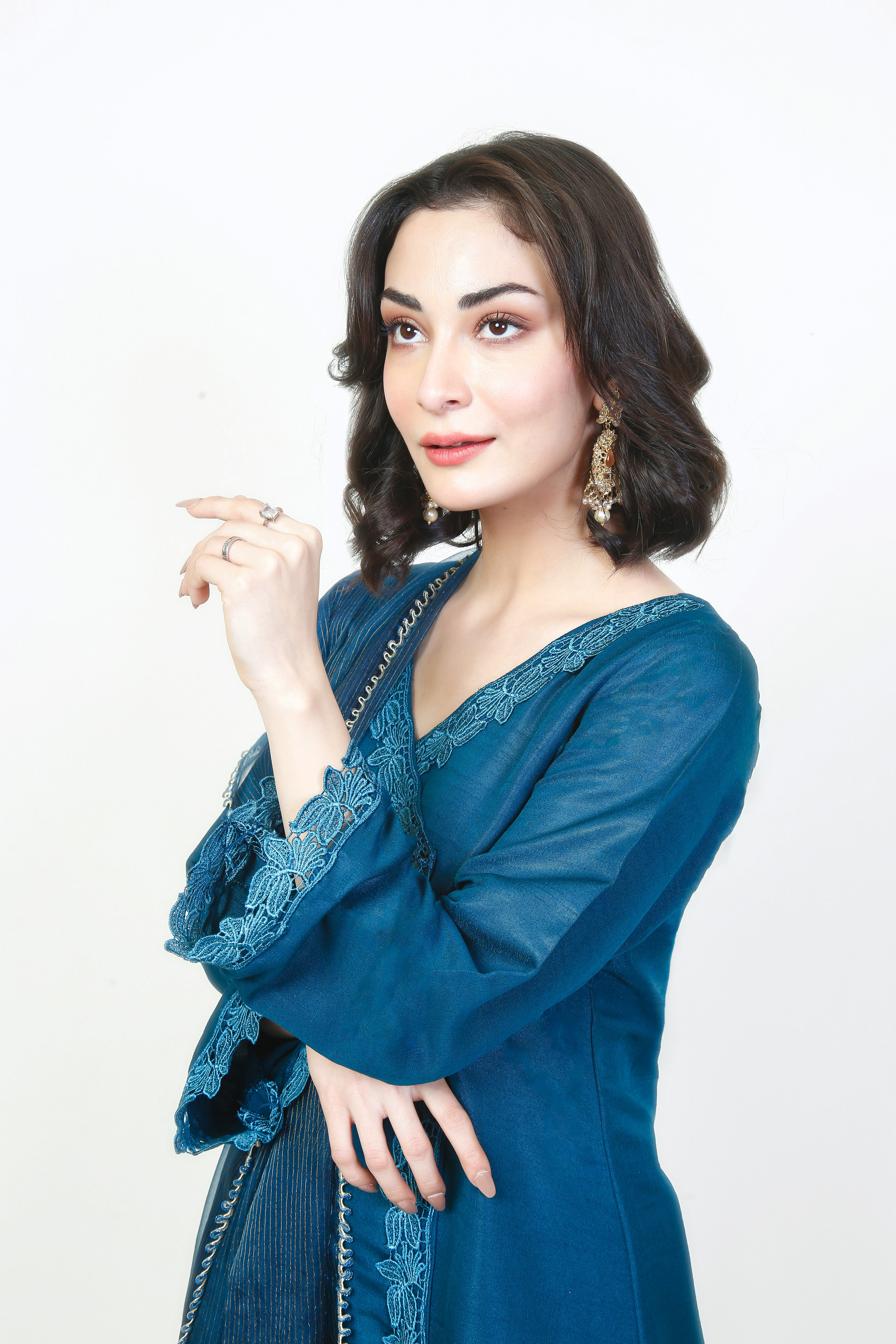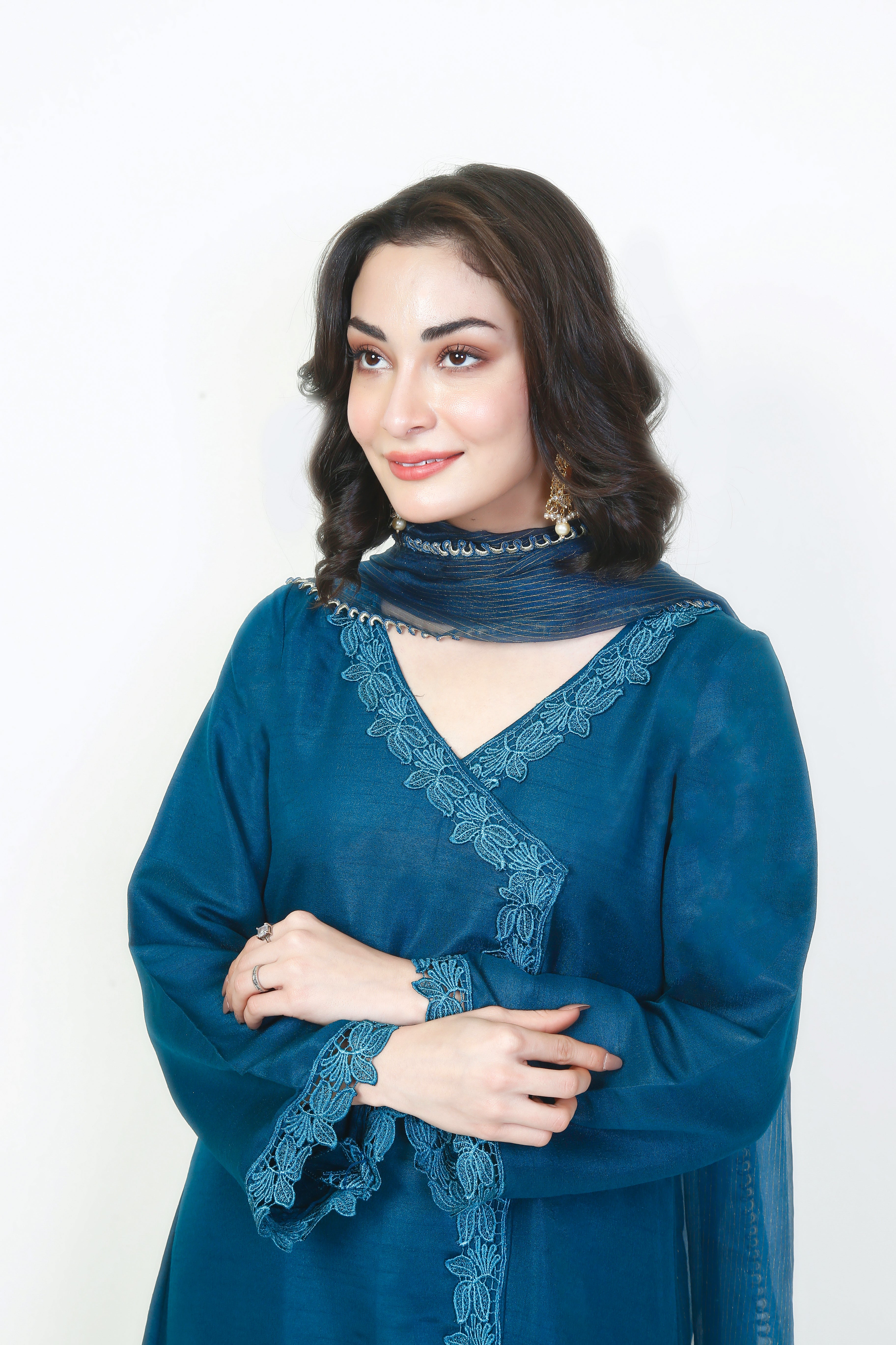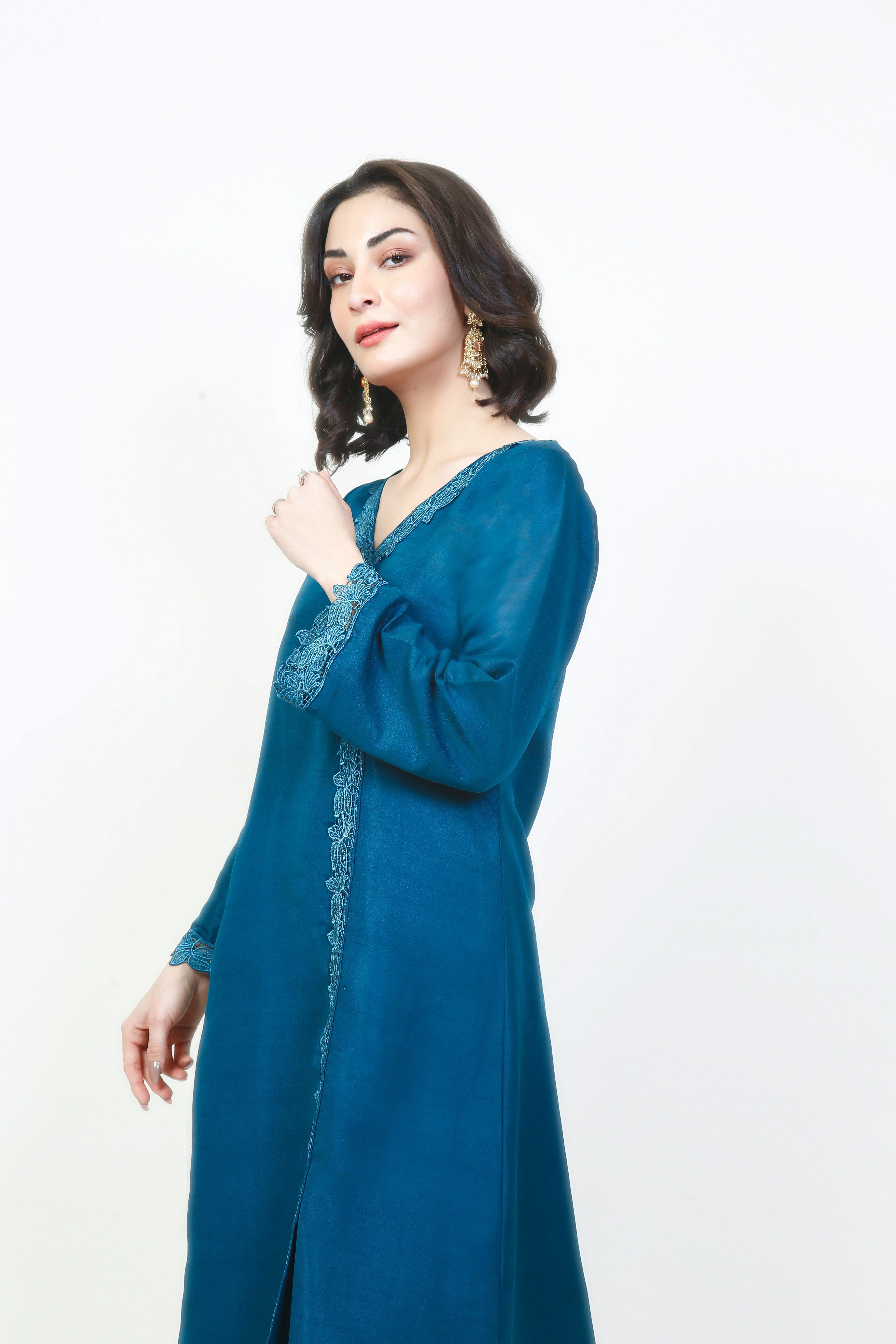 An angrakha style long shirt paired with floral laces running through the shirt from the bodice to the bottom and then over the hem. A solid dark turquoise captivates the imagination when paired with matching straight-leg trousers and finished with a beautiful blue dupatta with shades of silver gold linings near the edges.