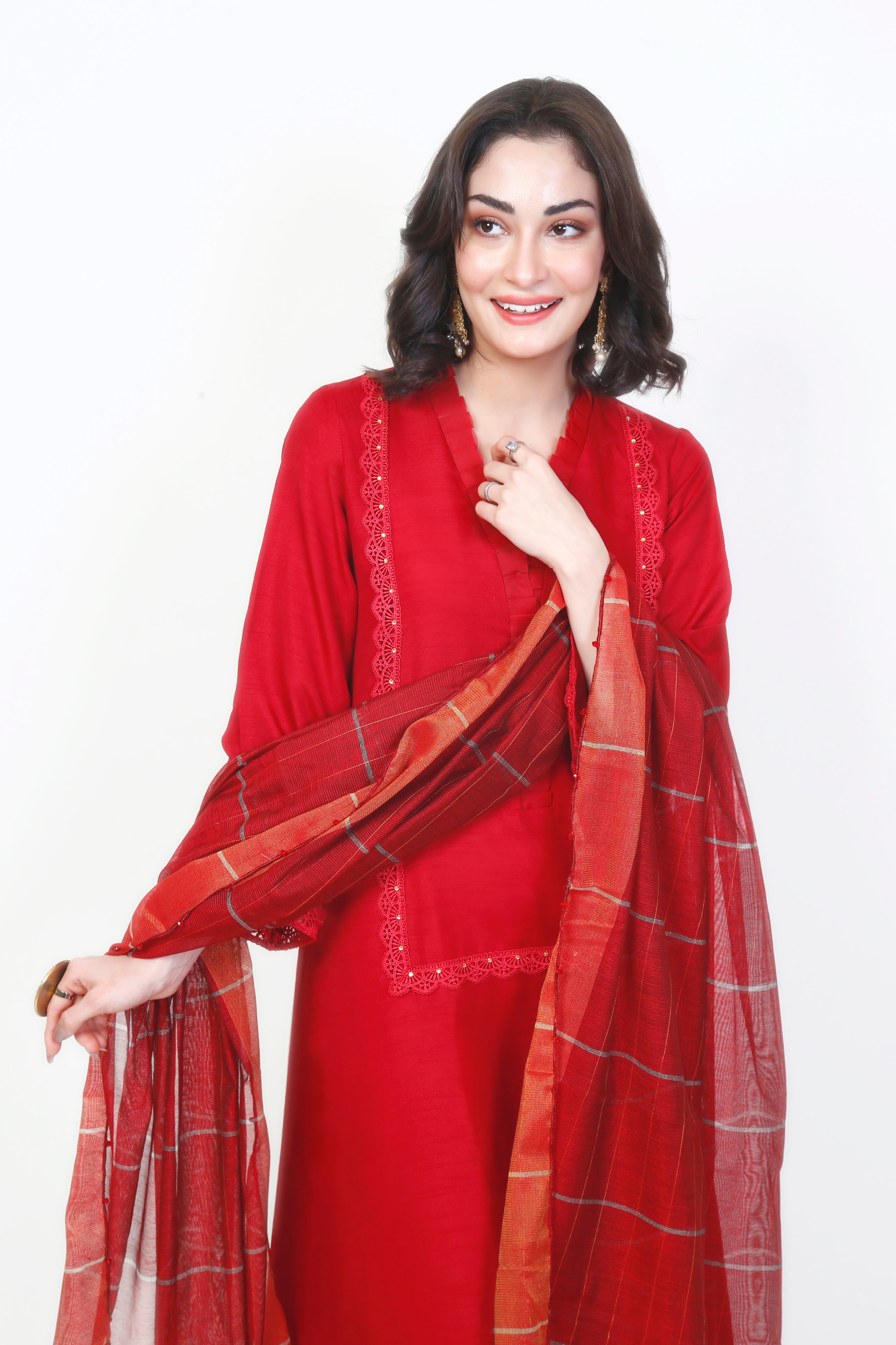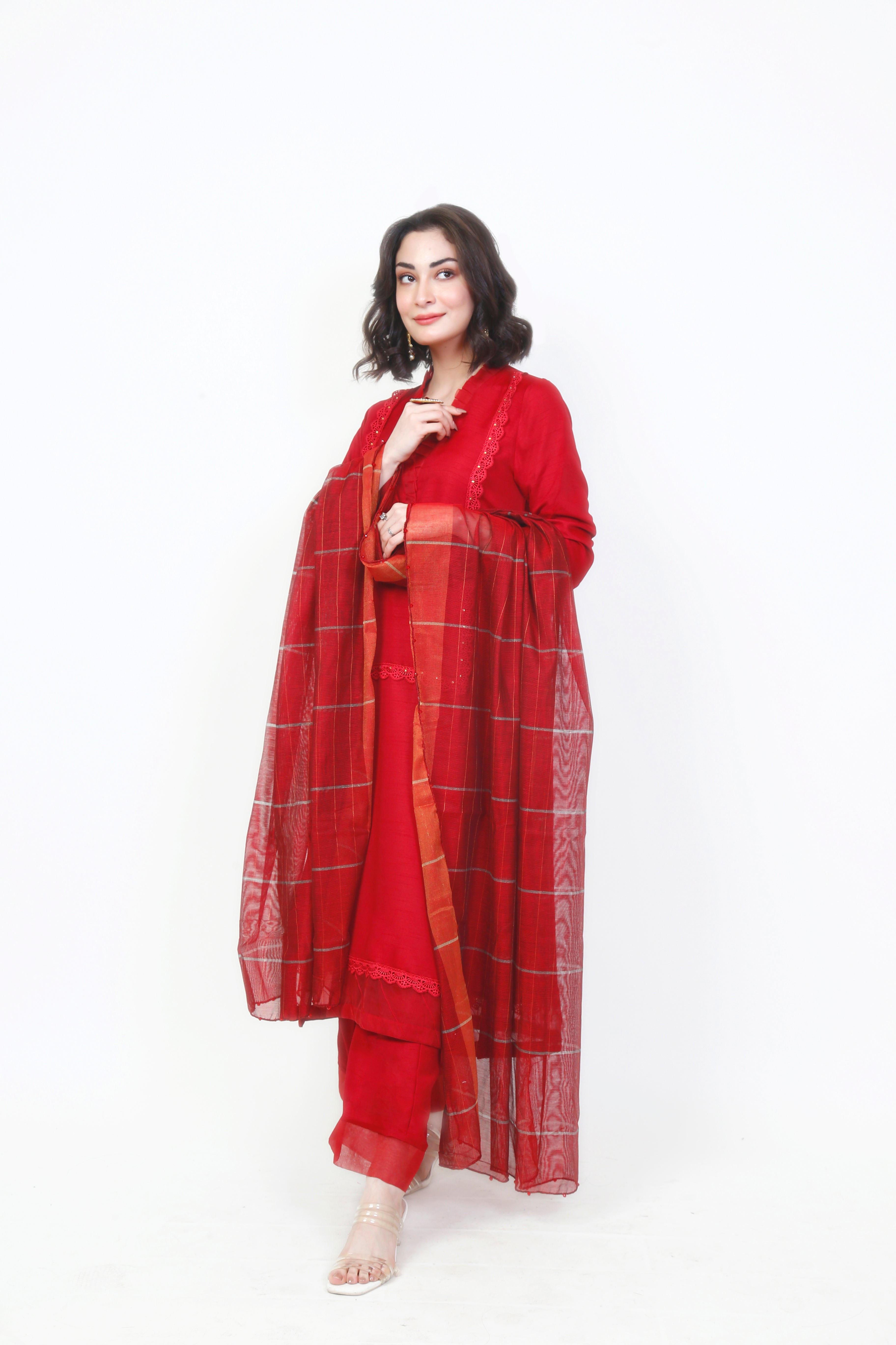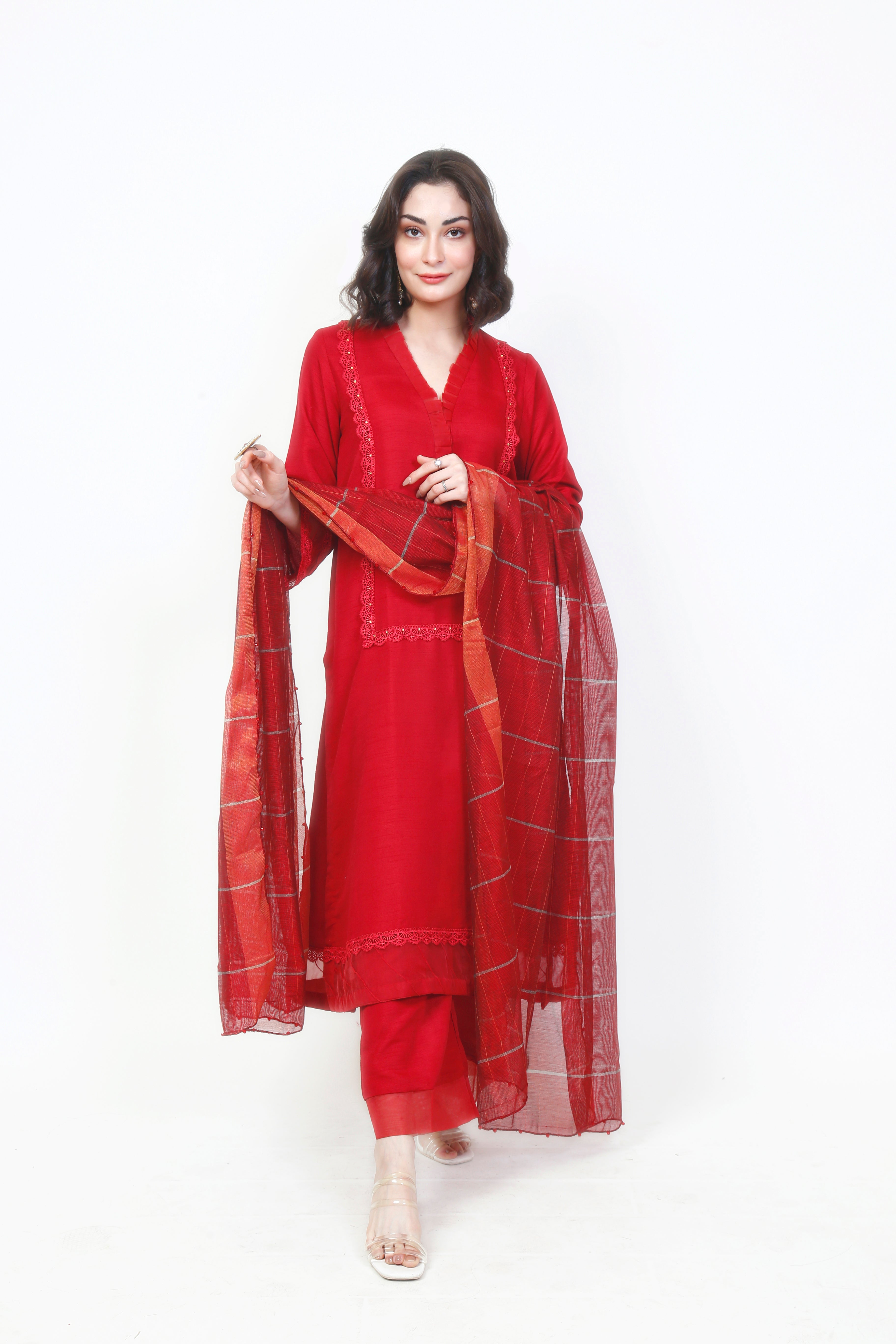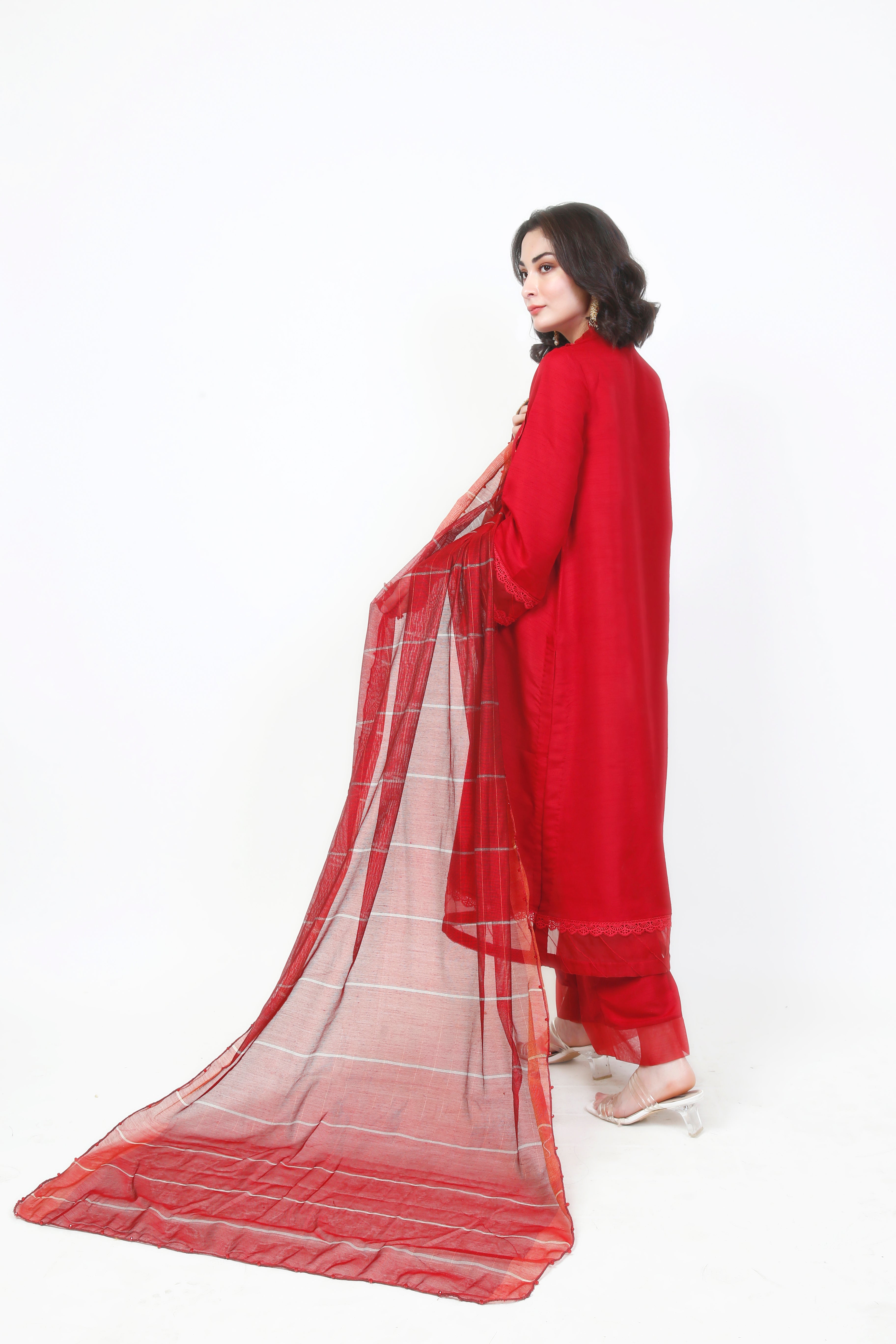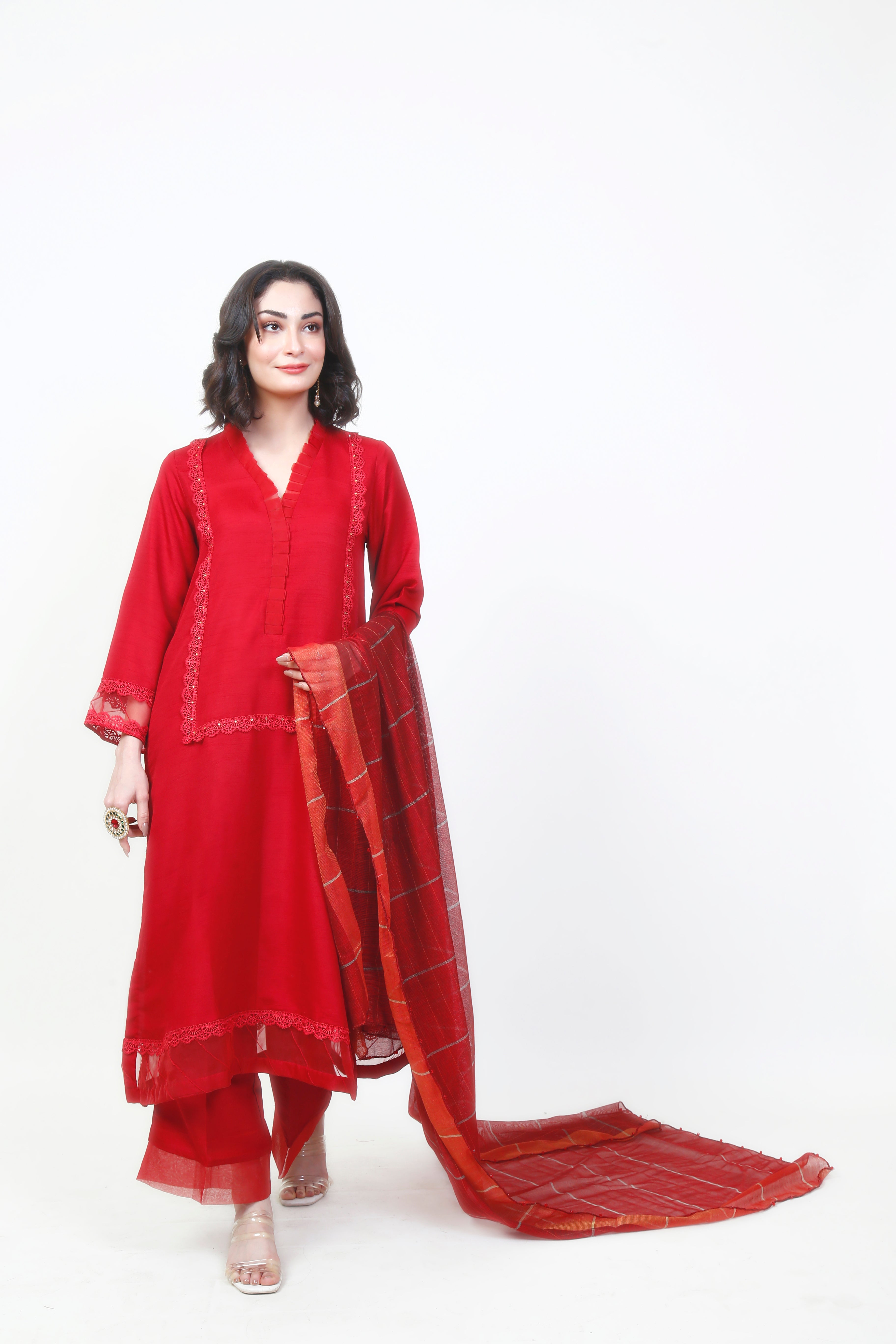A classic bloody red perfect for any occasion. The solid bloody red shirt is an A-line cut with minimal red rectangle laces. The sleeves are flawlessly gradient to a transparent finish. The plain red trousers are paired with a silver-lined red dupatta that is embellished on the edges.