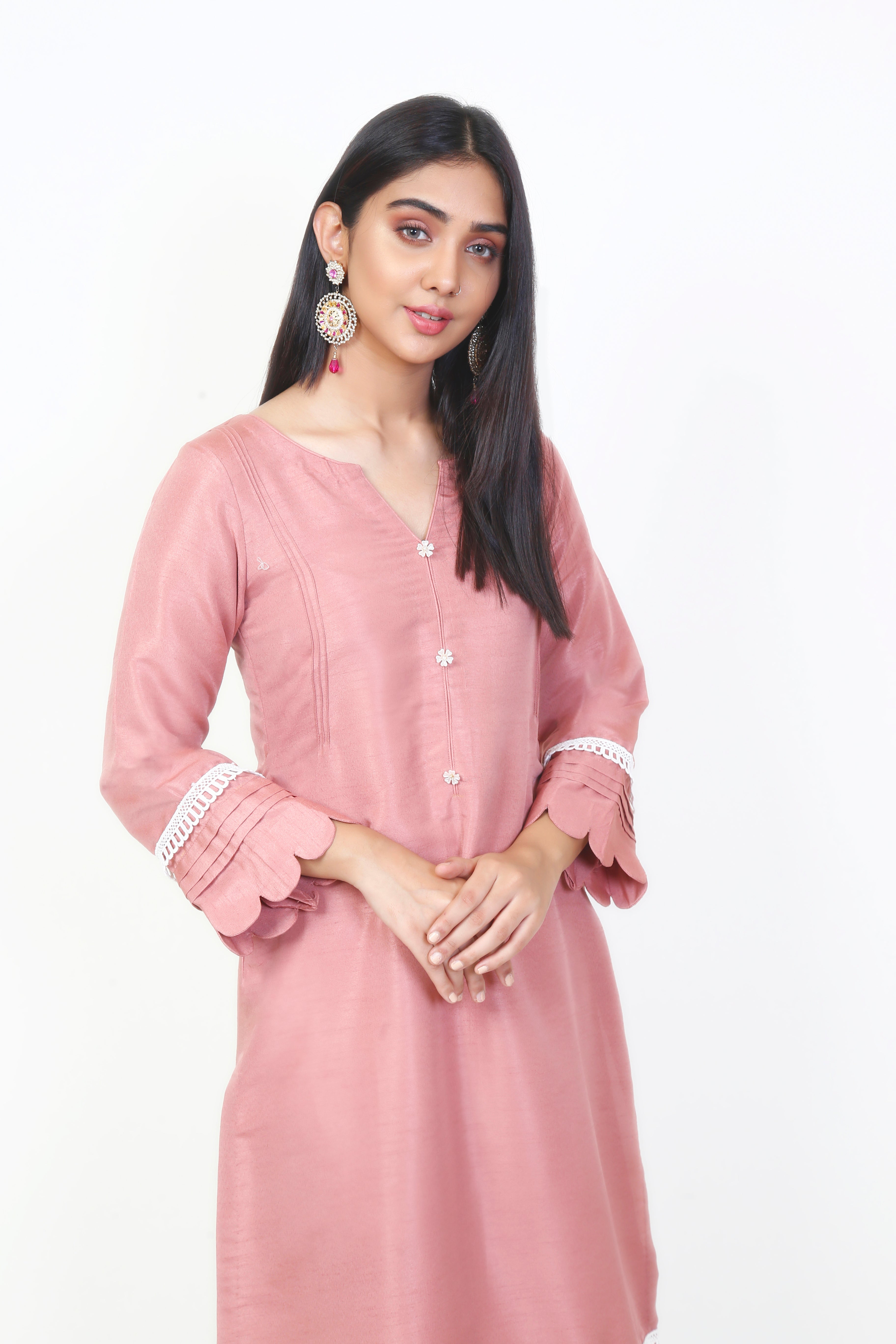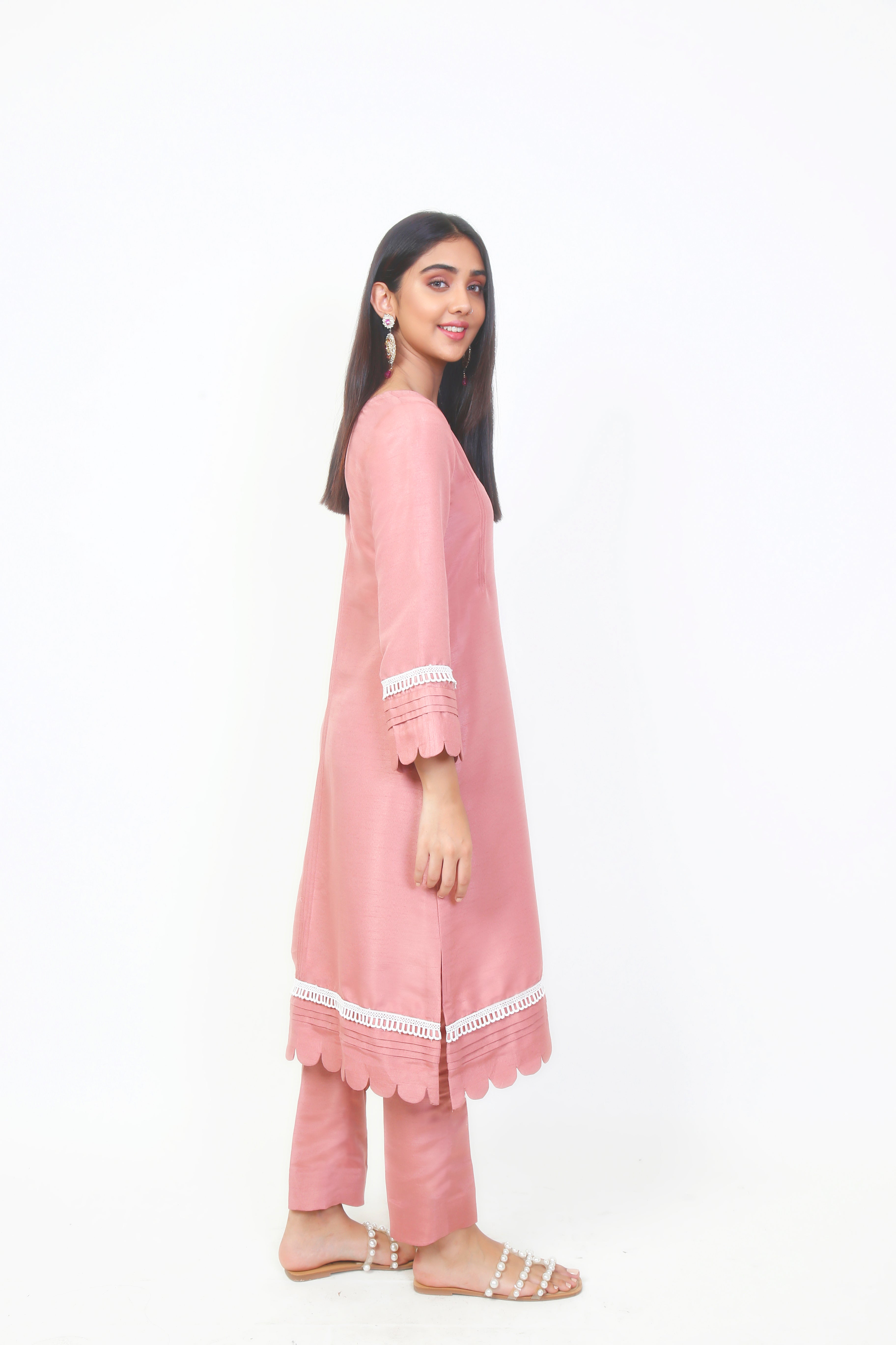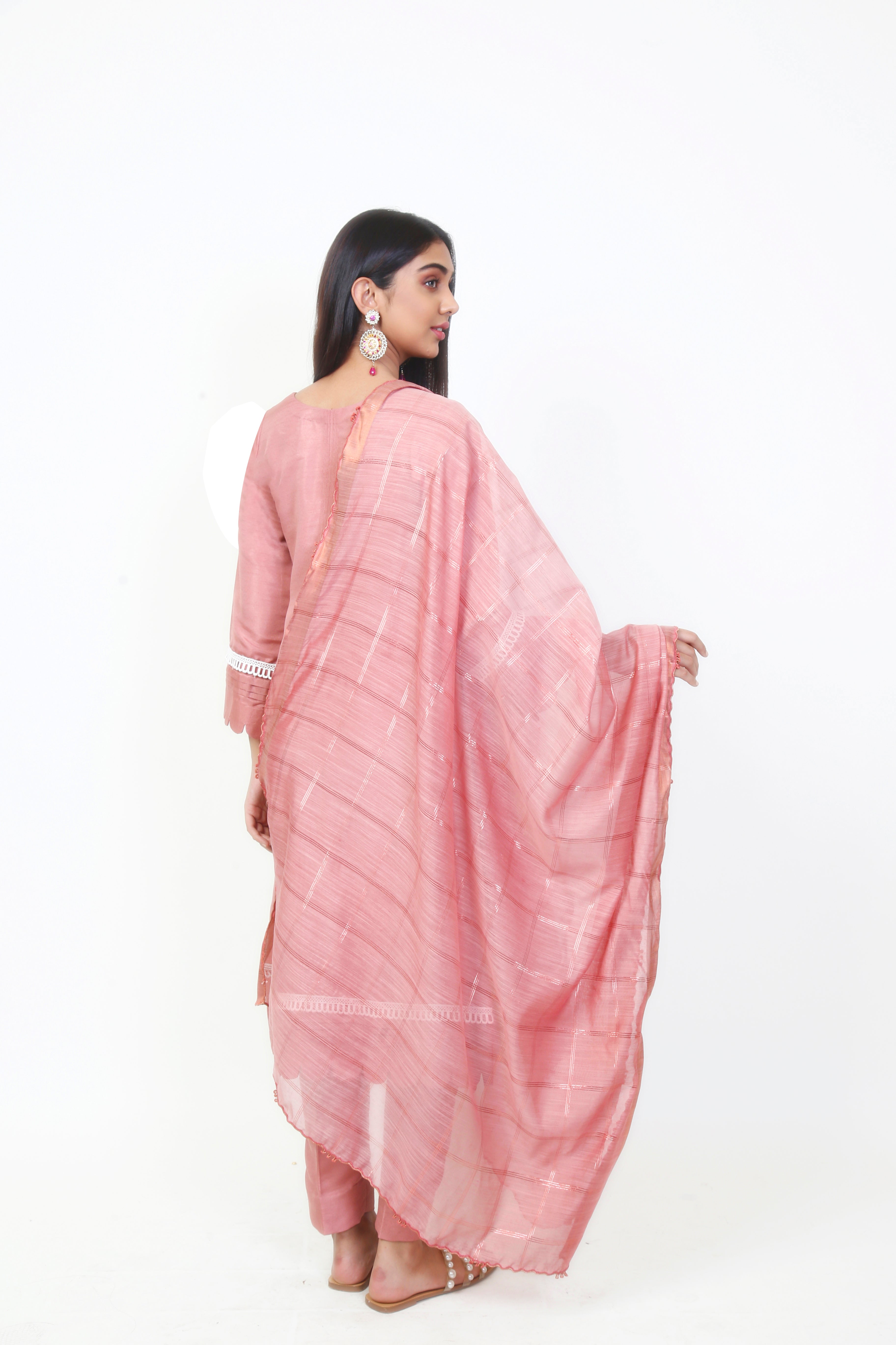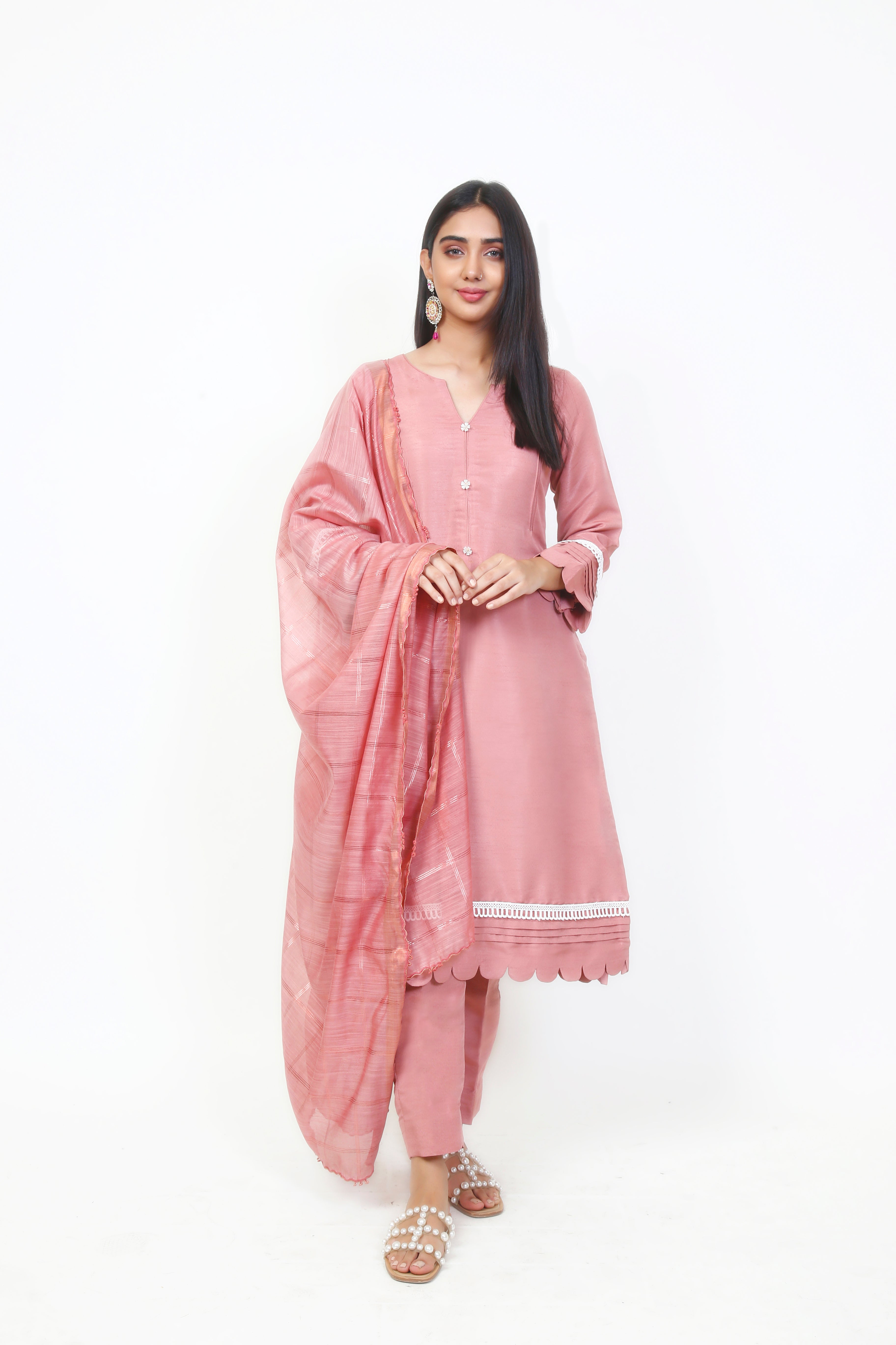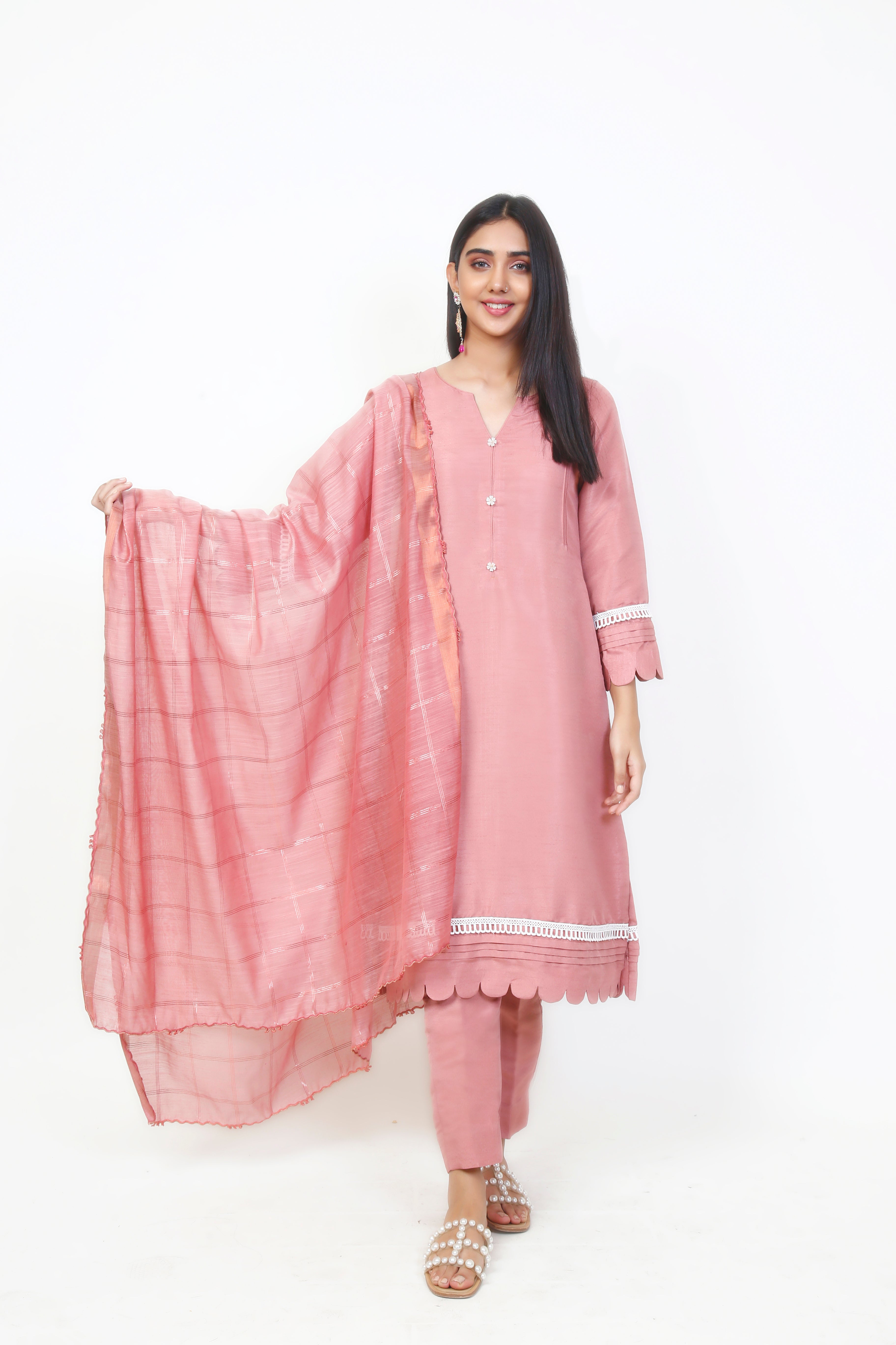 A popular and favored shade for the season that is undeniably loved by everyone. Presenting a stylish yet pleasing light pink rose shirt featuring thin white laces and a semi-circle finish on the hem. The light rose color shirt is paired with matching straight-leg trousers and a matching check color dupatta.