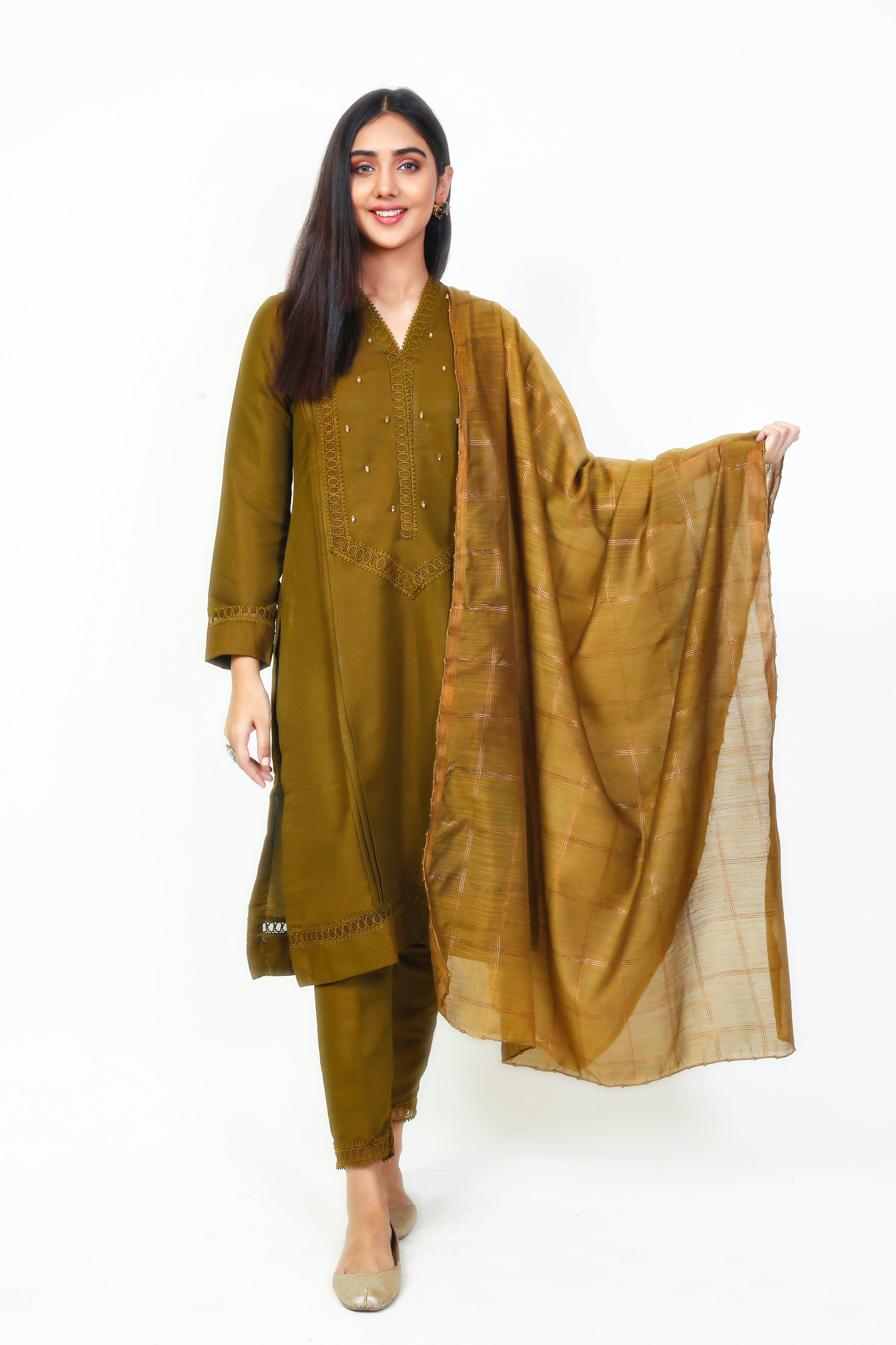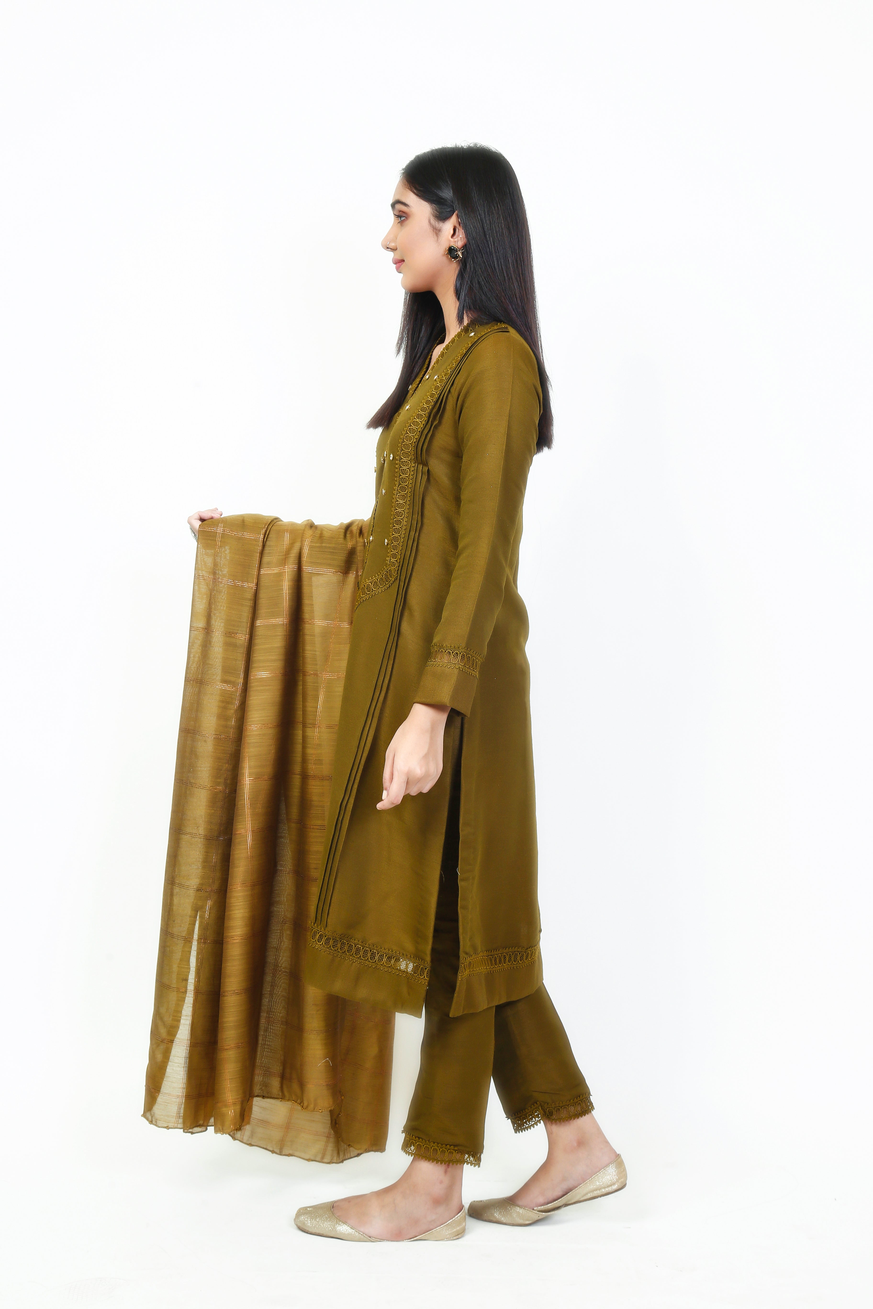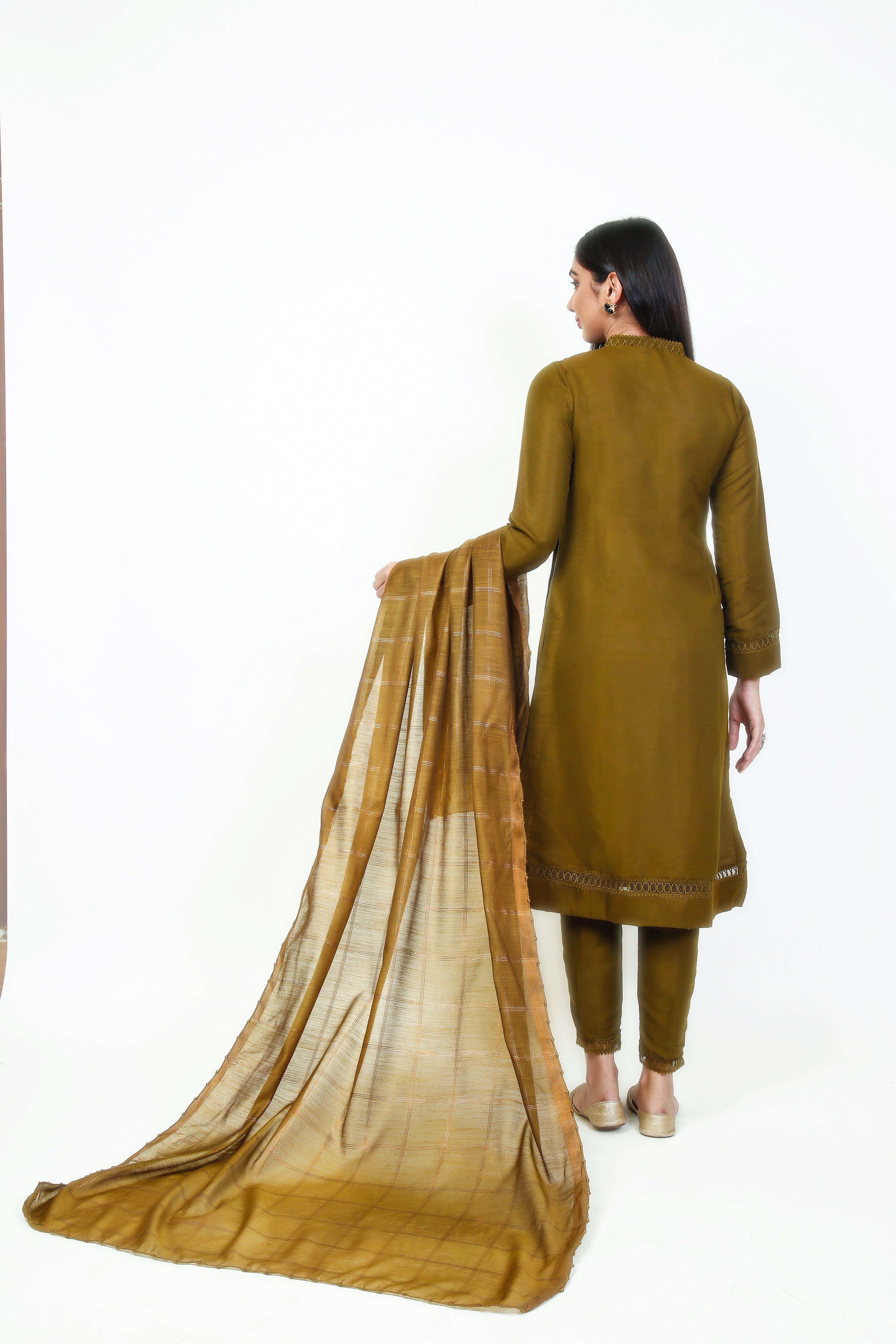 A hue between yellowish browns and olives that is lighter and very slightly redder than the color autumn. Perfect for any occasion, the olive-brown shirt is illuminated with embellishments on the front and securely bordered with laces around it. The olive-brown shirt is paired with matching straight-leg trousers and a matching check color dupatta.