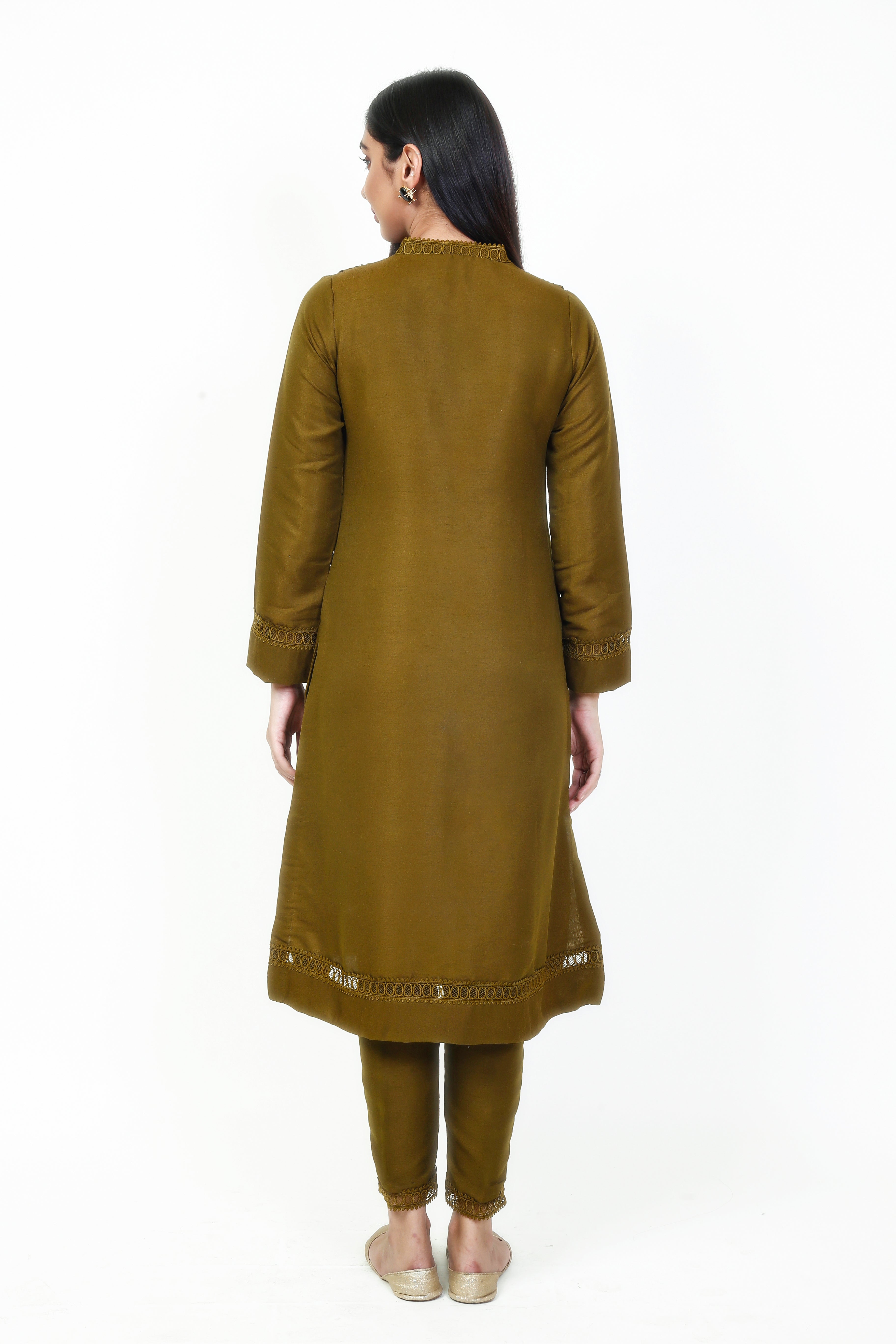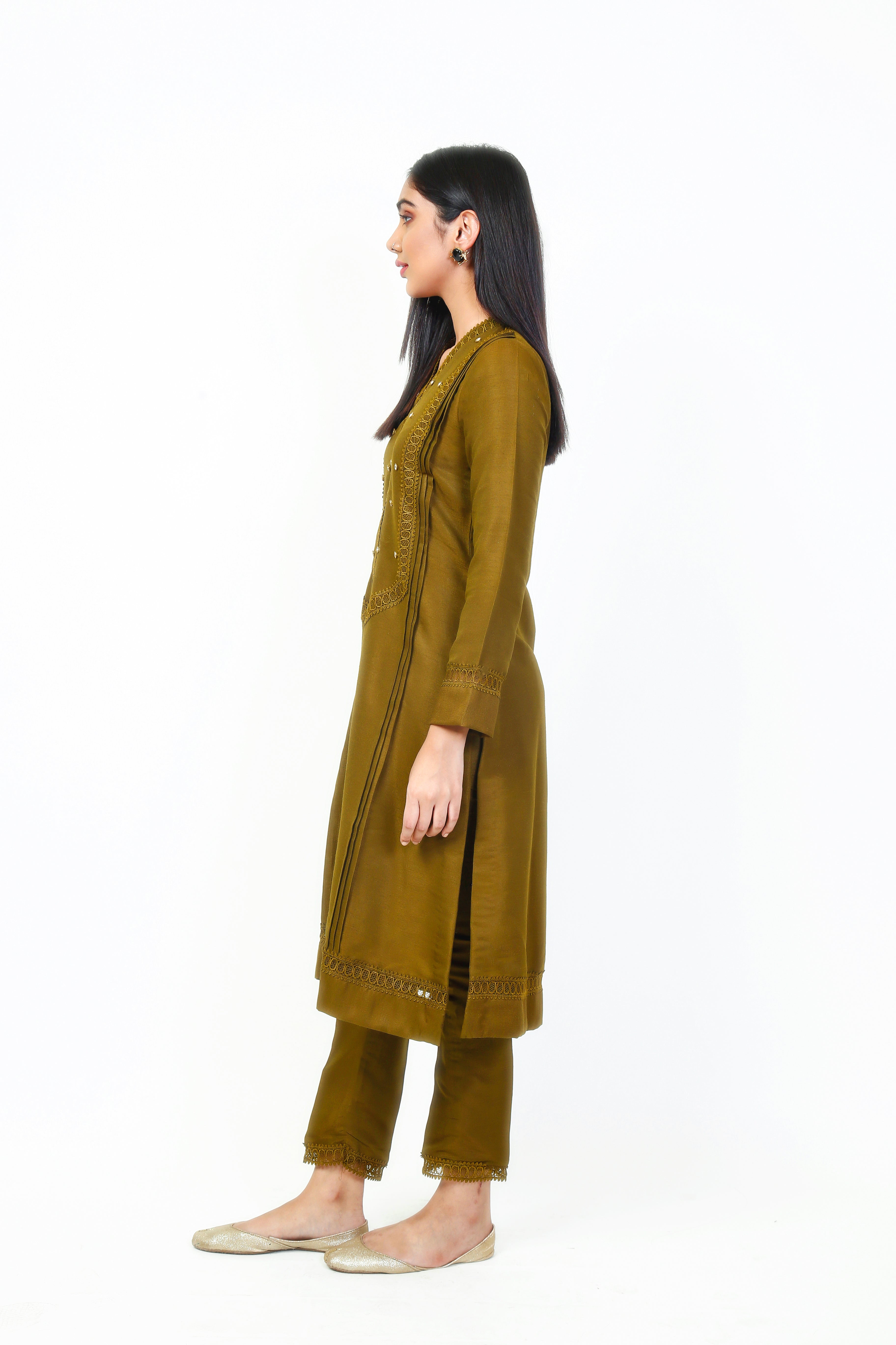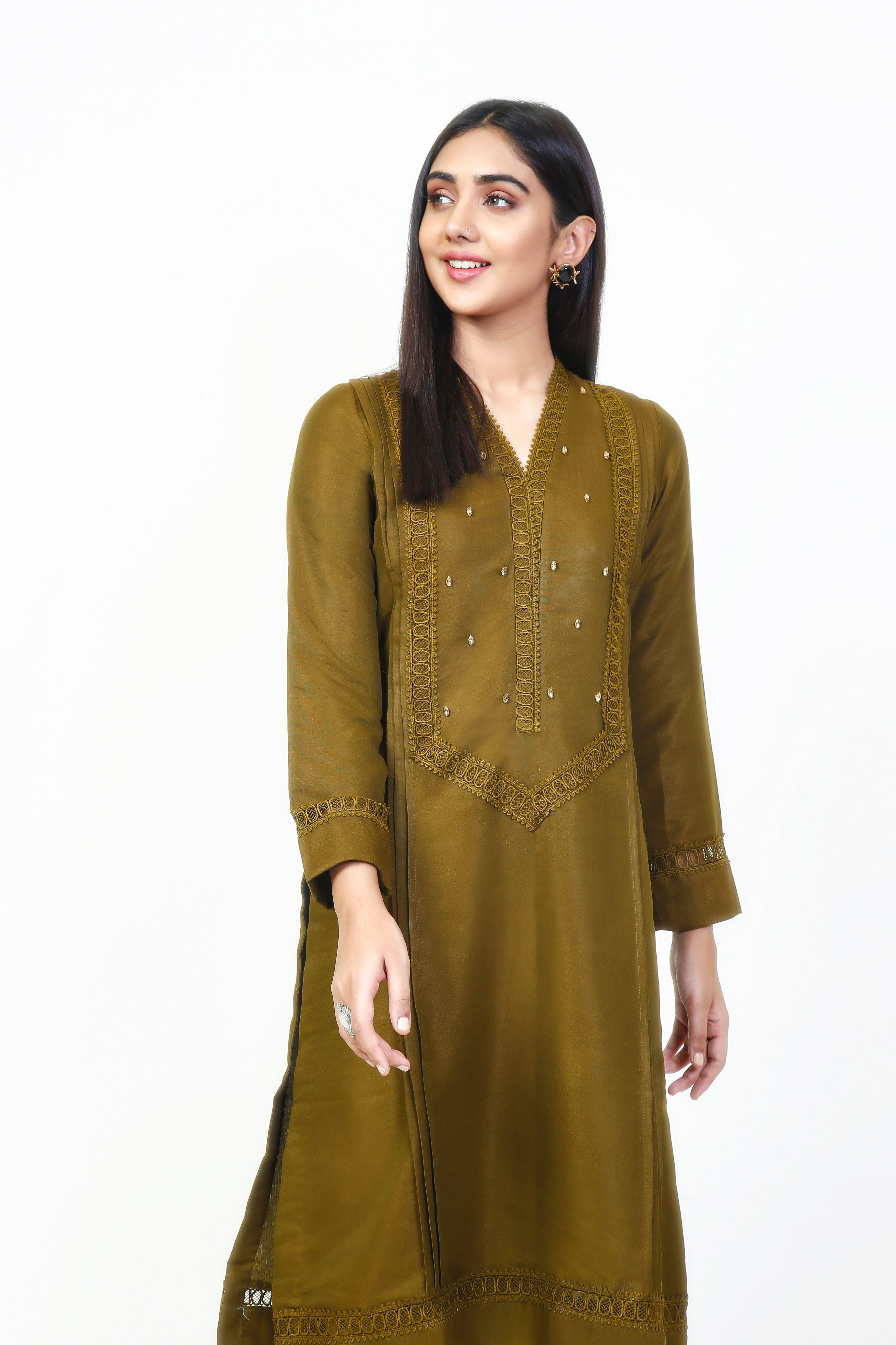 A hue between yellowish browns and olives that is lighter and very slightly redder than the color autumn. Perfect for any occasion, the olive-brown shirt is illuminated with embellishments on the front and securely bordered with laces around it. The olive-brown shirt is paired with matching straight-leg trousers and a matching check color dupatta.