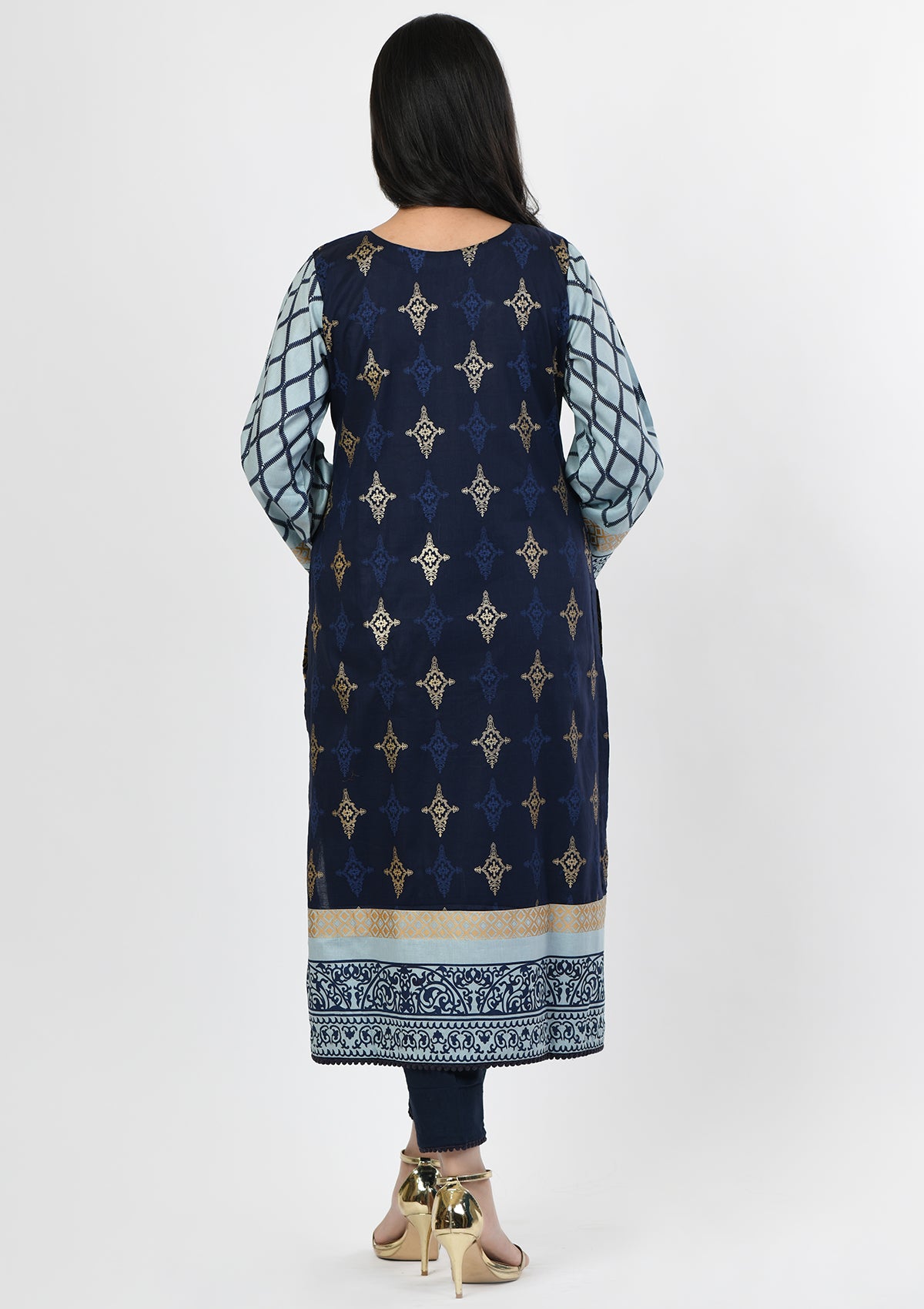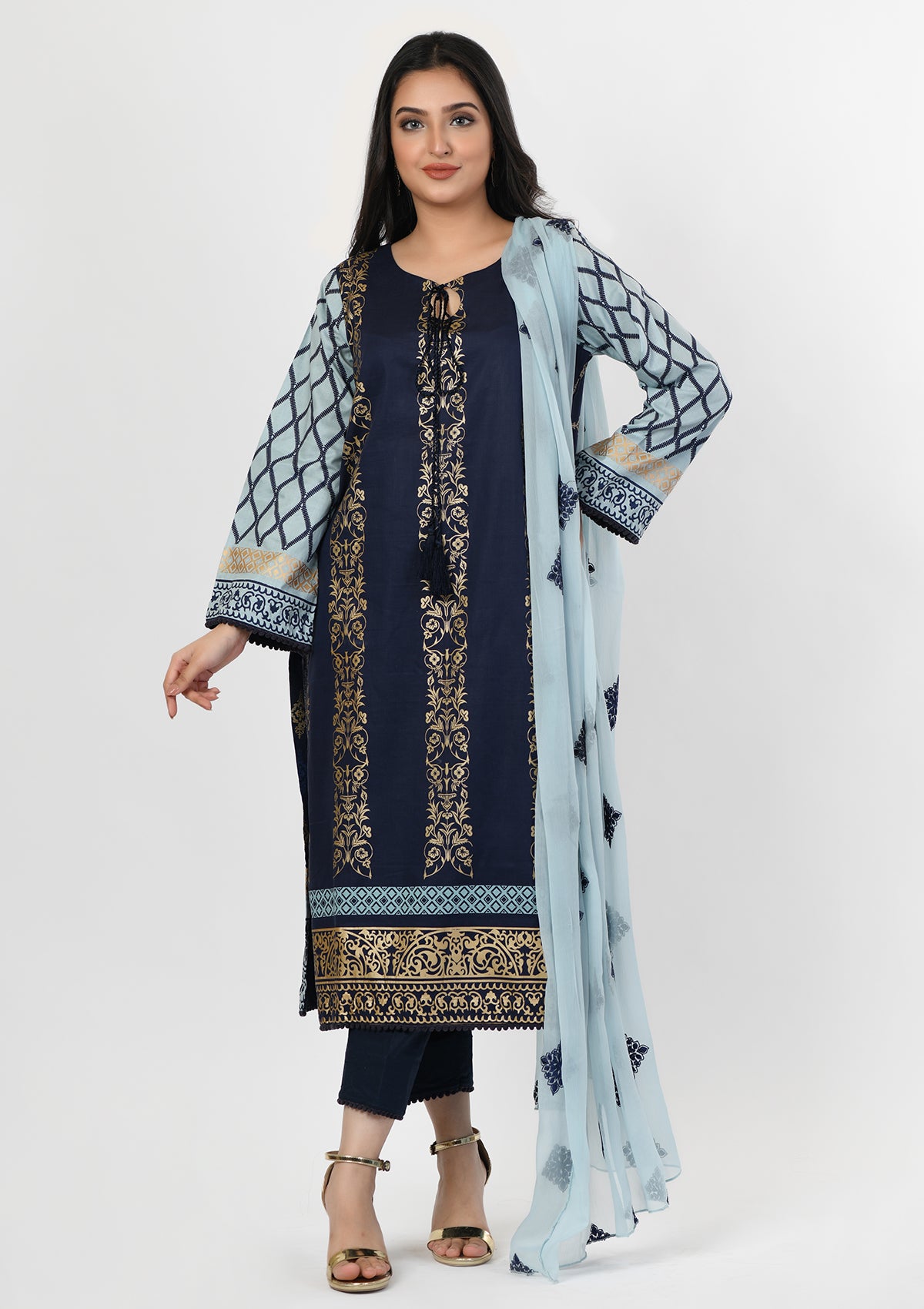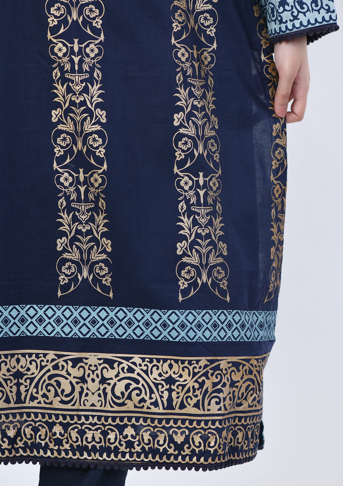 Product Details: Straight silhouette cotton shirt in solid blue shade with alluring screen print on the front. The neckline of the shirt is adorned with silk thread tassels in matching colors. The shirt is paired with matching pants and a sky blue chiffon embroidered dupatta.