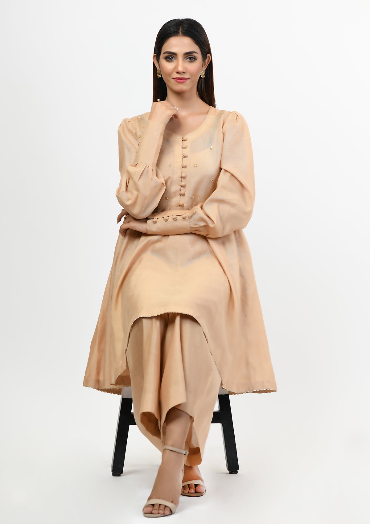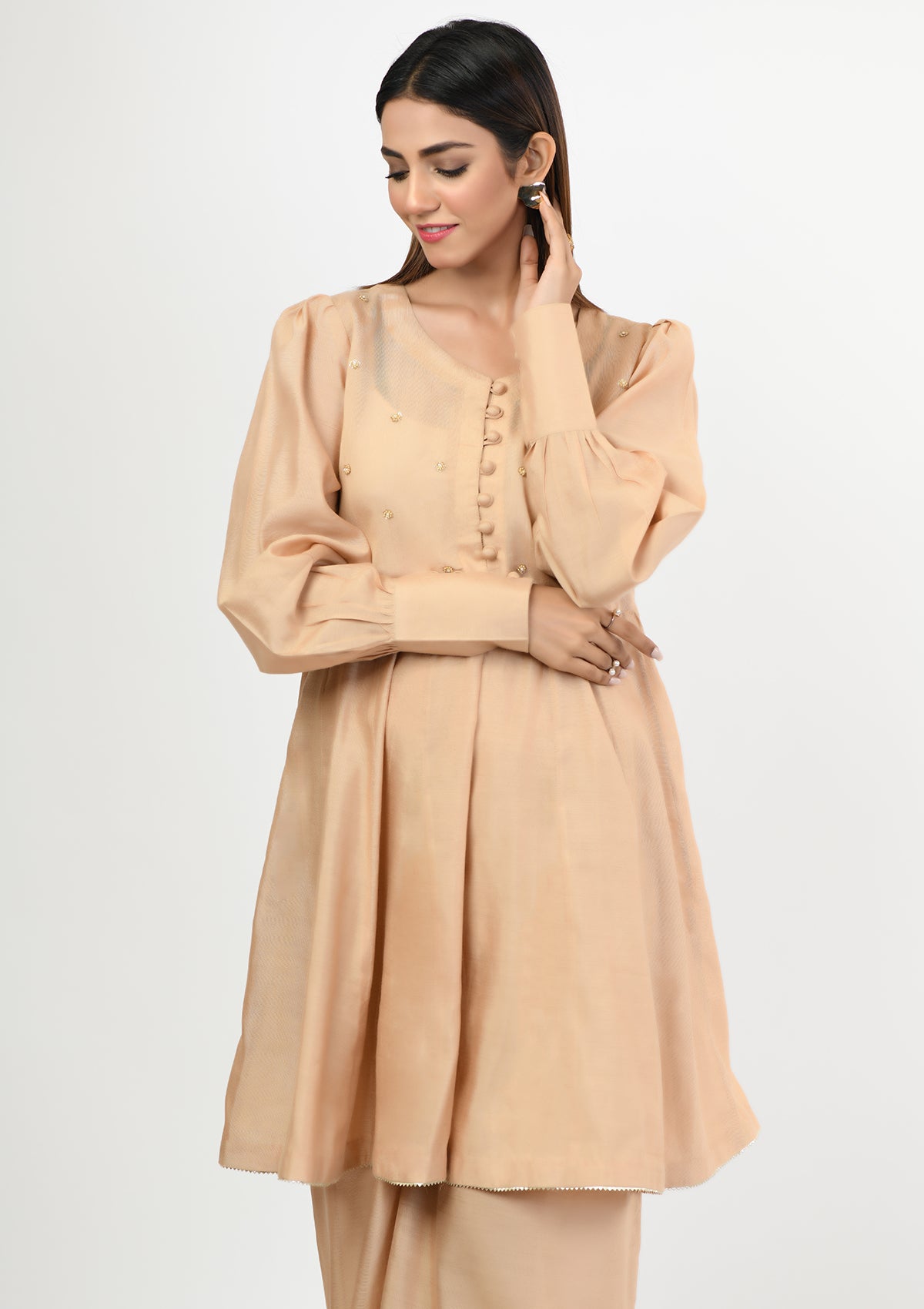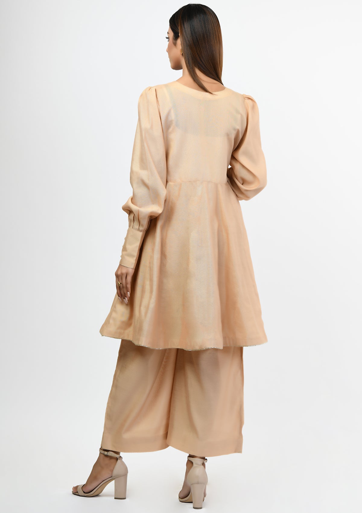 Product Details: The neutral color peplum can be used as a hybrid between casual hangouts with friends or formal dining with the family. The beautiful neckline is decorated with handmade buttons, sequence, and pearls on the front. The sleeves are further enhanced with exaggerated cuffs and buttons. It is paired with a loop and palazzo pants.