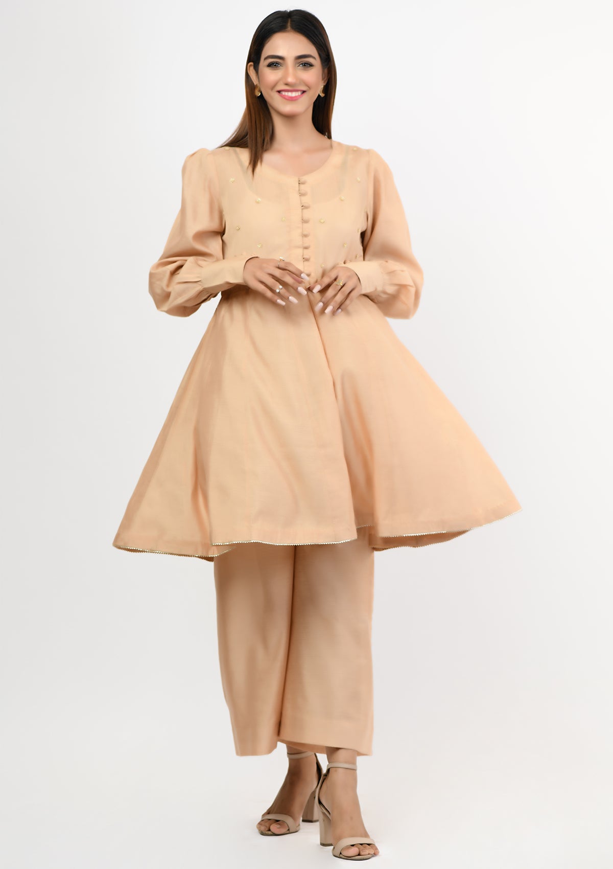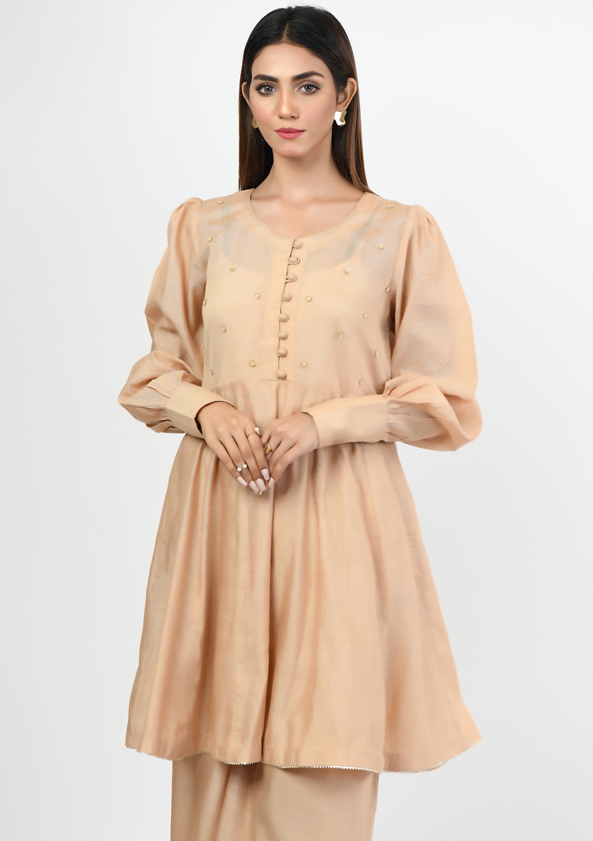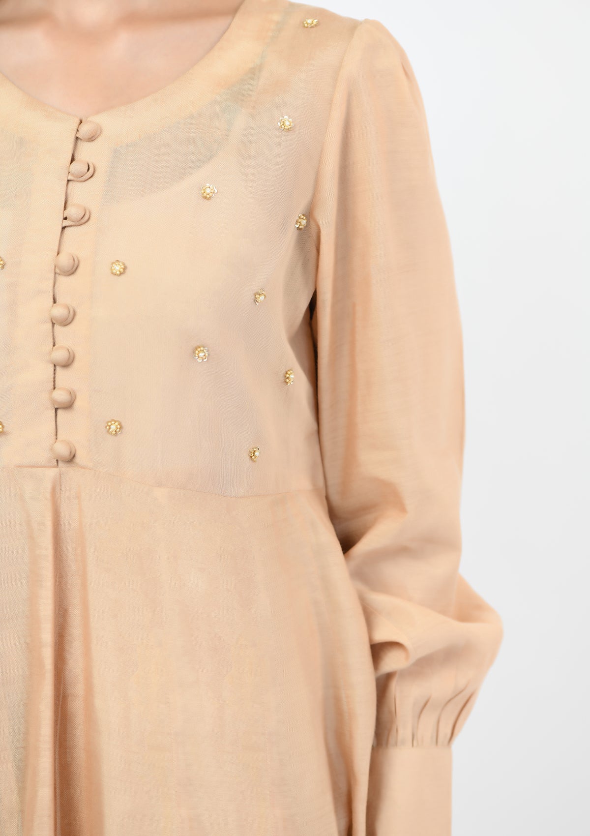 Product Details: The neutral color peplum can be used as a hybrid between casual hangouts with friends or formal dining with the family. The beautiful neckline is decorated with handmade buttons, sequence, and pearls on the front. The sleeves are further enhanced with exaggerated cuffs and buttons. It is paired with a loop and palazzo pants.