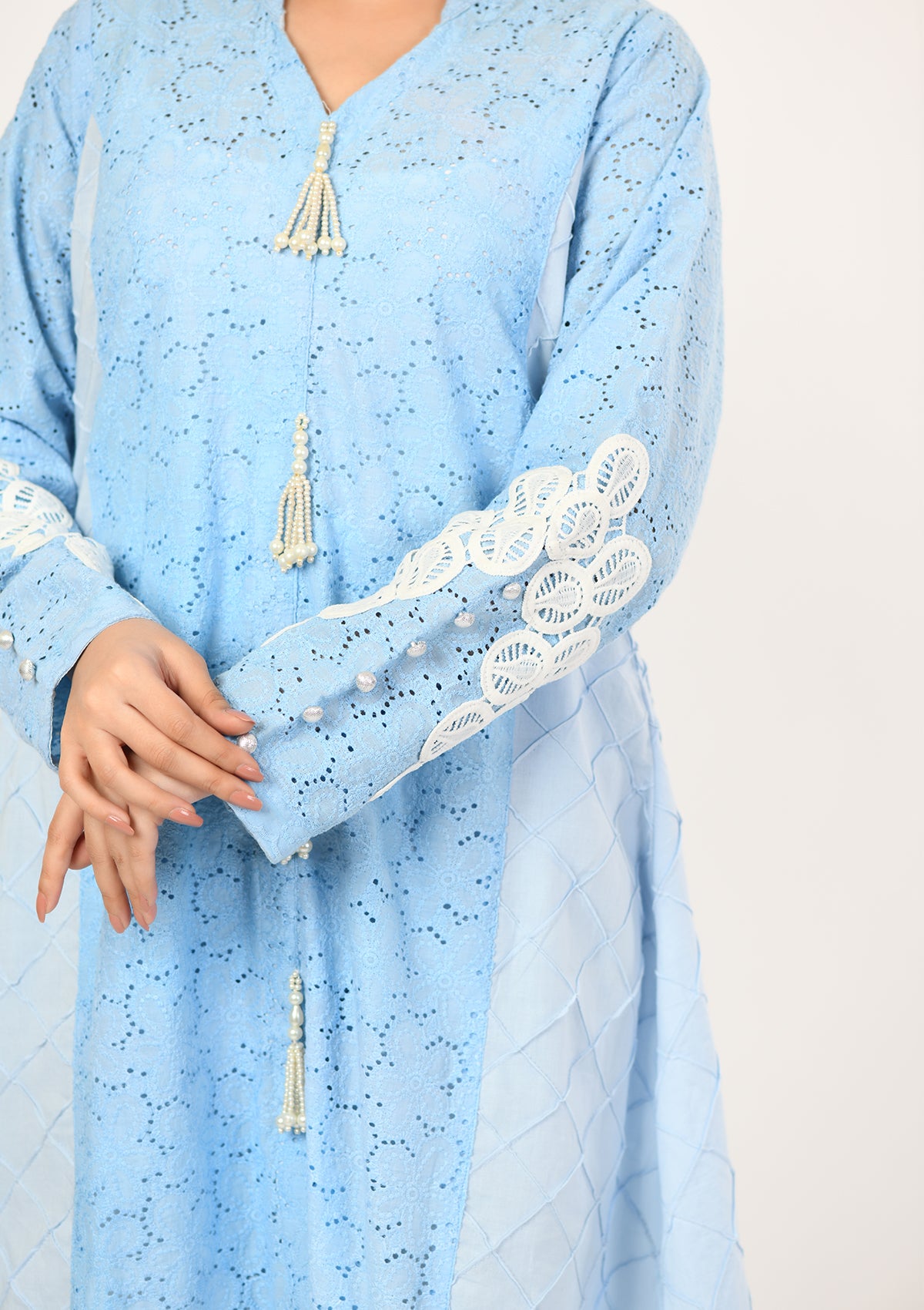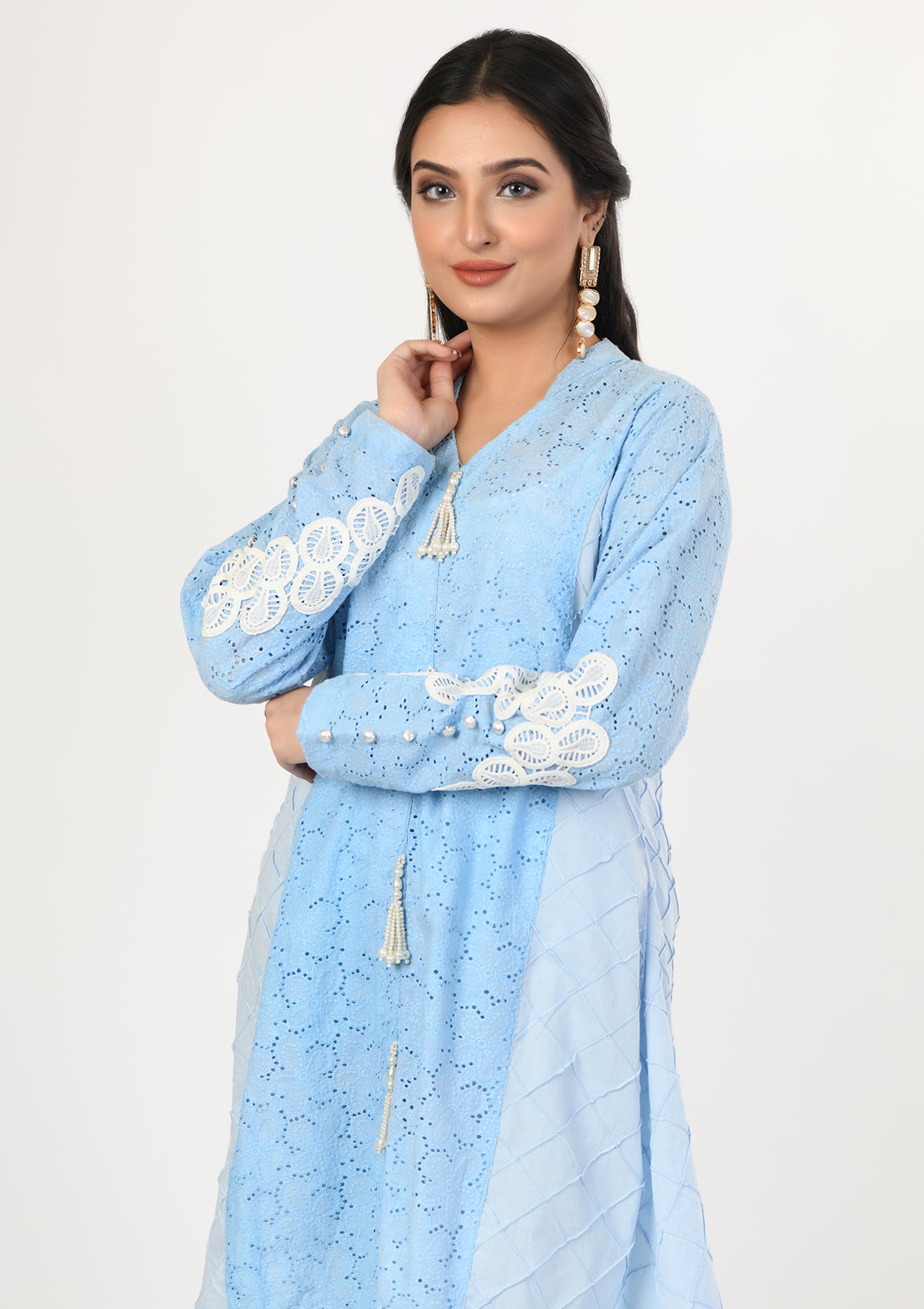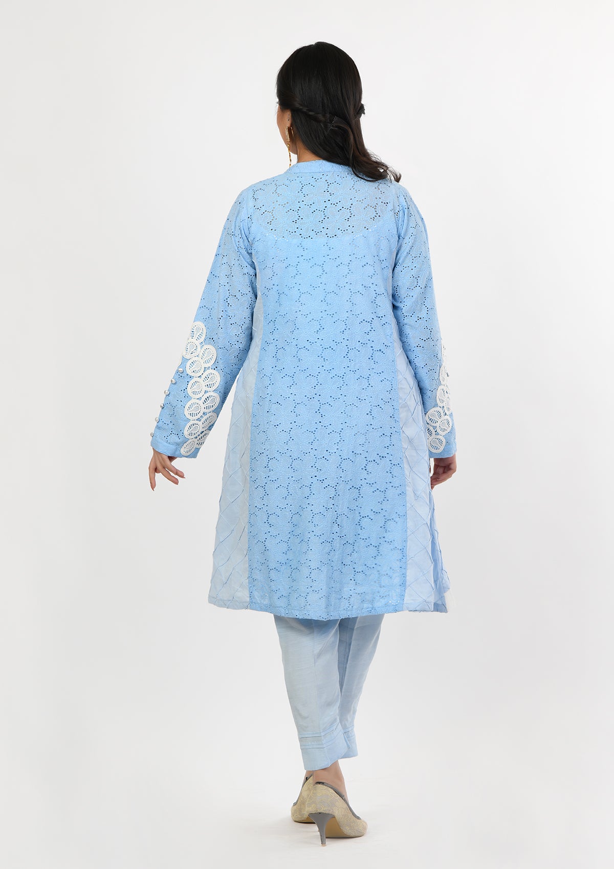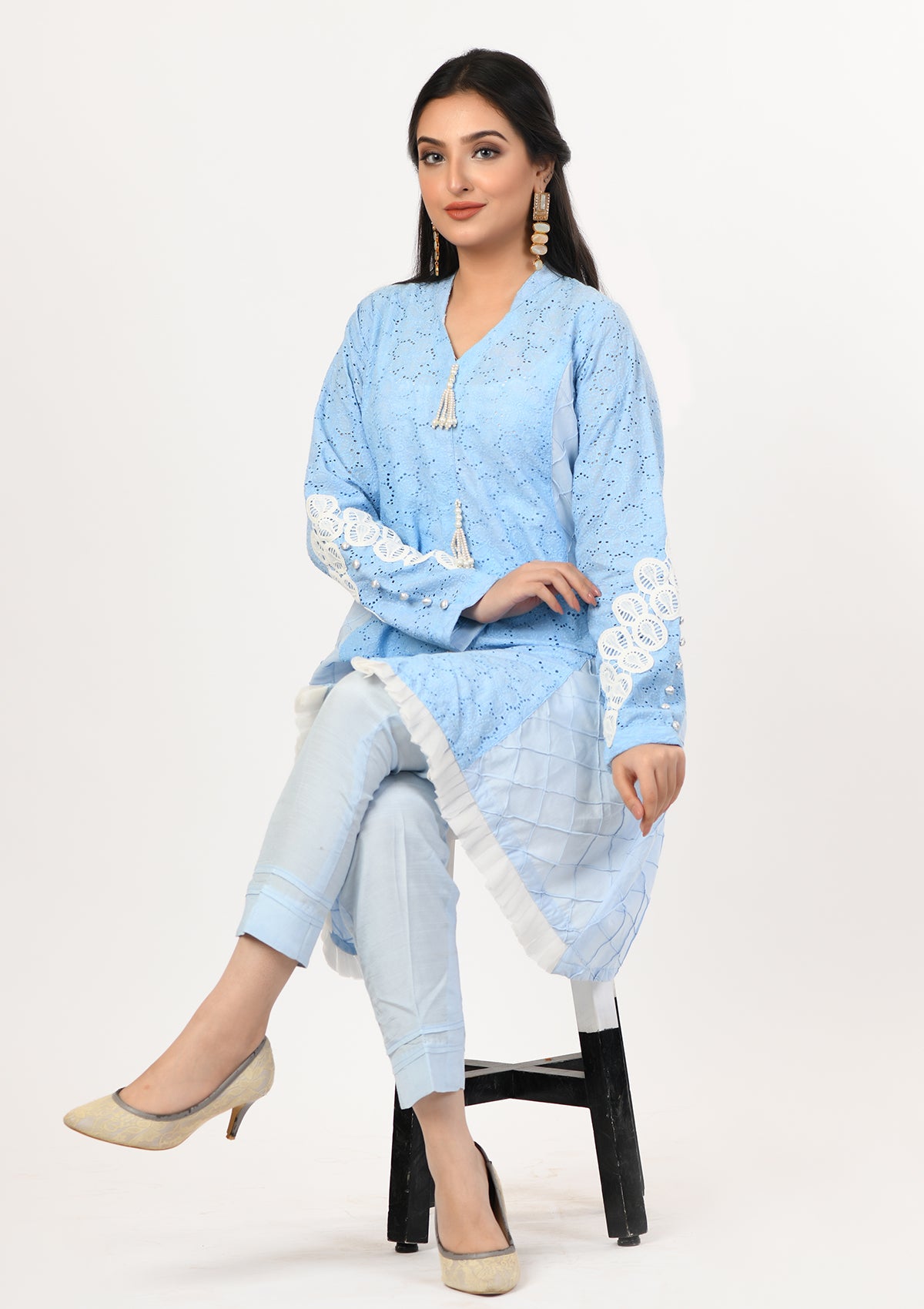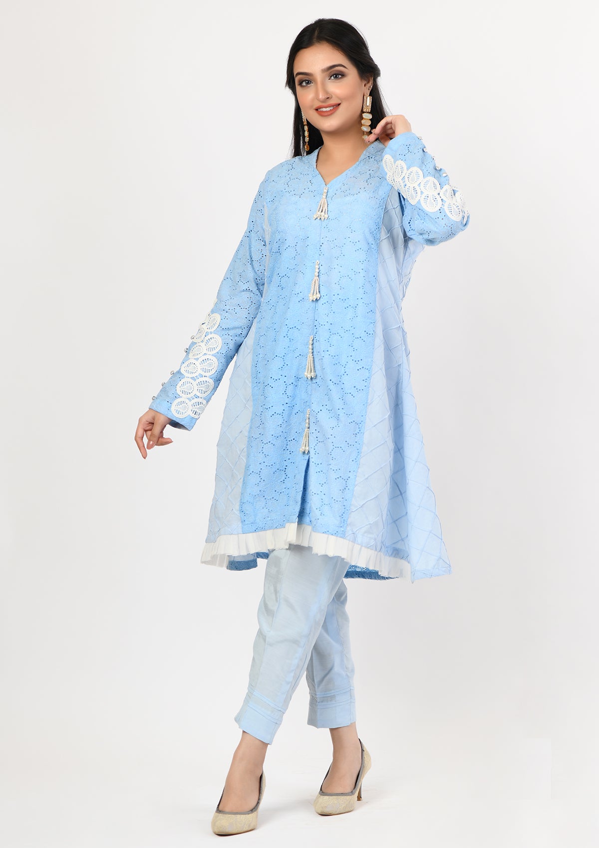 Product Details: Boasting a relaxed silhouette. The ice blue chicken A-line paneled shirt with pintucks detailing has white embroidered sleeves; the sleeves are adorned in bunch and buttons throughout. The hemline is heightened with the white organza ruffles that pair it beautifully with matching pants finished with laces on the border hem.