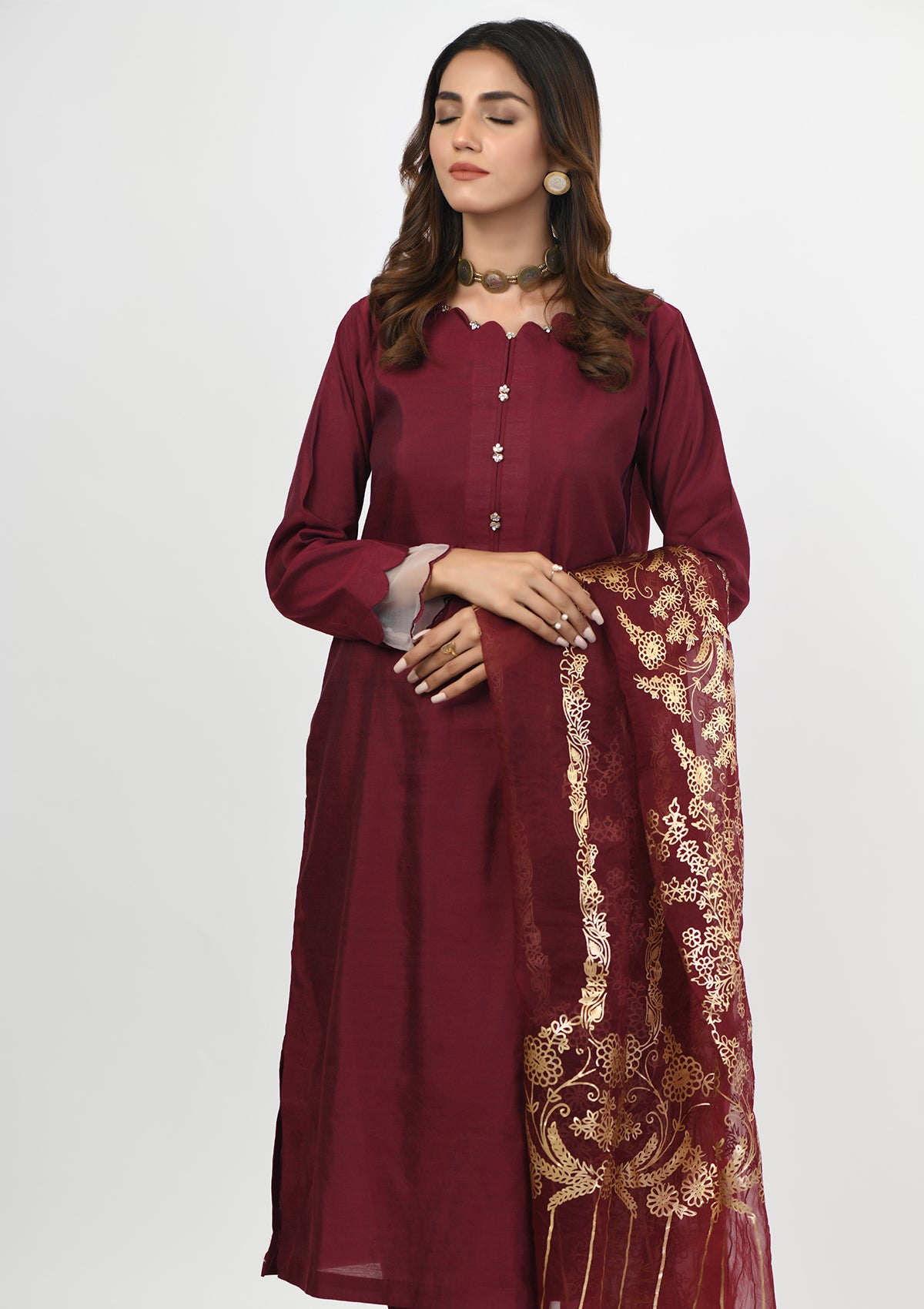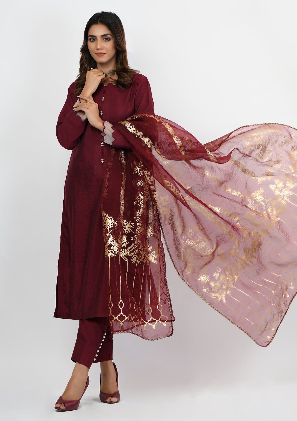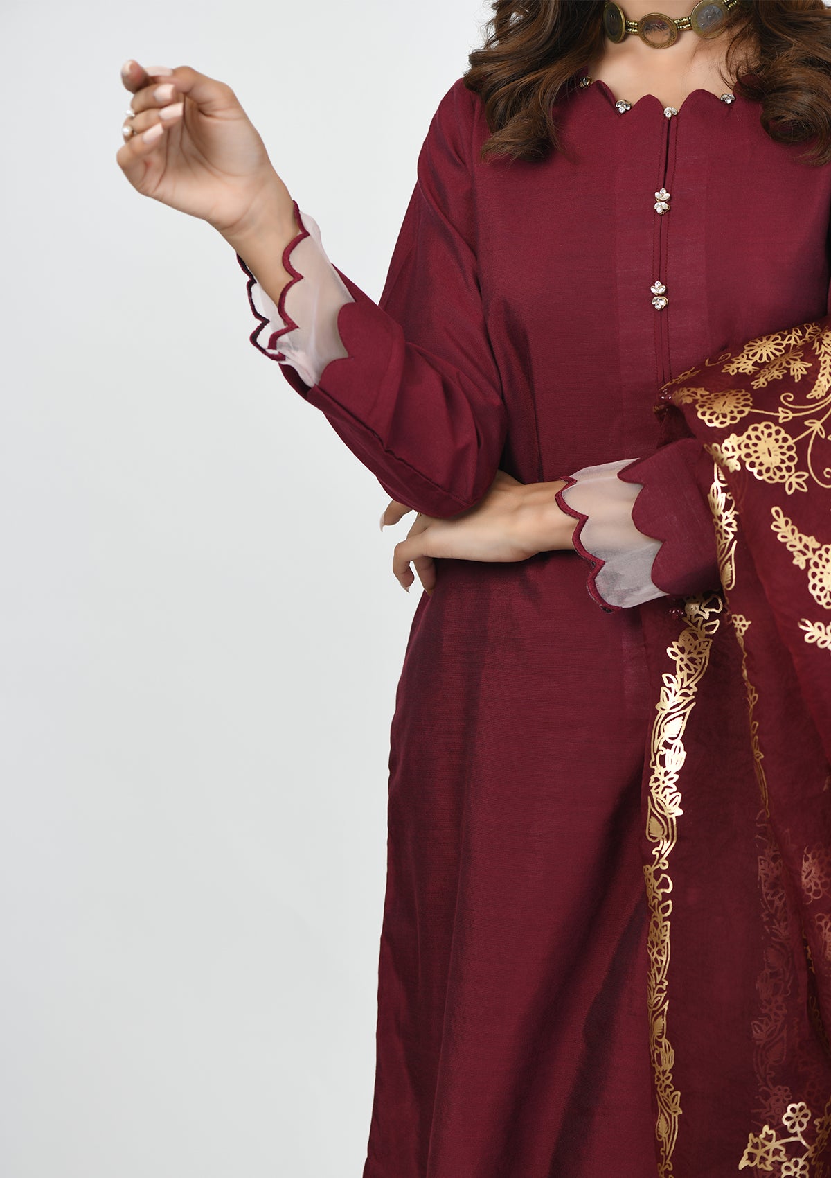 Product Details: The maroon cotton silk straight shirt features a scalloped neckline that is finely detailed with intricate kundun buttons. The sleeves are adorned with contrasting scalloped organza and paired with matching pants. Finish the look with a matching organza screen printed dupatta.