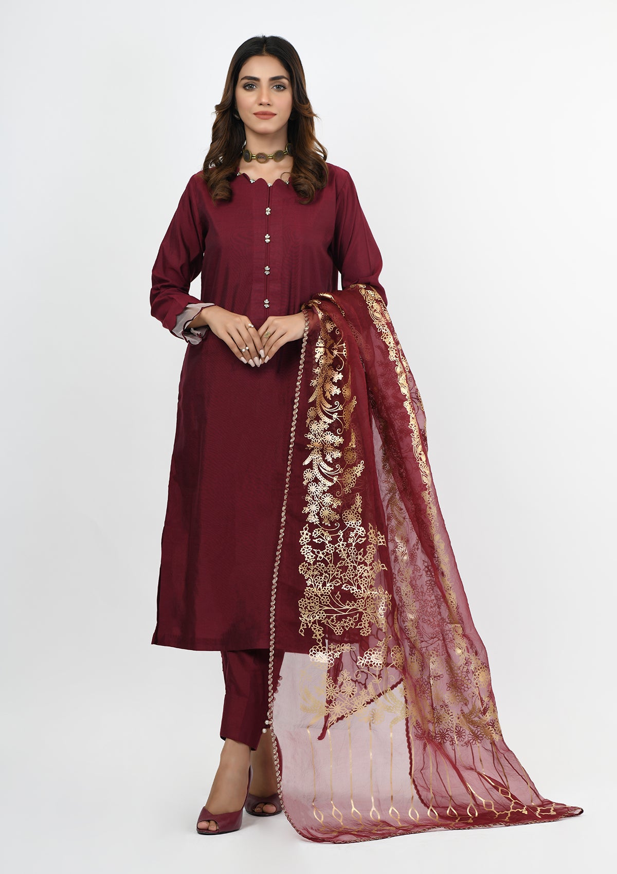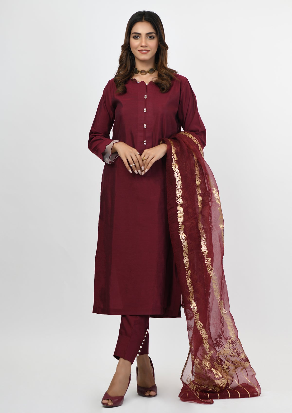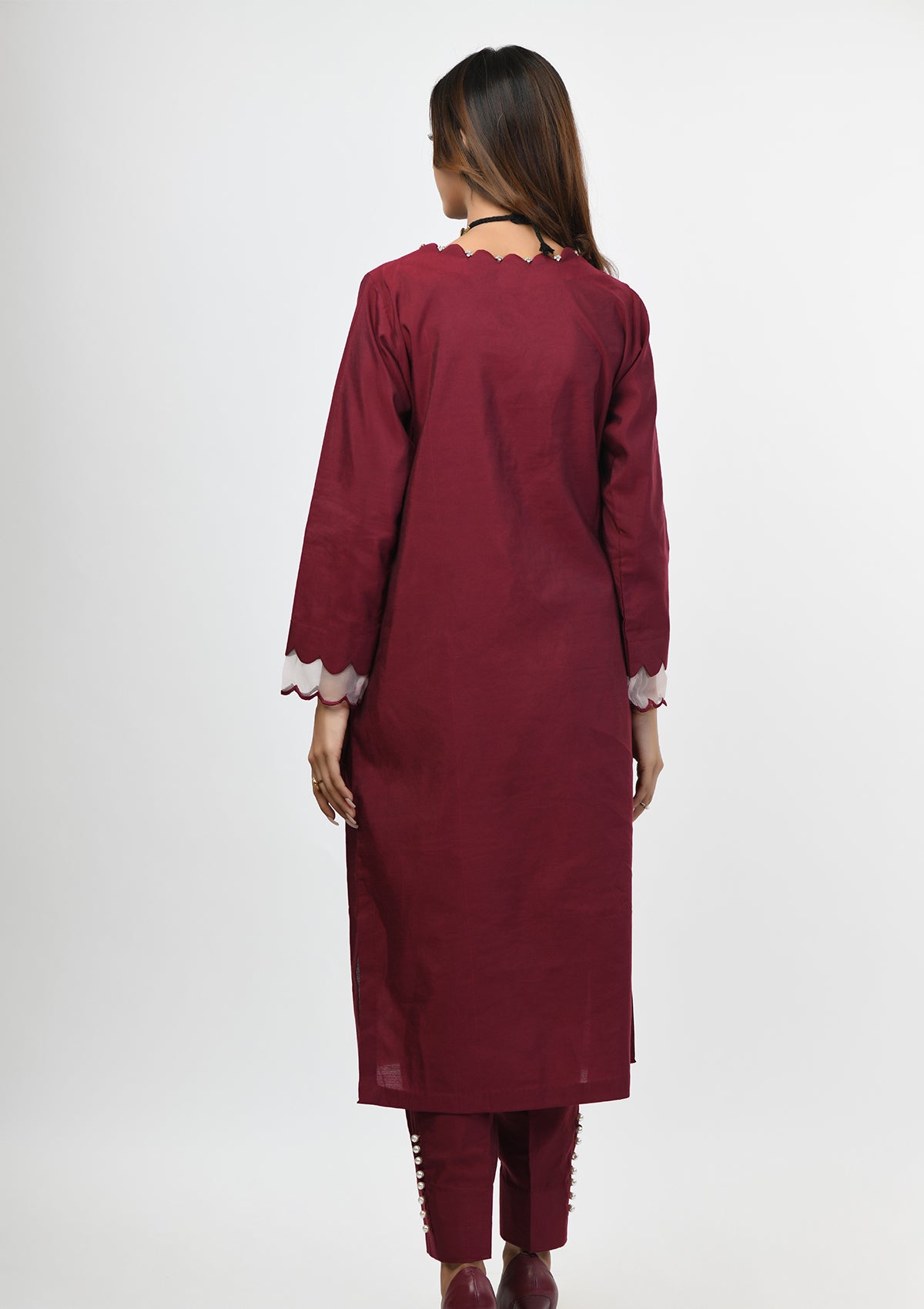 Product Details: The maroon cotton silk straight shirt features a scalloped neckline that is finely detailed with intricate kundun buttons. The sleeves are adorned with contrasting scalloped organza and paired with matching pants. Finish the look with a matching organza screen printed dupatta.