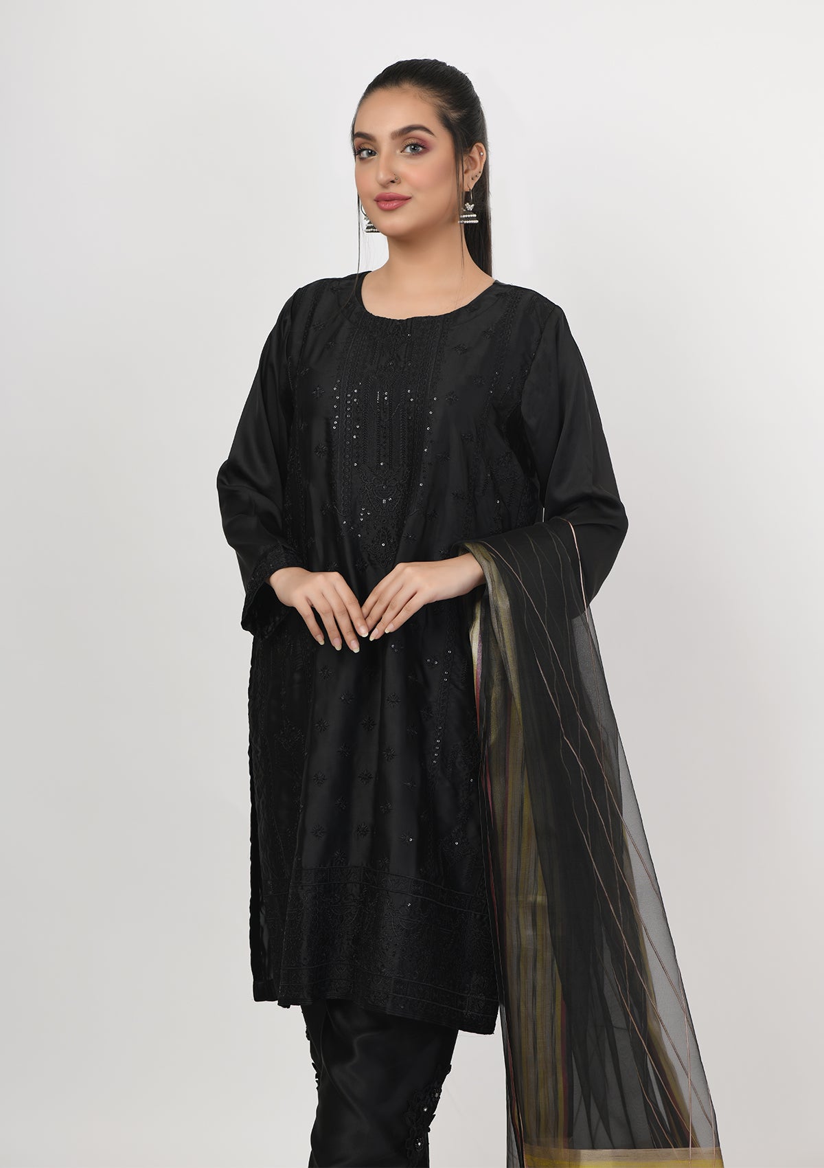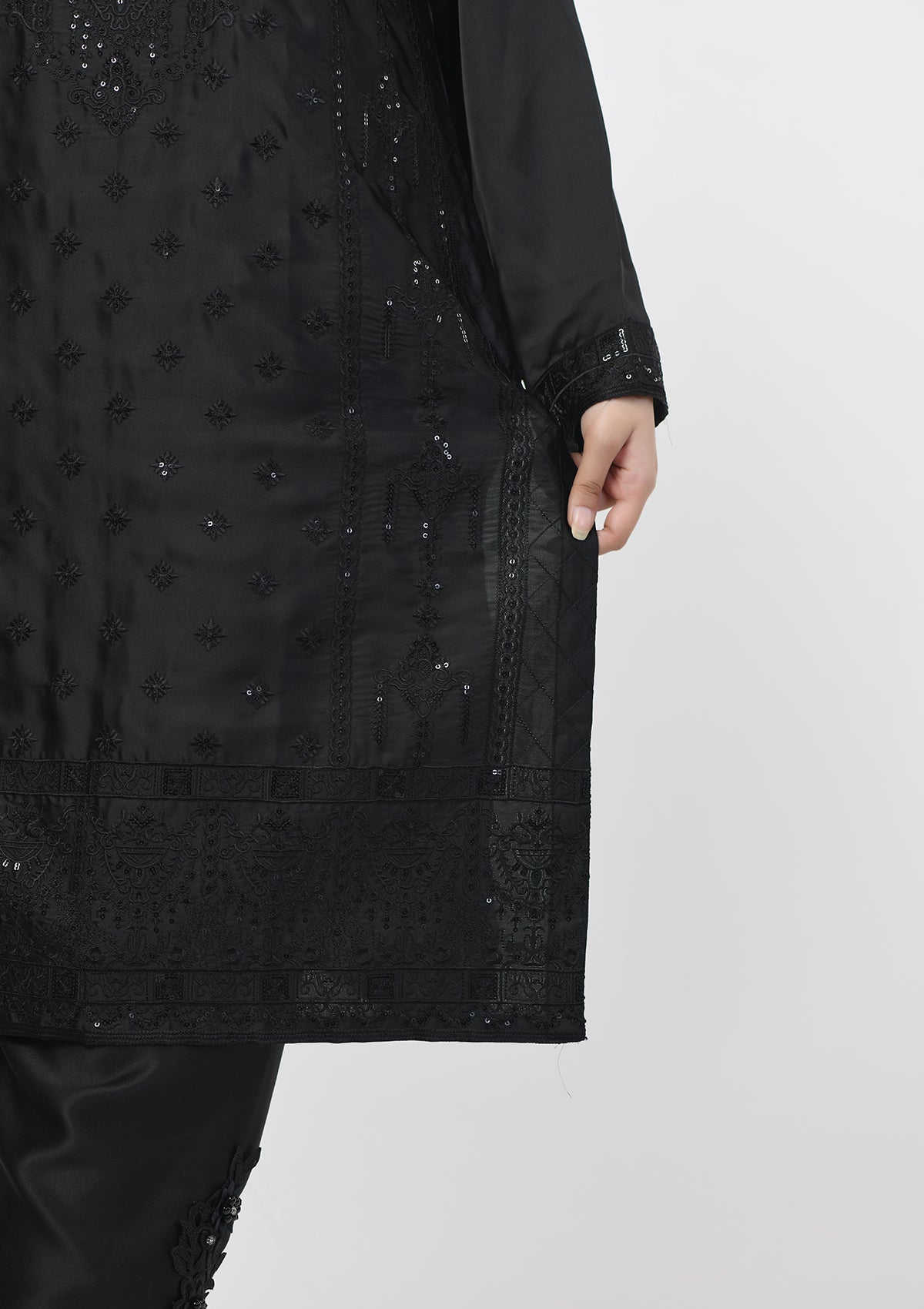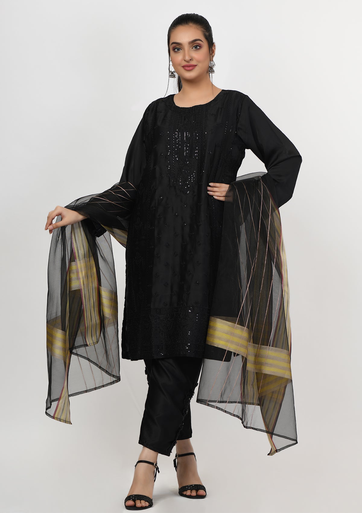 Product Details: The black embroidered dress is classic wear to parties. The front of the shirt is adorned with cross-stitch matching thread embroidery paired with matching cigarette pants. The shirt and the pant are heavily encrusted with 3D decorative flowers throughout the entire dress. Perfect the look with a black and gold matching organza dupatta.