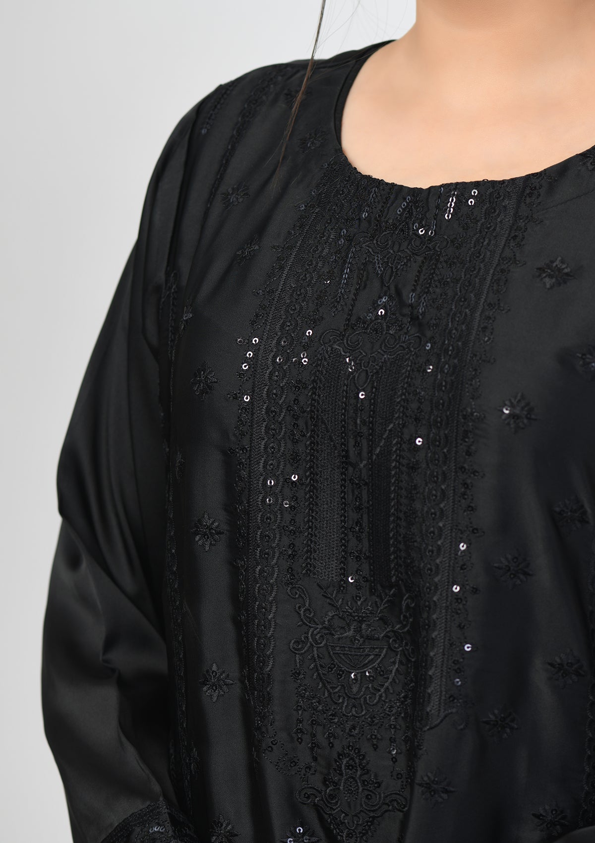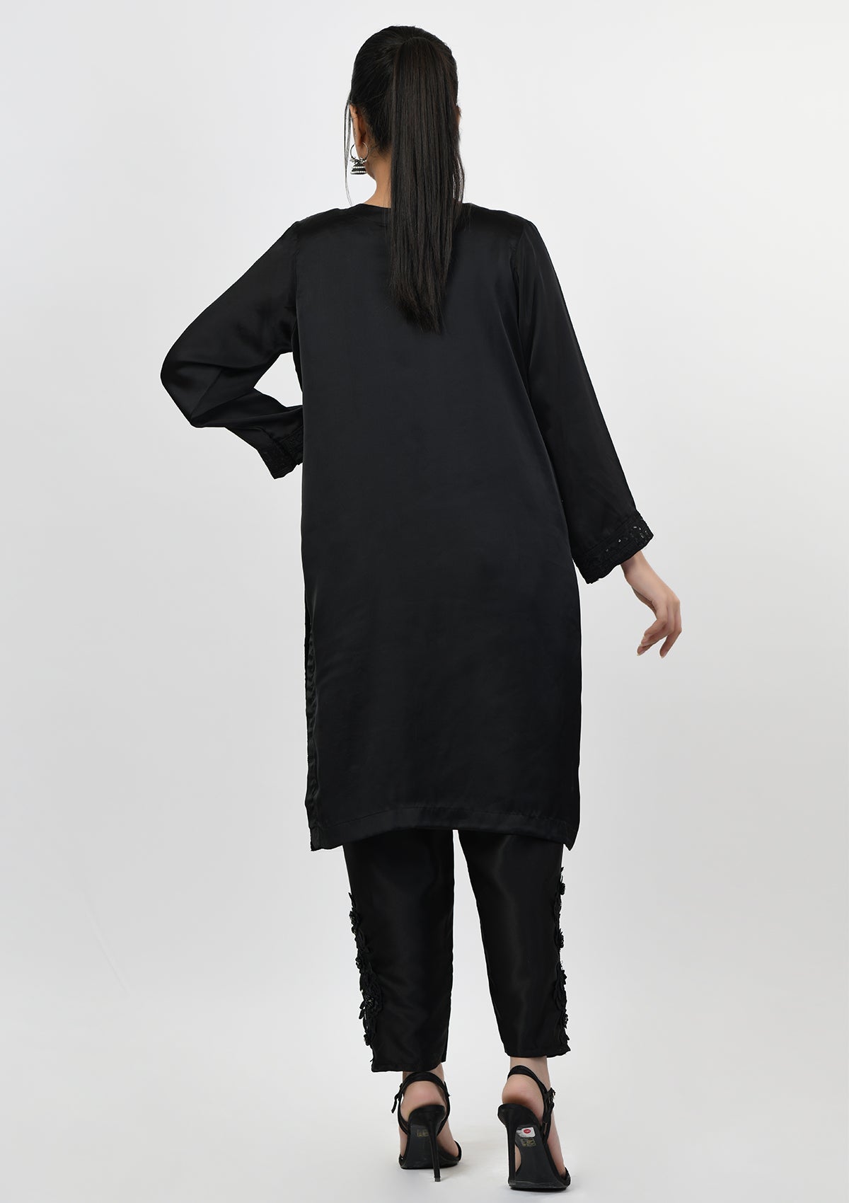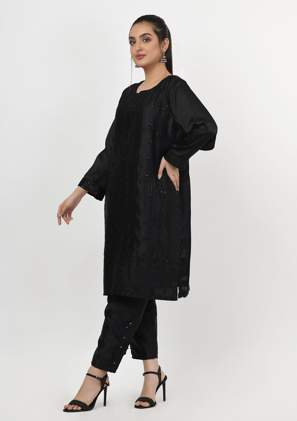 Product Details: The black embroidered dress is classic wear to parties. The front of the shirt is adorned with cross-stitch matching thread embroidery paired with matching cigarette pants. The shirt and the pant are heavily encrusted with 3D decorative flowers throughout the entire dress. Perfect the look with a black and gold matching organza dupatta.