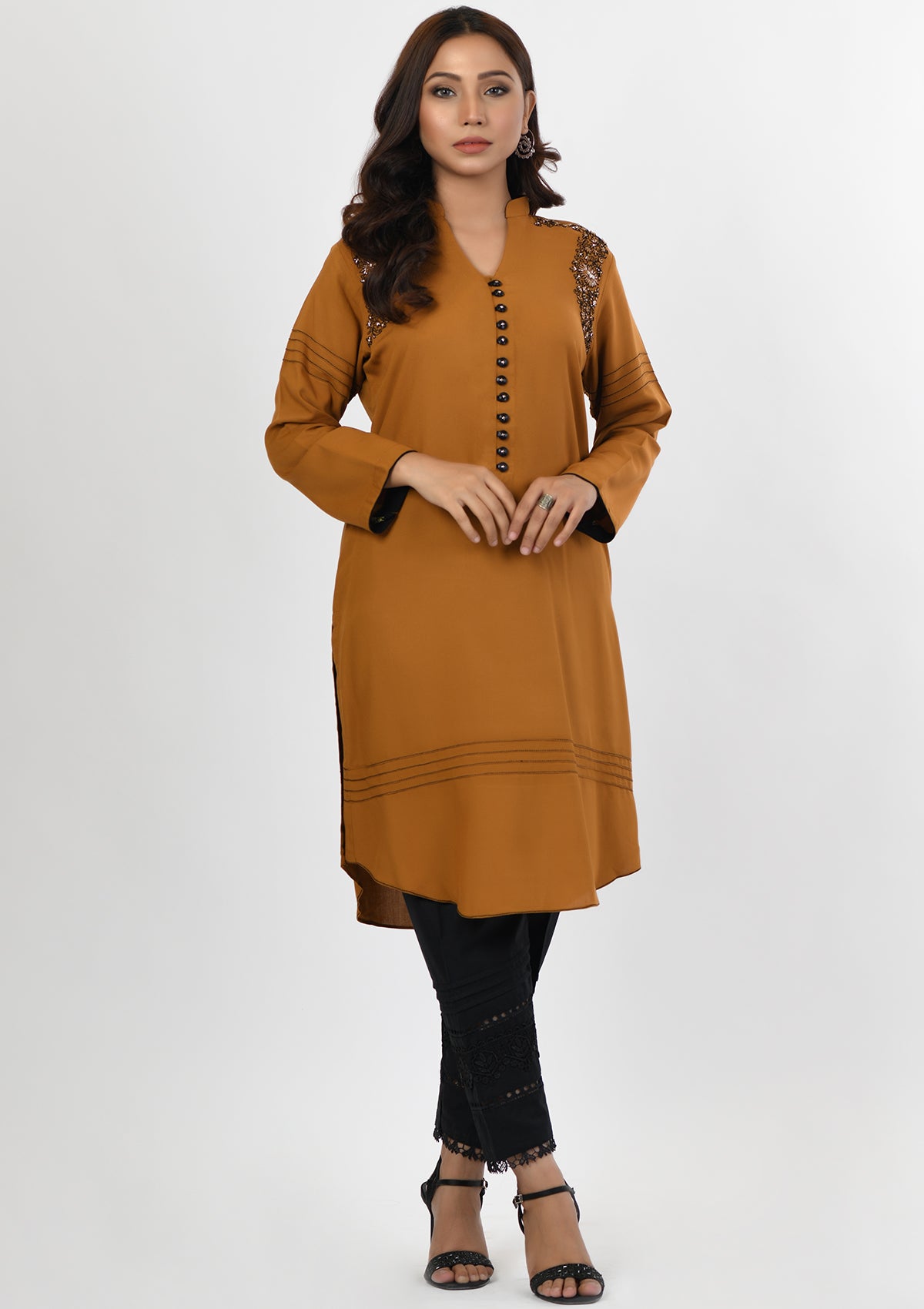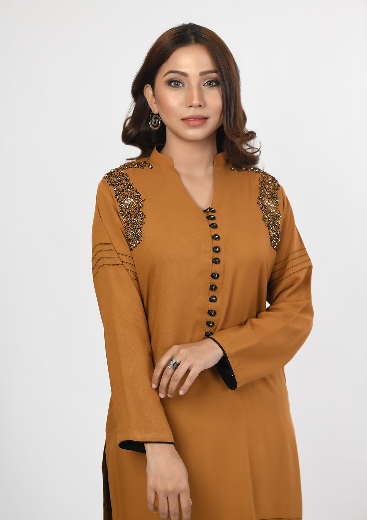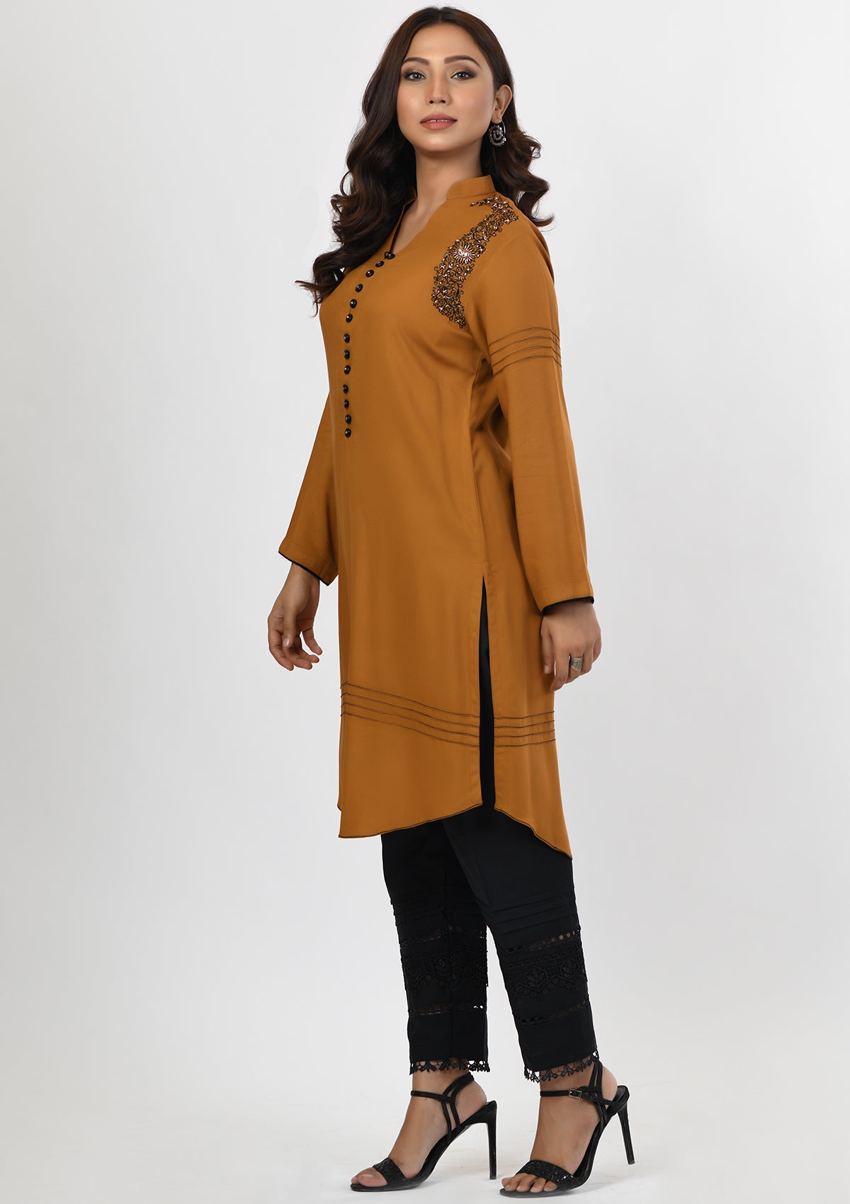 Product Details: A mustard cotton shirt with contrasting black embroidery on the armhole. The center of the front is beautified with black buttons and the round hem gives this piece a distinct look. It is paired with black cigarette pants bordered with scalloped lace detailing.