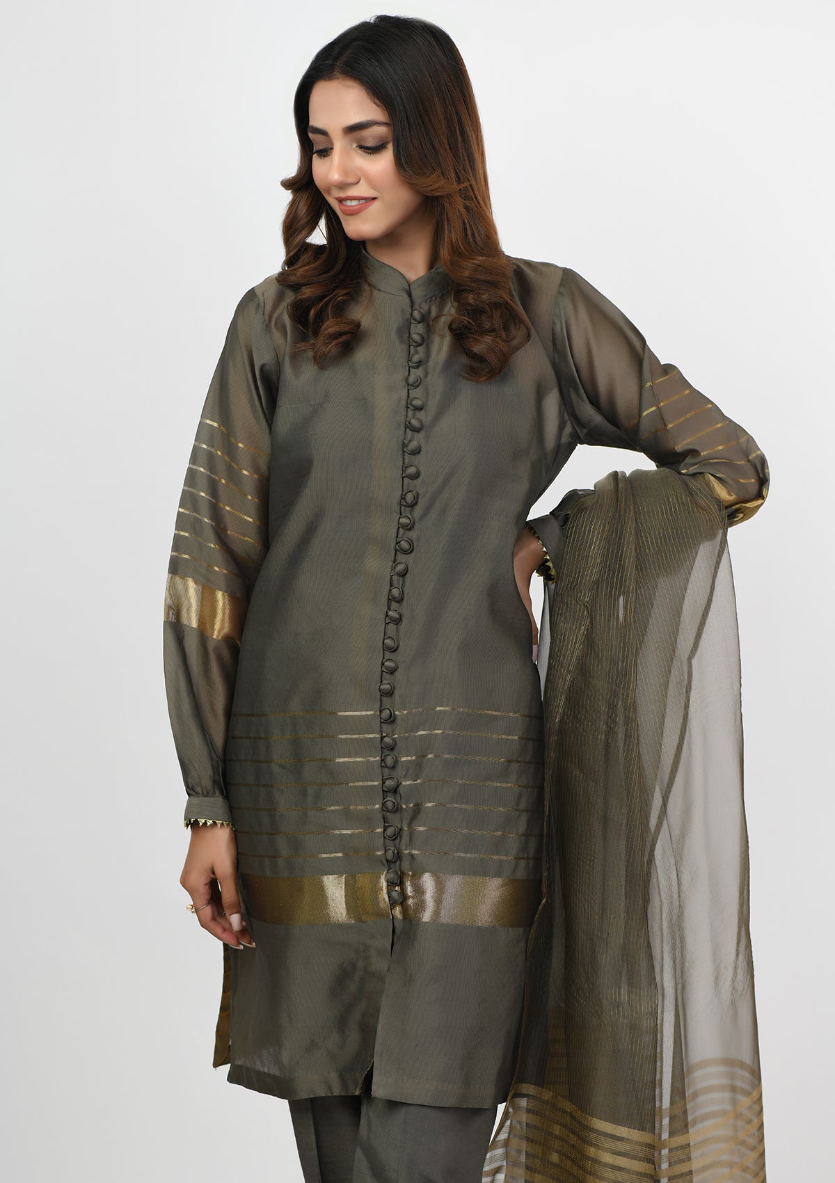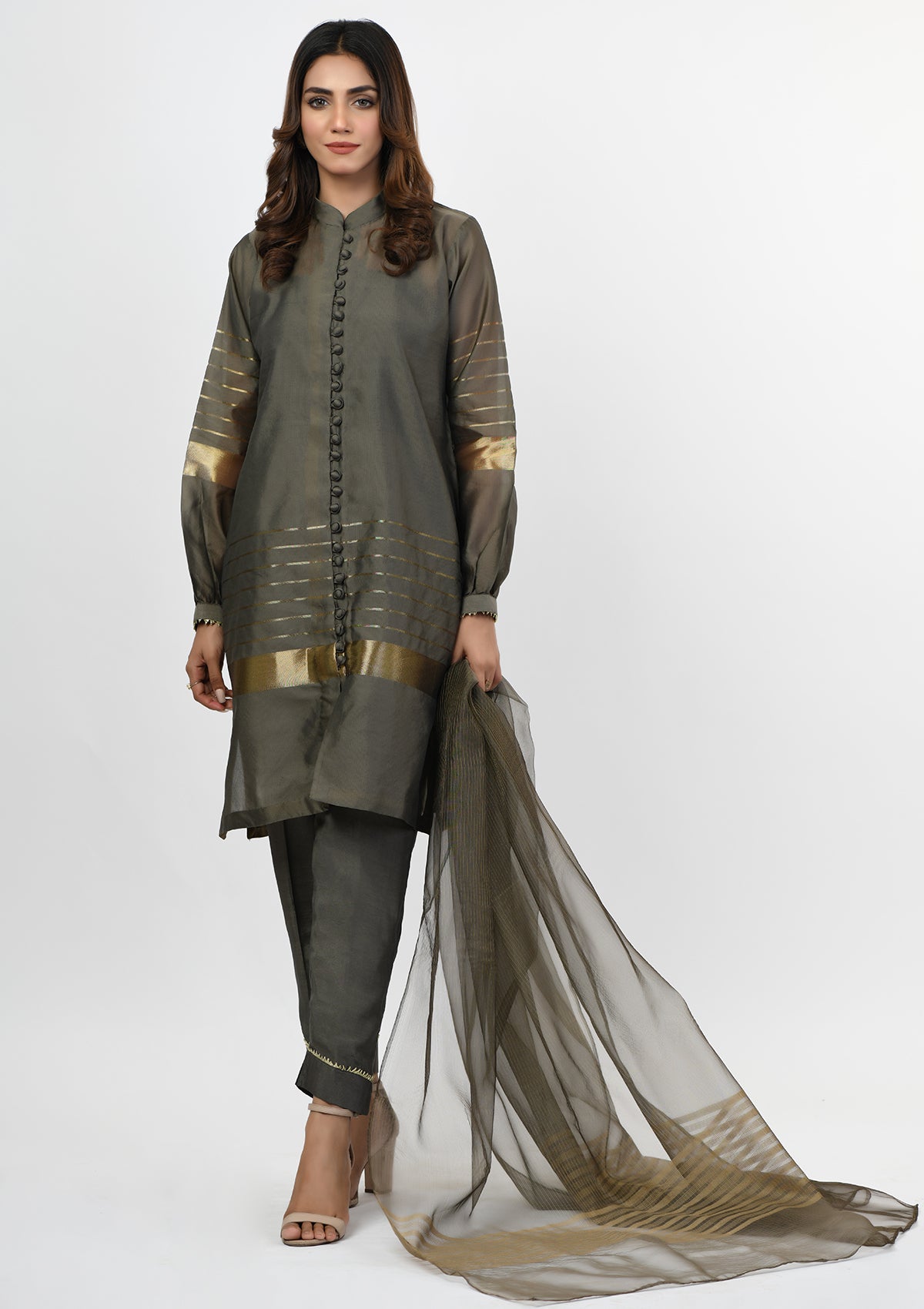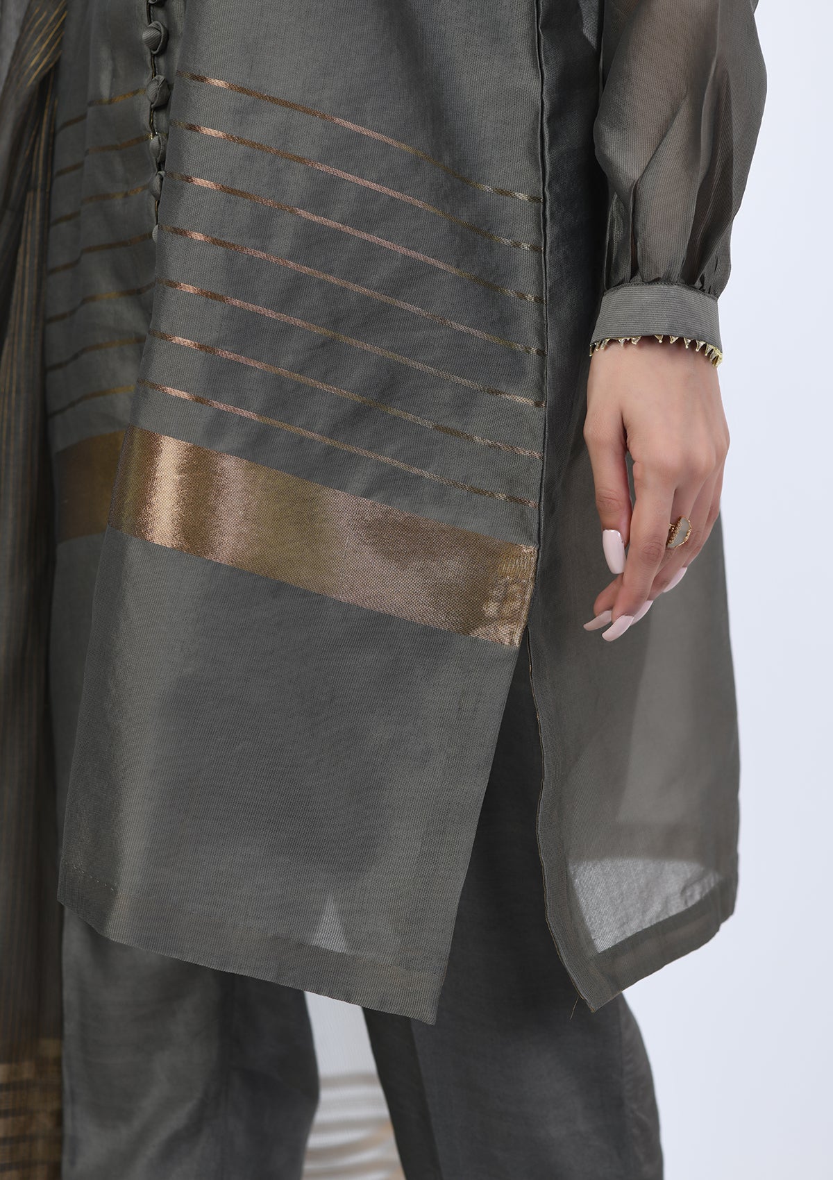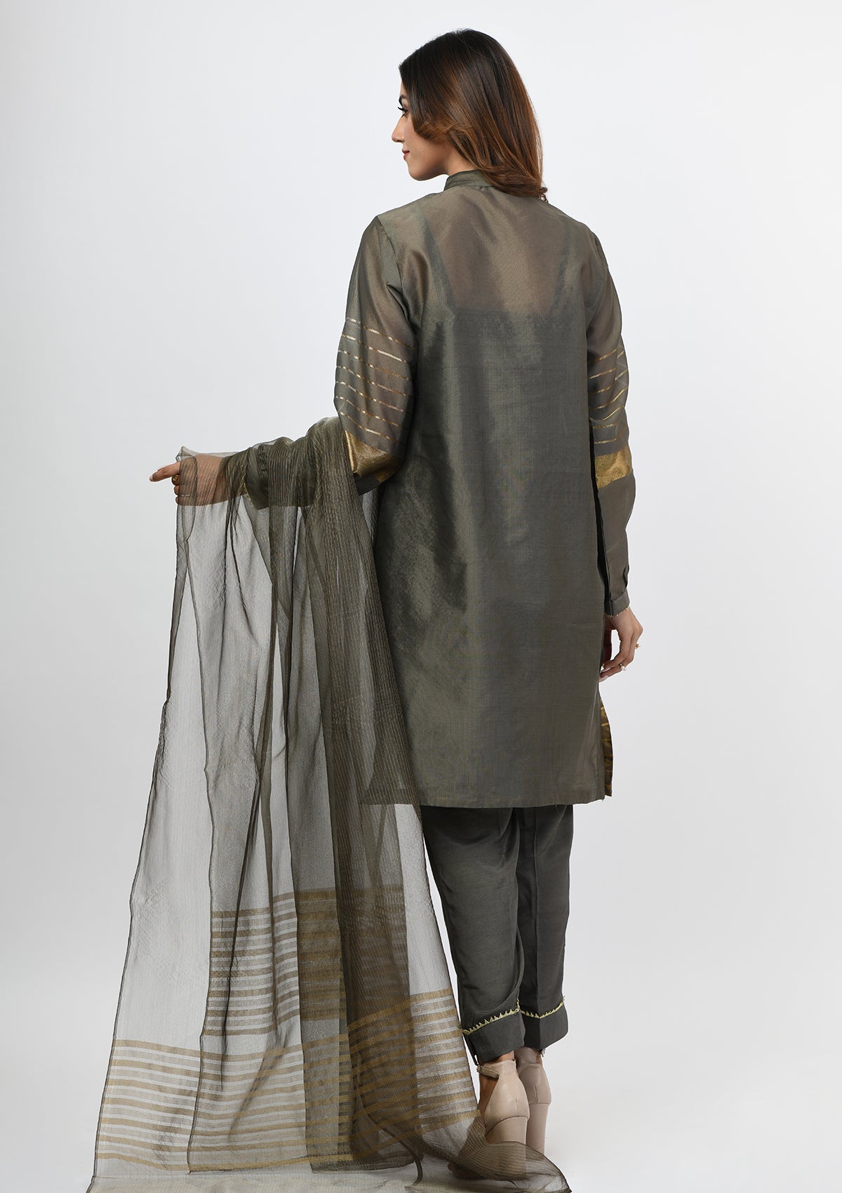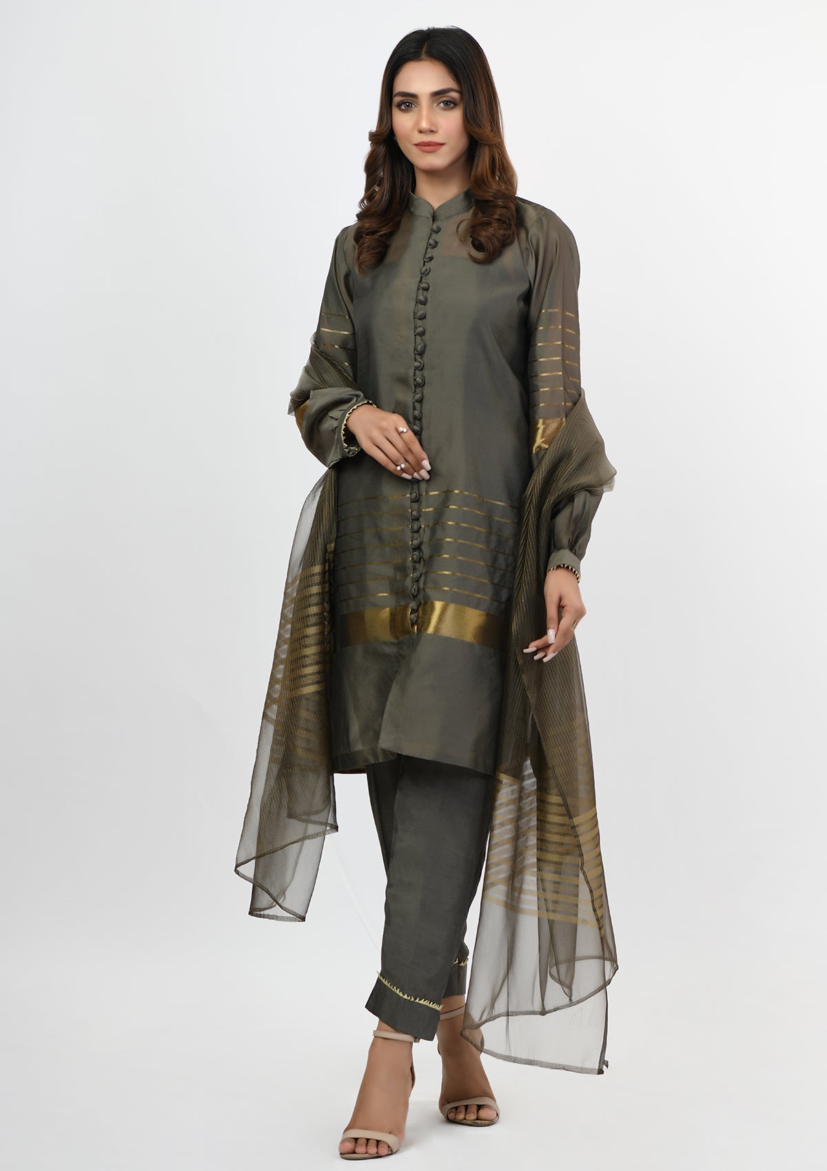 Product Details: A straight silhouette in charcoal grey featuring handmade buttons on the center front and shades of gold throughout. The puff sleeves are enhanced with gota lace detailing on the hem and golden touches on the elbows. The shirt is balanced with matching pants and an organza striped dupatta.