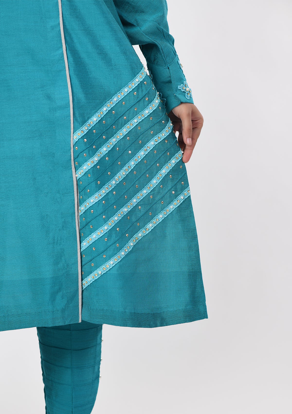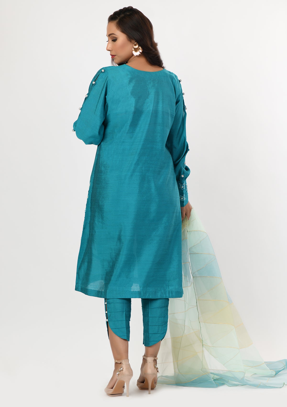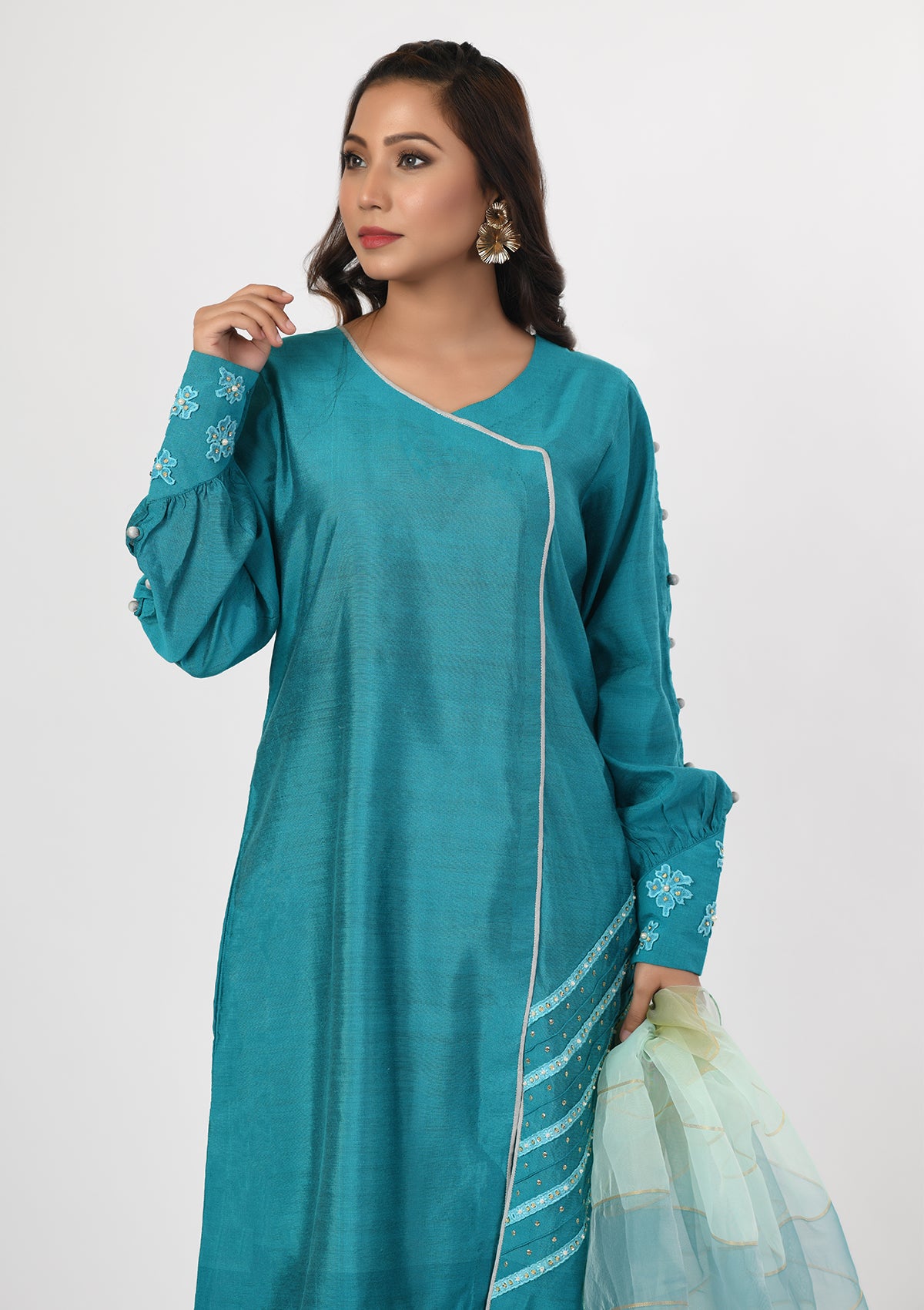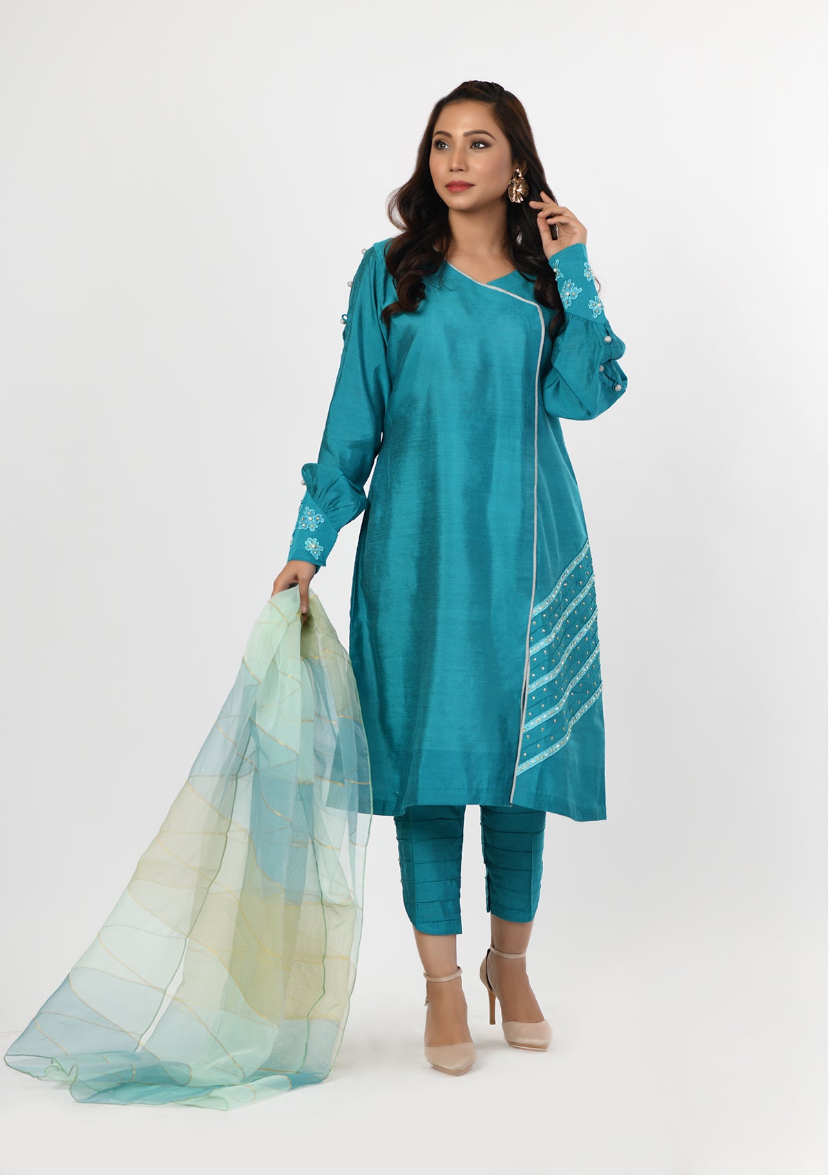 Product Details: Peacock blue cotton silk angrakha style shirt adorned with lace and hand detailing of pearls and sequins. Puff sleeves with center front buttons opening and cuffs adorned with 3D flowers. It is paired with matching cigarette pants allured with pearls detailing. Finish the look with our ombre blue organza dupatta.