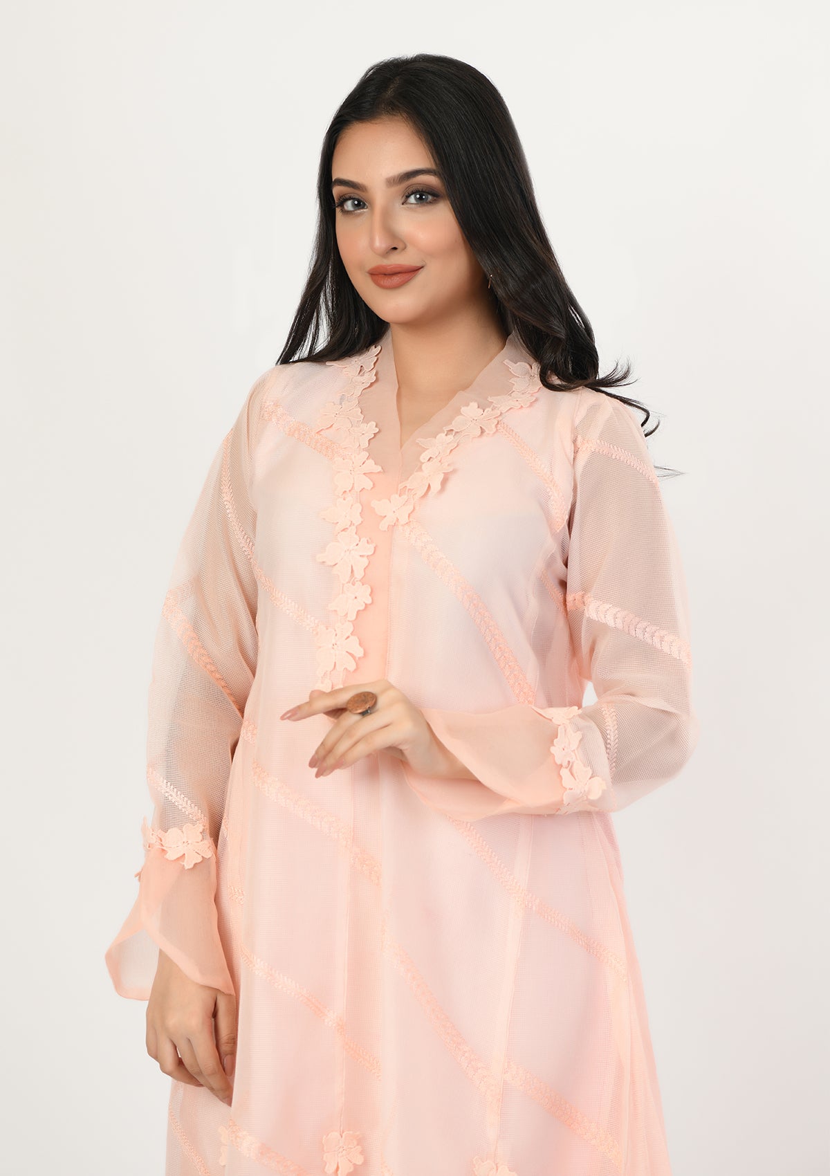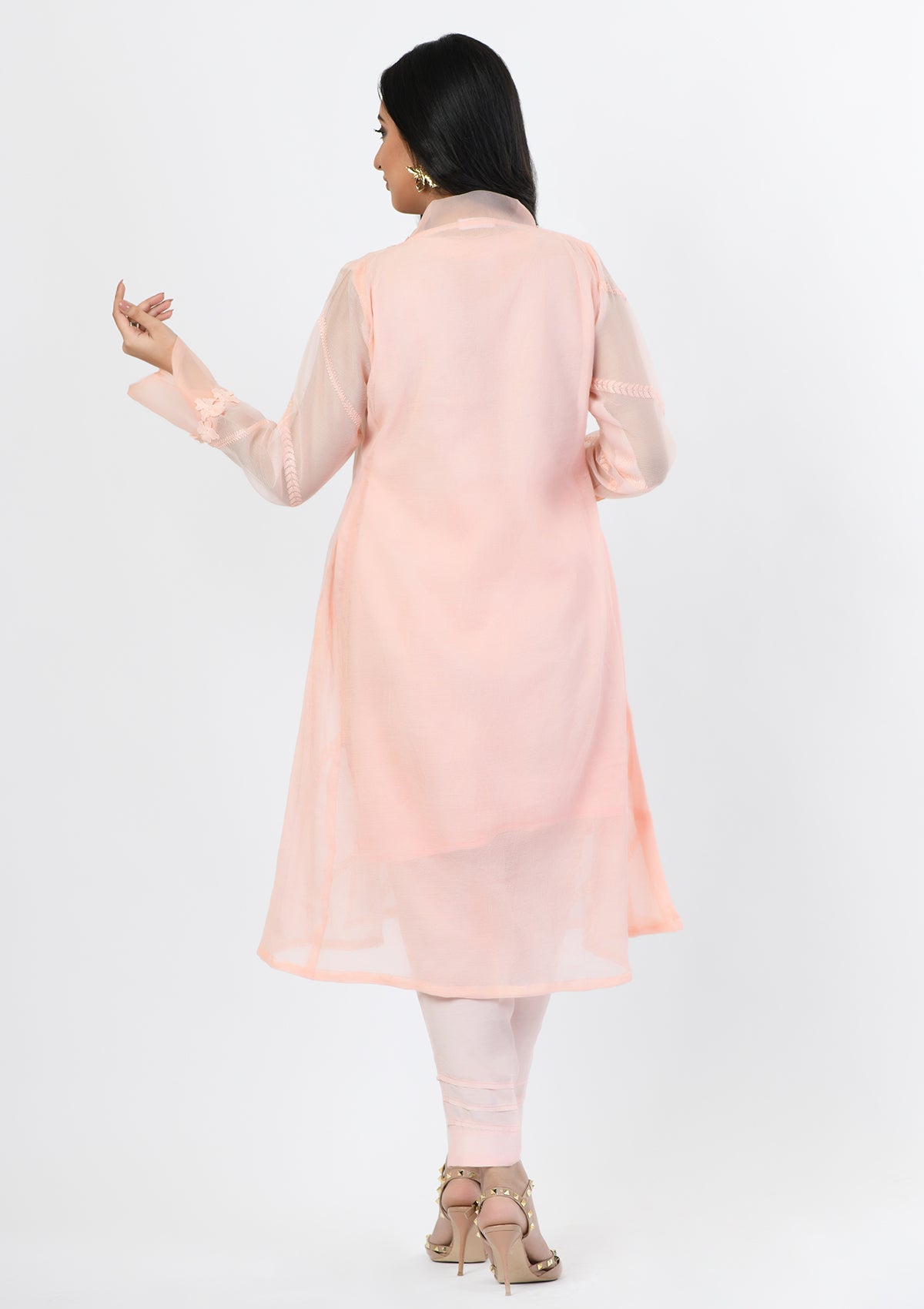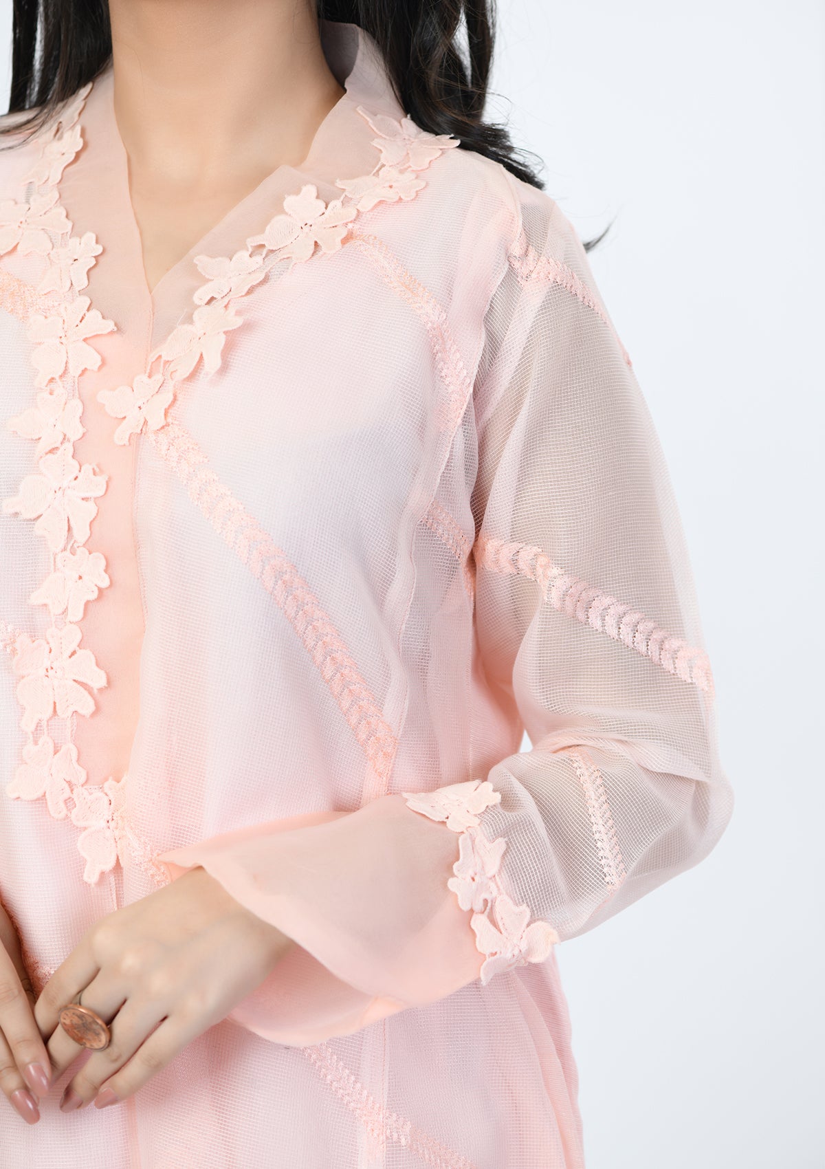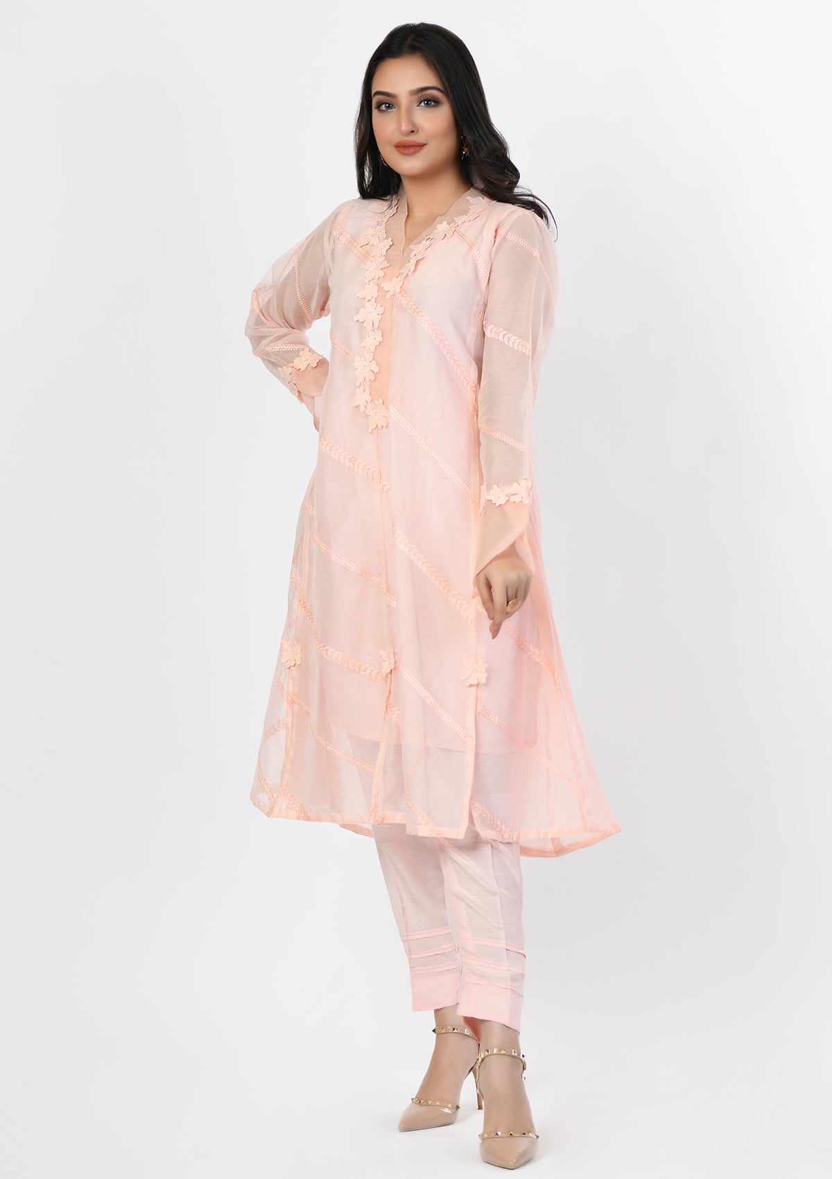 Product Detail: This powder pink A-line embroidered khadi net shirt is uniquely decorated with 3D flowers on a cut hemline. The beautiful neckline is decorated with organza and further enhanced with 3D petals. The sleeves are finished with an overlapping organza border that can be paired with matching pants adjoined with lace on them.