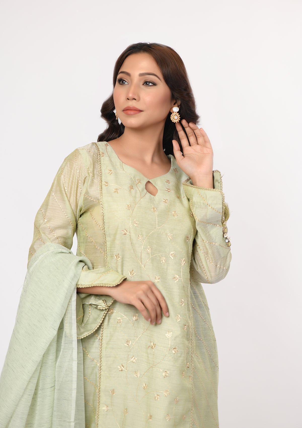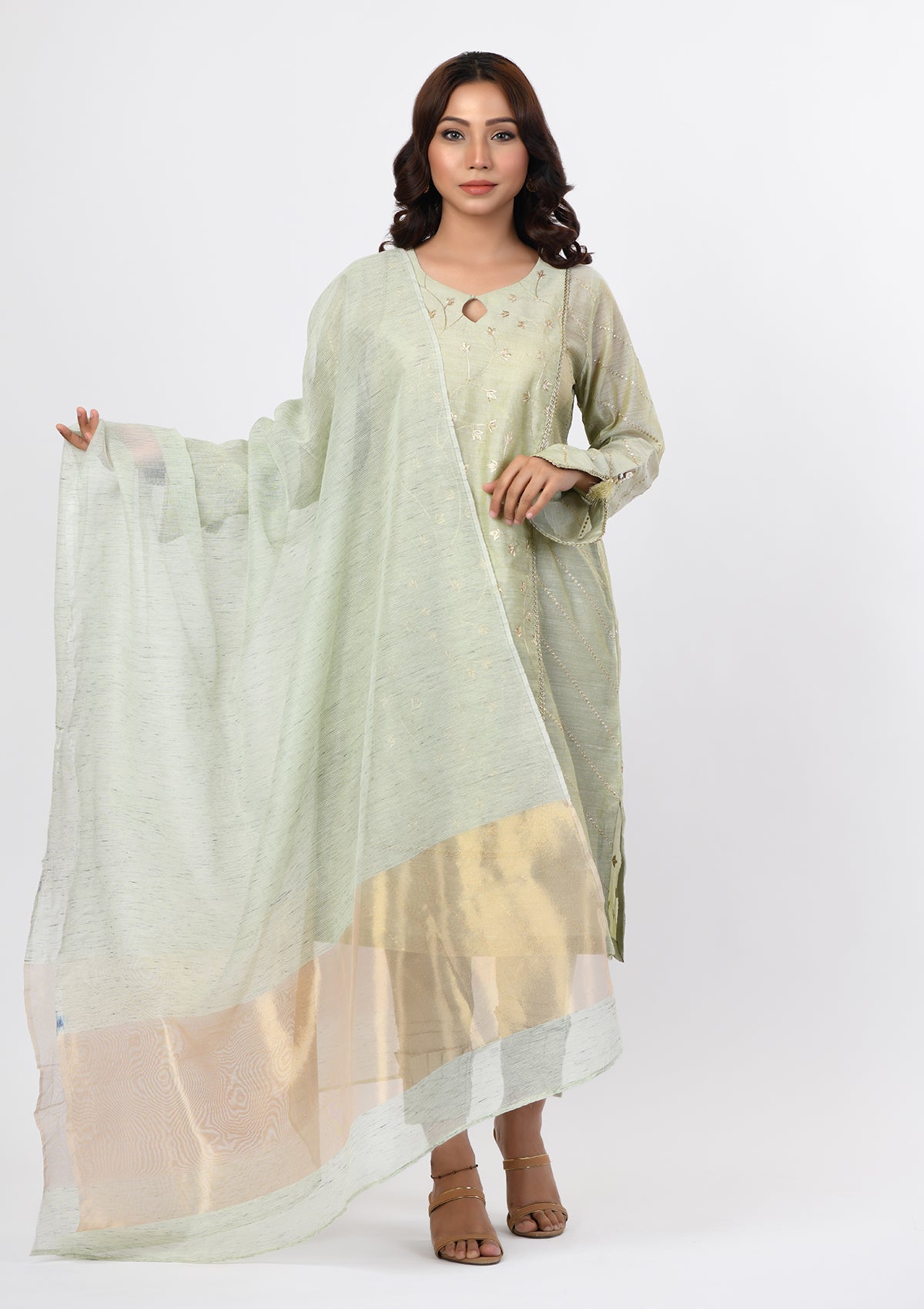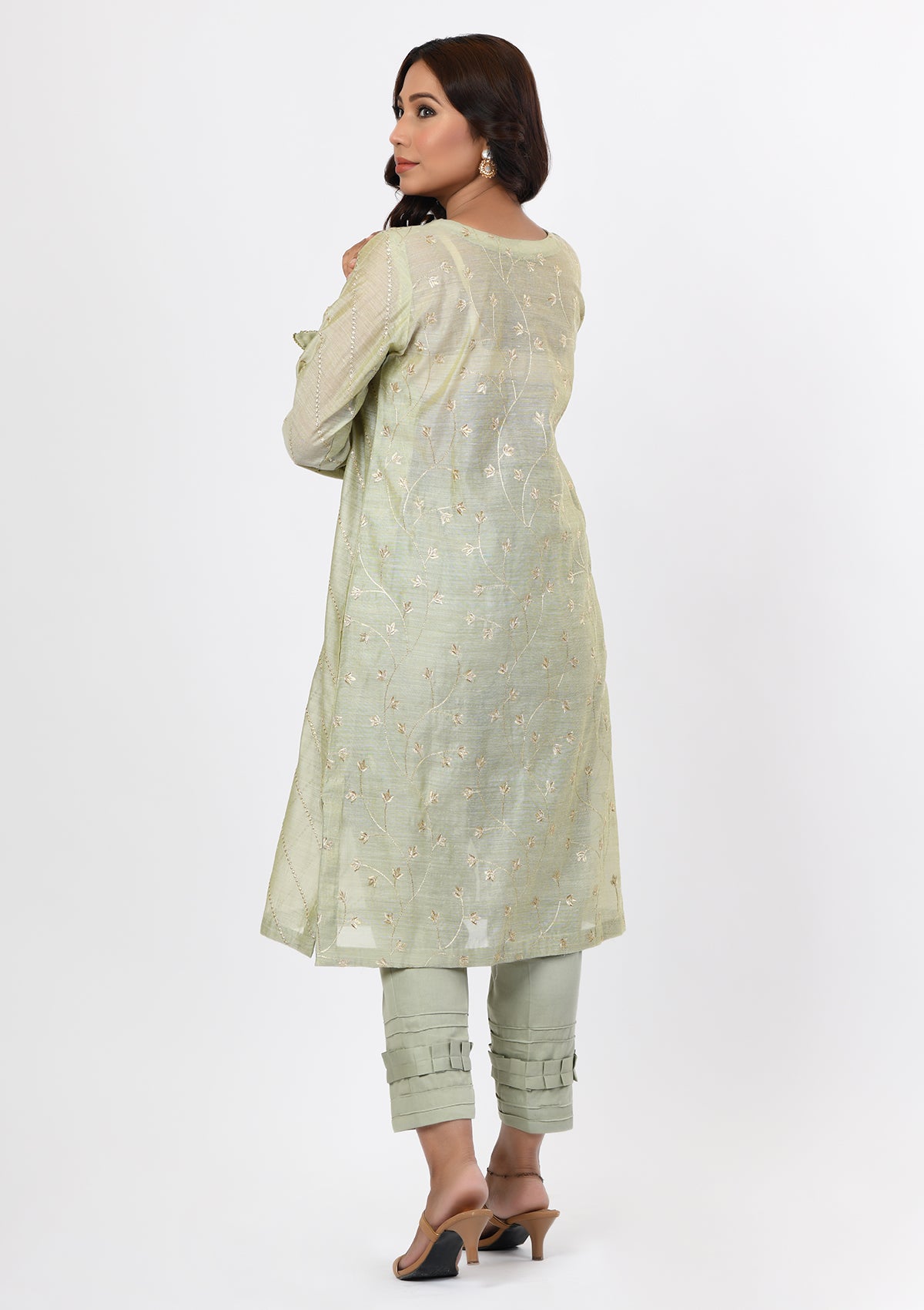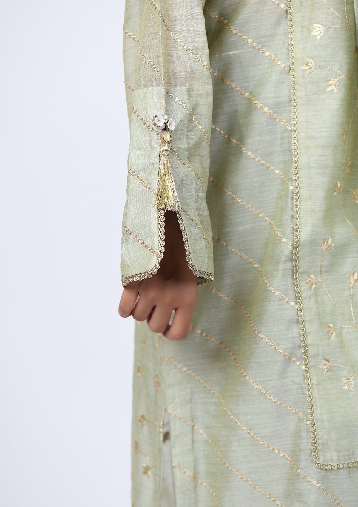 Product Details: Pistachio green khadi cotton shirt with golden embroidered center panel, decorated with gold lace. The sleeves are finished with 3D flower buttons on the slit along with gold tilla fringes. It is paired with matching pants and finished with pleated ruffles.