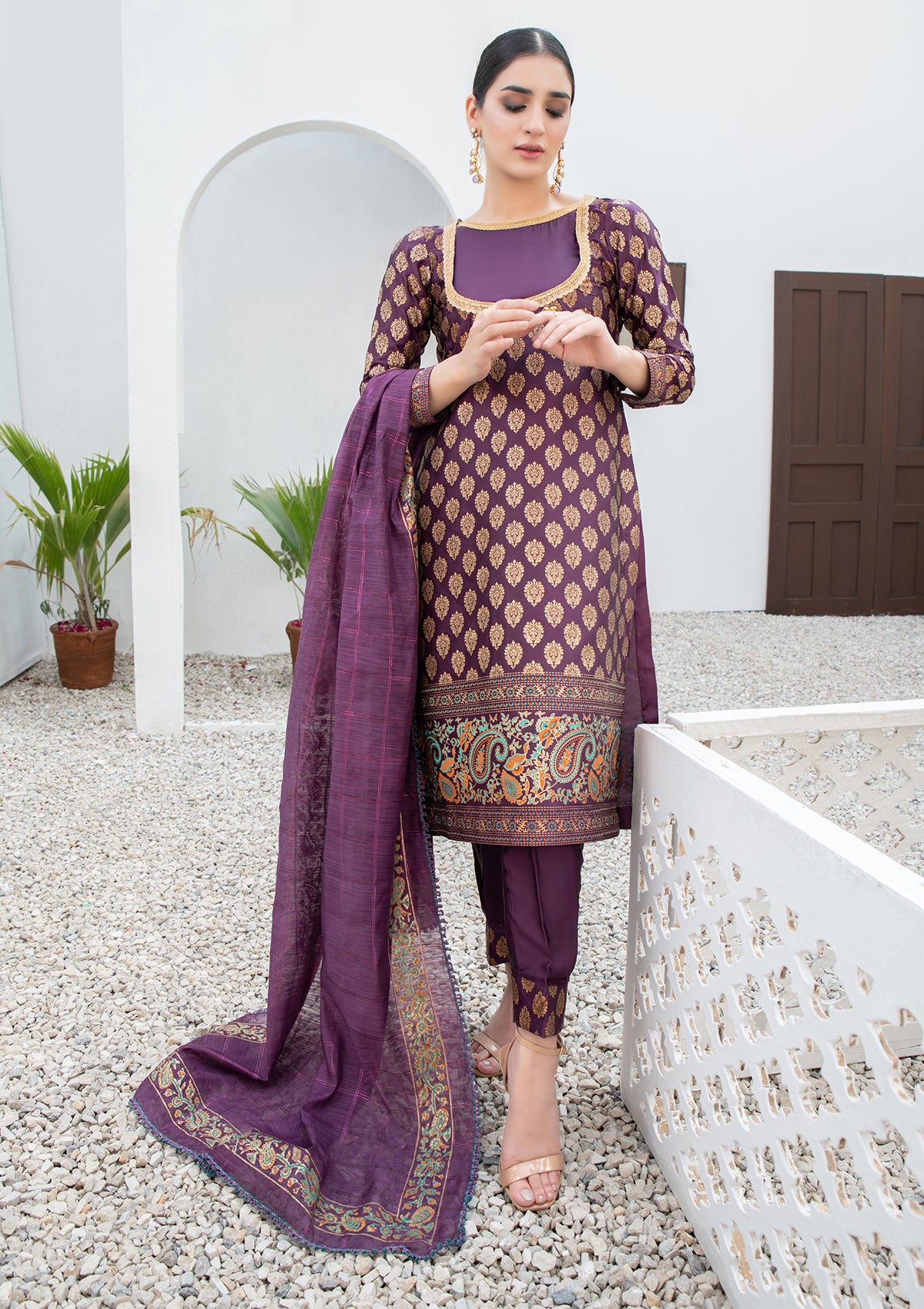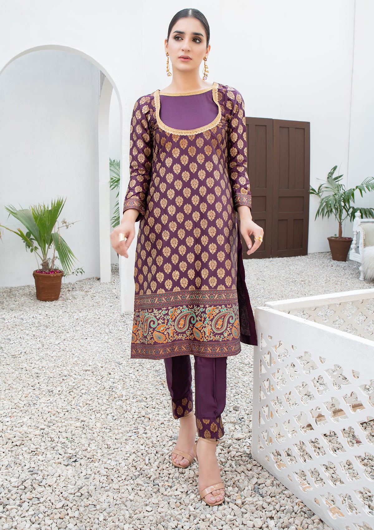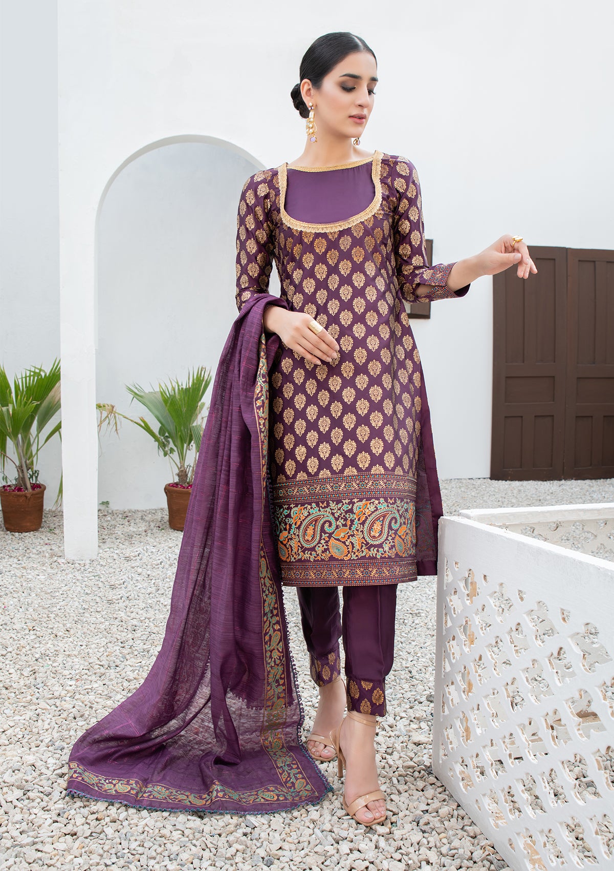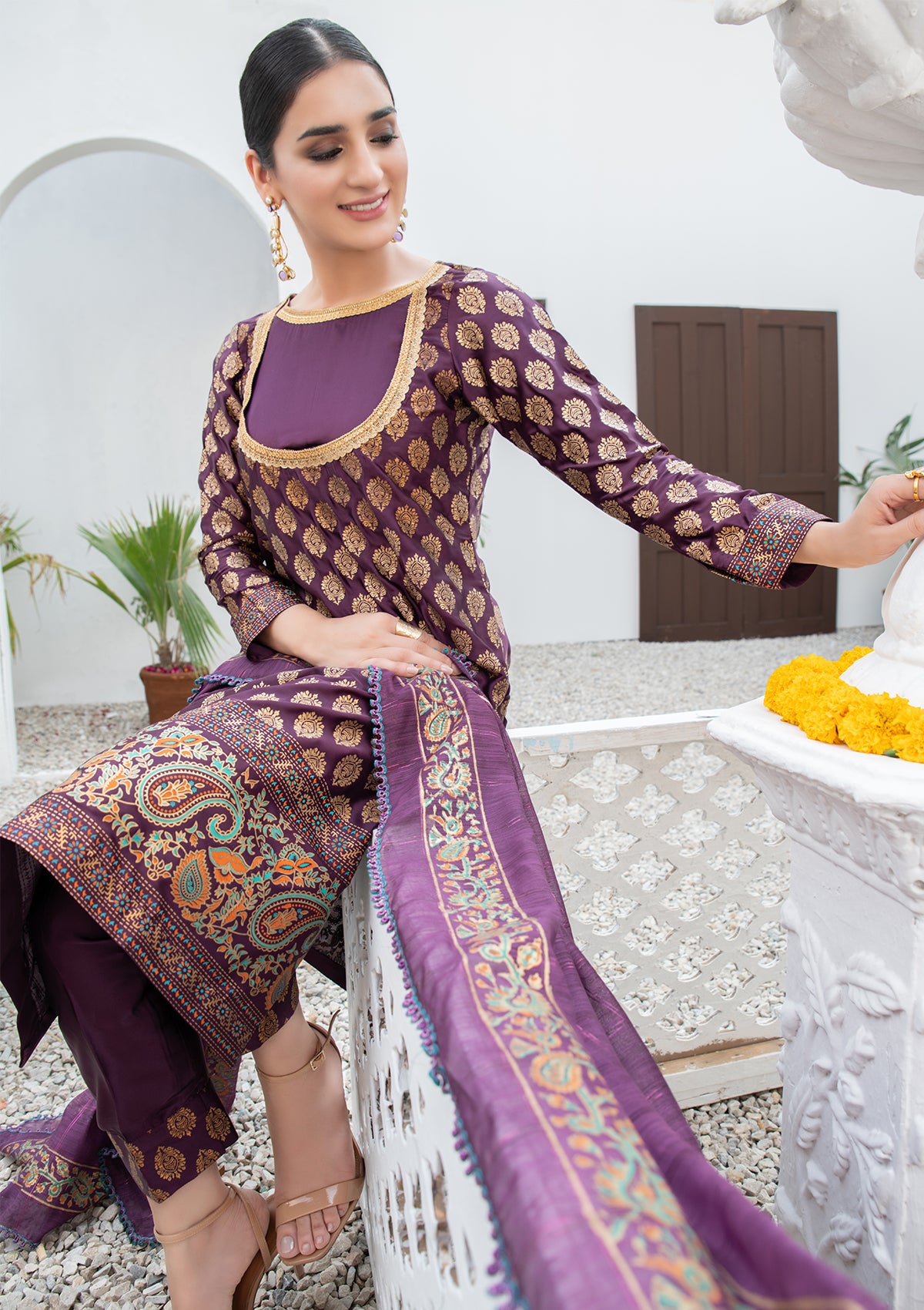 The Purple Winter! The golden block print on the shirt is paired with plain silk straight trousers. The shirt and sleeves hem are decorated with multiple color 3-tone contrasting block print. The trousers are finished with smaller gold block print hems. Pair it with a striped purple organza dupatta with multiple color 3-tone contrasting block print.