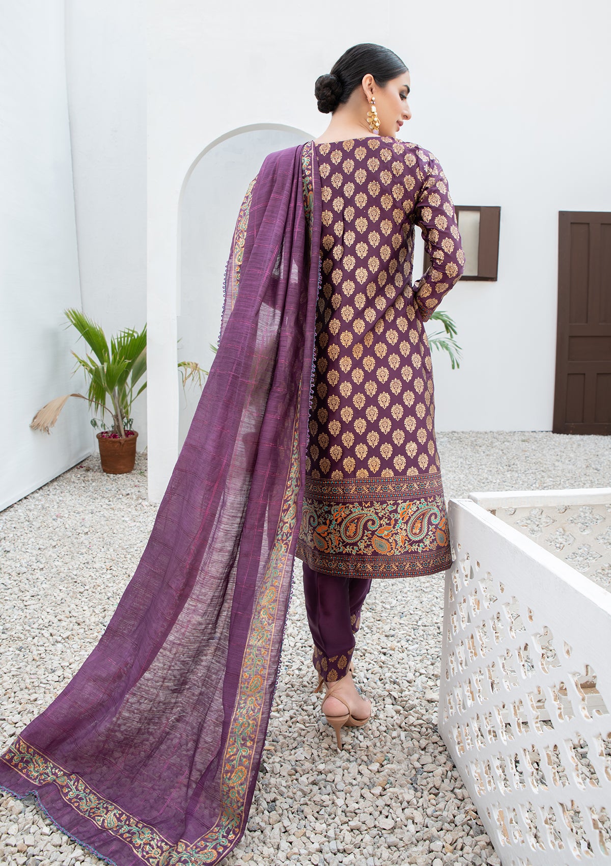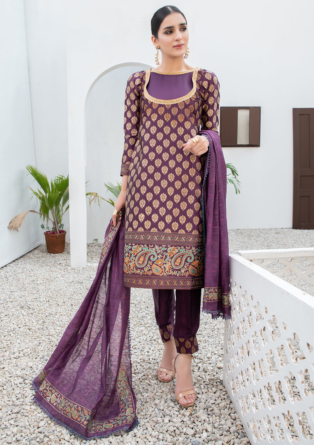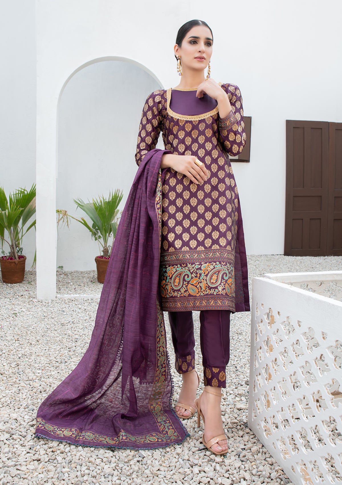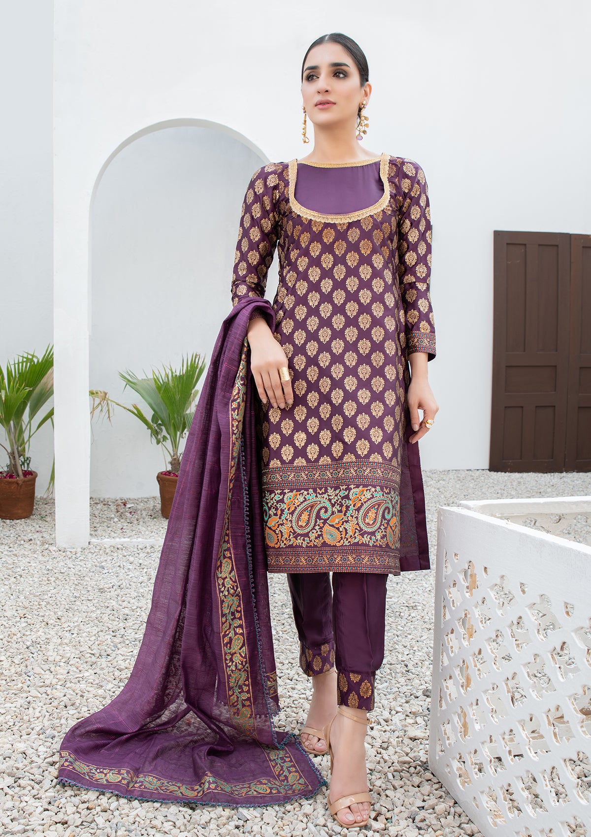 The Purple Winter! The golden block print on the shirt is paired with plain silk straight trousers. The shirt and sleeves hem are decorated with multiple color 3-tone contrasting block print. The trousers are finished with smaller gold block print hems. Pair it with a striped purple organza dupatta with multiple color 3-tone contrasting block print.