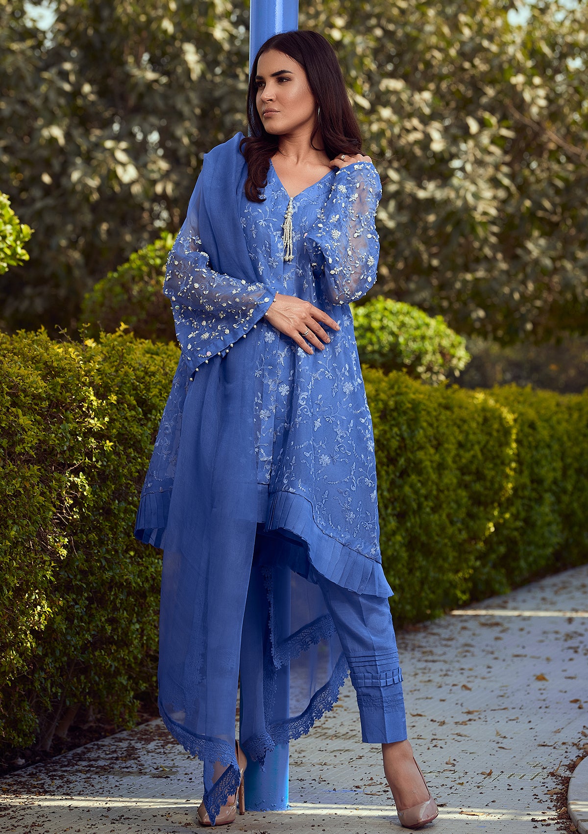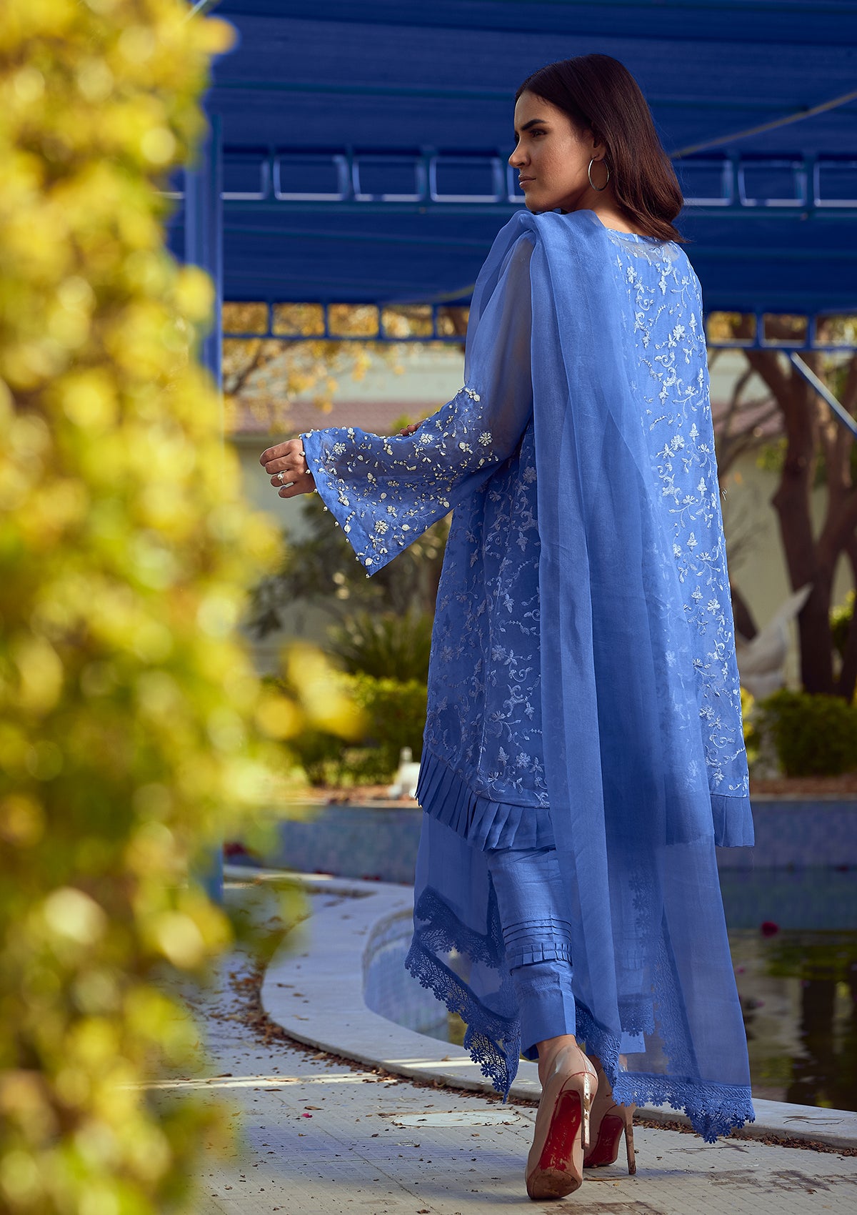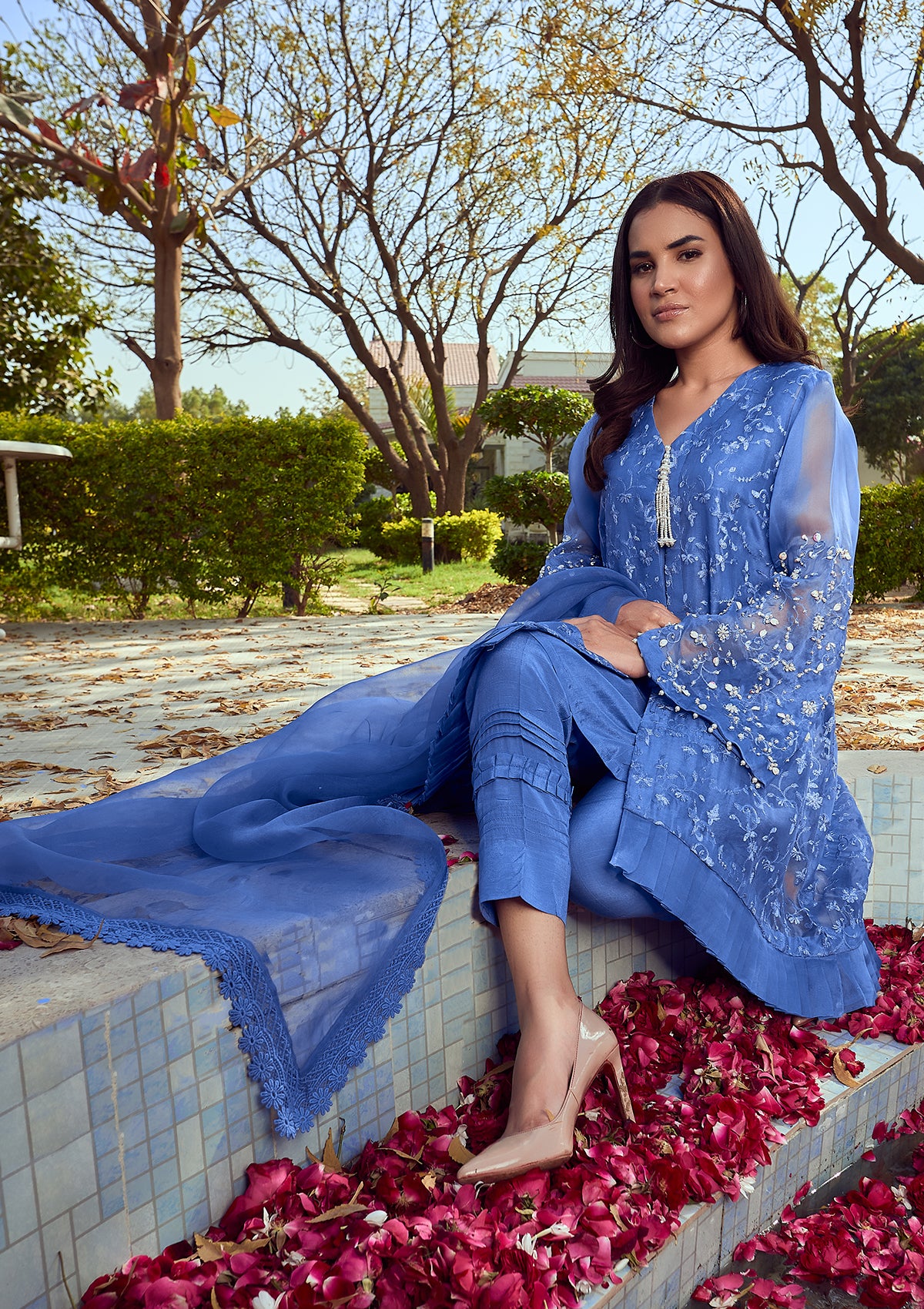 A pleasant and captivating blue signaling positivity and a festive vibe. The elegant organza in steel blue color is a front open high low A-line shirt decorated with pearls, sequins, and stones. The sleeves consist of a bell-shaped pattern with pearls on the hem giving it a voluminous yet refined impression. Combined with raw silk embellished pants and an organza dupatta with lace on all 4 sides making it a must-have addition to your wardrobe