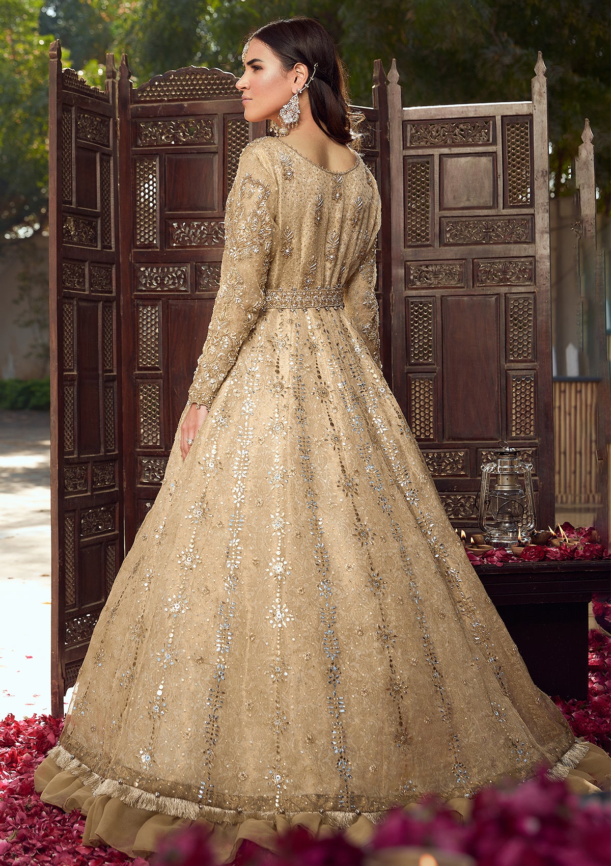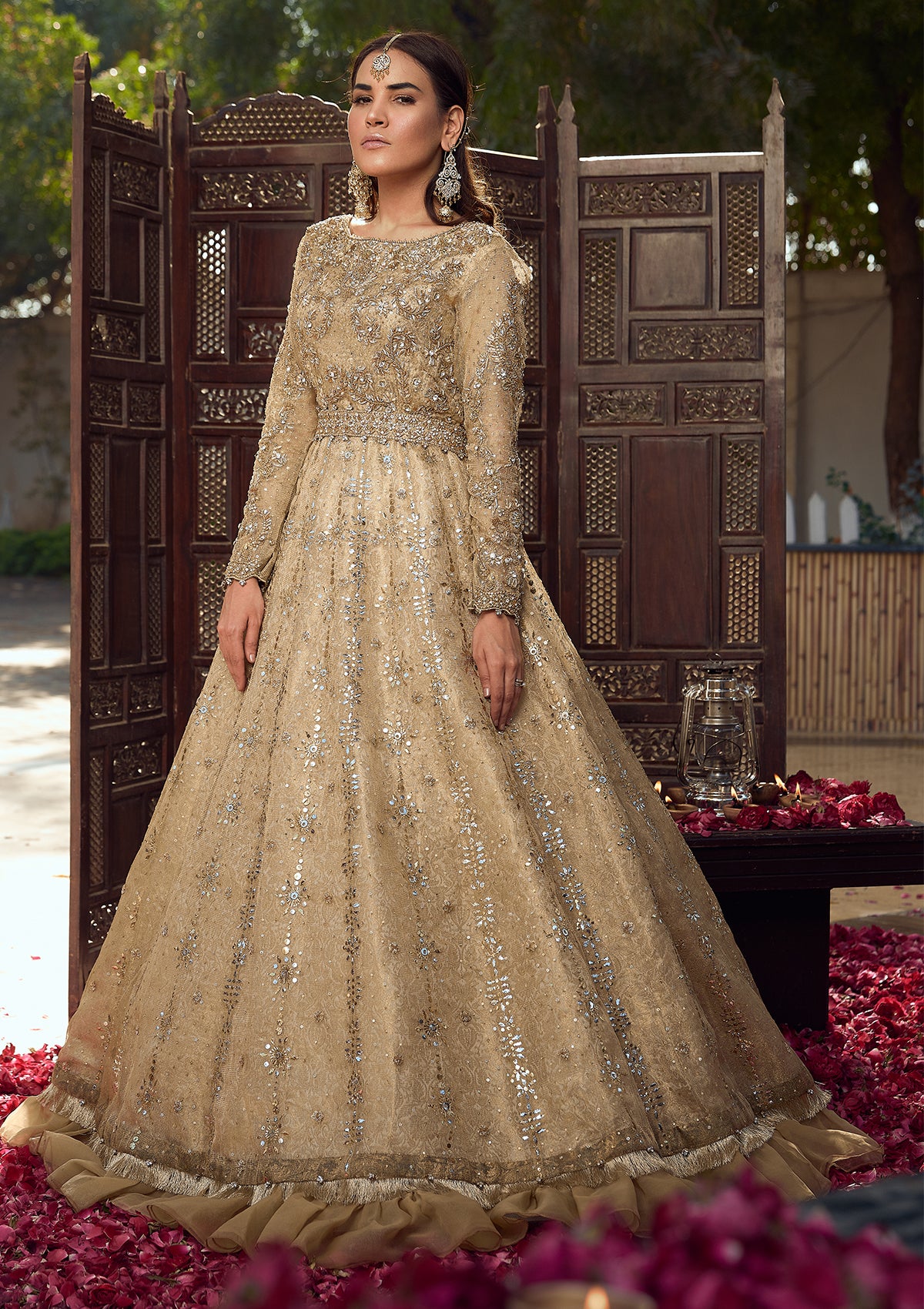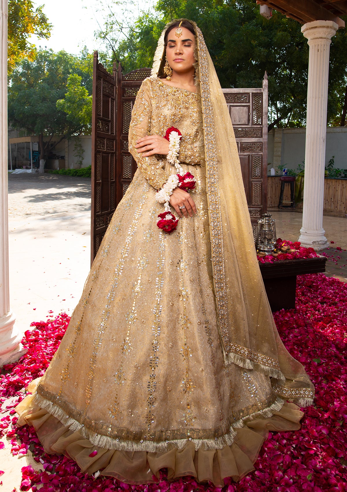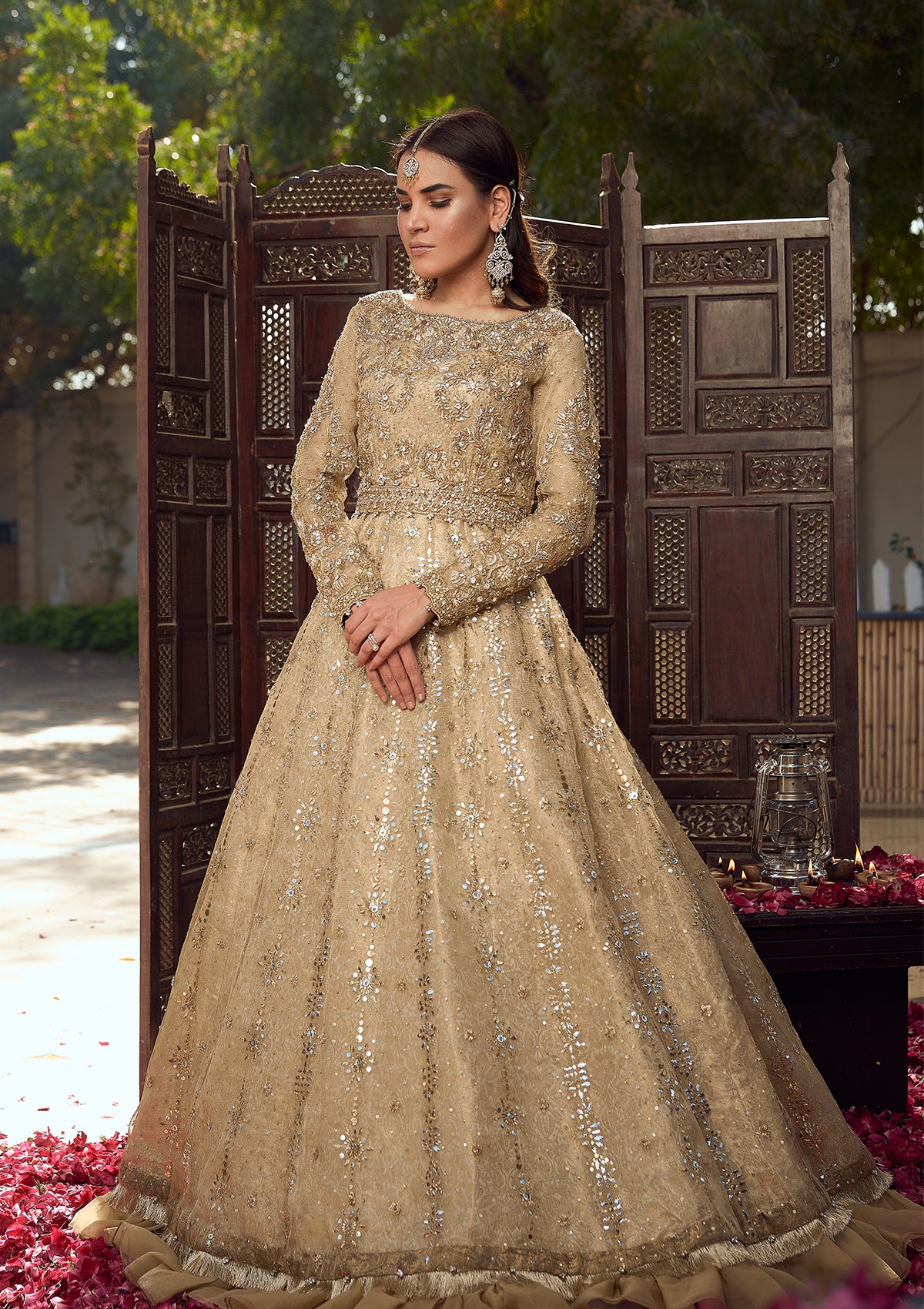 A captivating combination of a modern-day gown, featuring a belt to hold everything together, giving Ziba an ethereal status. The sequins-adorned belt fastens the single-piece gown that is an amalgamation of machine embroidery and handwork. The artistry of kora, dabka, pearl, crystals, kamdani, sequins, and gold zari is a perfect blend of elegance. The ruffles on the hem are lavishly fused with a masoori net dupatta with heavy borders.